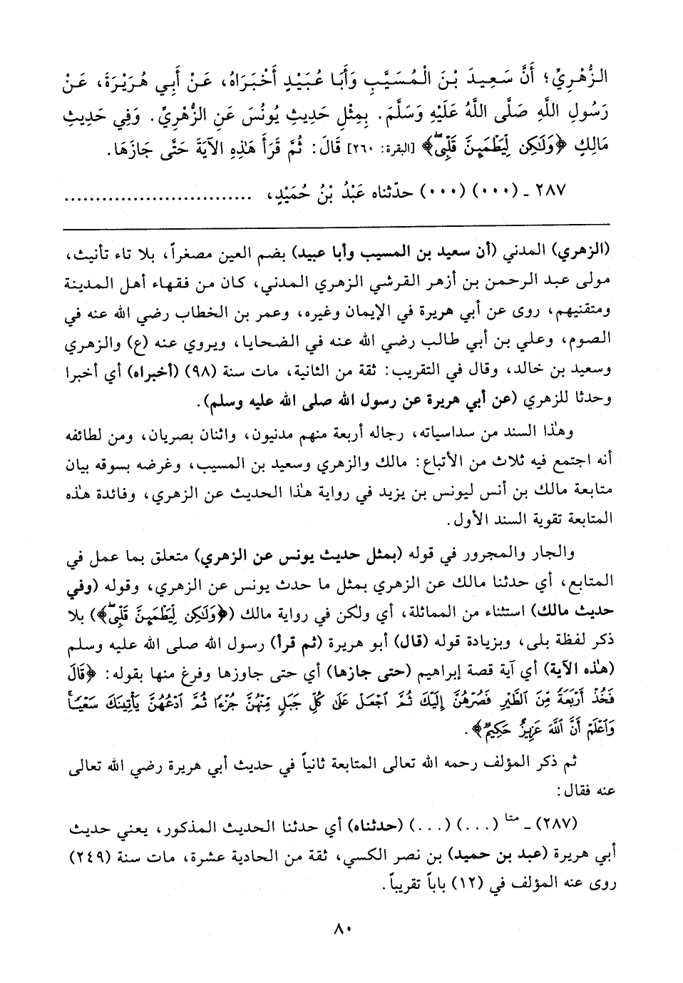 الزُّهْرِيِّ؛ أَنَّ سَعِيدَ بْنَ الْمُسَيَّبِ وَأَبَا عُبَيدٍ أَخْبَرَاهُ، عَنْ أَبِي هُرَيرَةَ، عَنْ رَسُولِ اللهِ صلَّى اللهُ عَلَيهِ وَسلمَ. بِمِثْلِ حَدِيثِ يُونُسَ عَنِ الزُّهْرِيِّ. وَفِي حَدِيثِ مَالِكٍ {وَلَكِنْ لِيَطْمَئِنَّ قَلْبِي} [البقرة: ٢٦٠] قَال: ثُمَّ قَرَأَ هَذِهِ الآيةَ حَتى جَازَهَا.