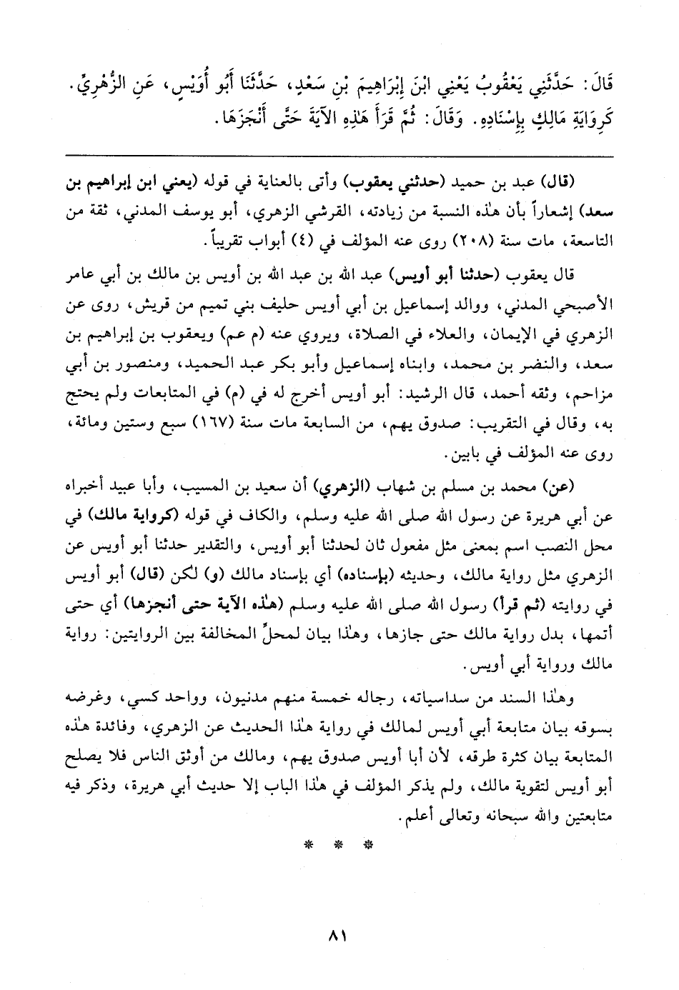 وهذا السند من سداسياته، رجاله خمسة منهم مدنيون، وواحد كسي، وغرضه بسوقه بيان متابعة أبي أويس لمالك في رواية هذا الحديث عن الزُّهْرِيّ، وفائدة هذه المتابعة بيان كثرة طرقه, لأن أَبا أويس صدوق يهم، ومالك من أوثق النَّاس فلا يصلح أبو أويس لتقوية مالك، ولم يذكر المؤلف في هذا الباب إلَّا حديث أبي هريرة، وذكر فيه متابعتين والله سبحانه وتعالى أعلم.