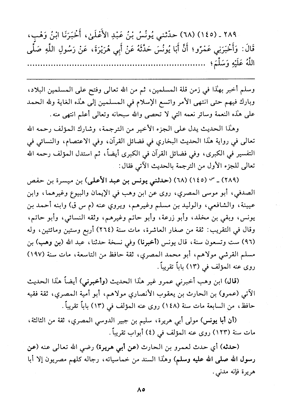 (٢٨٩) - س (١٤٥) (٦٨) (حَدَّثني يونس بن عبد الأعلى) بن ميسرة بن حفص الصدفي، أبو موسى المصري، روى عن ابن وهب في الإيمان والبيوع وغيرهما، وابن عيينة، والشافعي، والوليد بن مسلم وغيرهم، ويروي عنه (م س ق) وابنه أَحْمد بن يونس، وبقي بن مخلد، وأبو زرعة، وأبو حاتم وغيرهم، وثقه النَّسائيّ، وأبو حاتم، وقال في التقريب: ثِقَة من صغار العاشرة، مات سنة (٢٦٤) أربع وستين ومائتين، وله (٩٦) ست وتسعون سنة، قال يونس (أخبرنا) وفي نسخة حَدَّثَنَا، عبد الله (بن وهب) بن مسلم القُرشيّ مولاهم، أبو محمَّد المصري، ثِقَة حافظ من التاسعة، مات سنة (١٩٧) روى عنه المؤلف في (١٣) بابًا تقريبًا.