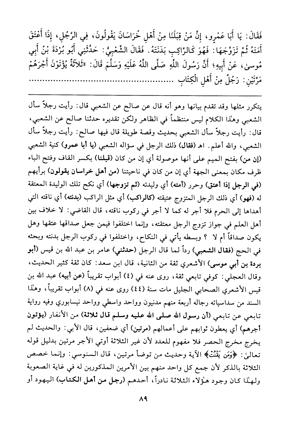 فَقَال: يَا أَبَا عَمْرٍو، إِنَّ مَنْ قِبَلَنَا مِنْ أَهْلِ خُرَاسَانَ يَقُولُونَ، في الرّجُلِ، إِذَا أَعْتَقَ أَمَتَهُ ثُمّ تَزَوَّجَهَا: فَهُوَ كَالرَّاكِبِ بَدَنَتَهُ. فَقَال الشَّعْبِيُّ: حَدَّثَنِي أَبُو بُرْدَةَ بْنُ أَبِي مُوسى، عَنْ أَبِيهِ؛ أَن رَسُولَ اللهِ صلى الله عَلَيهِ وَسلمَ قَال: "ثَلاثَةٌ يُؤْتَوْنَ أَجْرَهُمْ مَرَّتَينِ: رَجُلٌ مِنْ أَهْلِ الْكِتَابِ