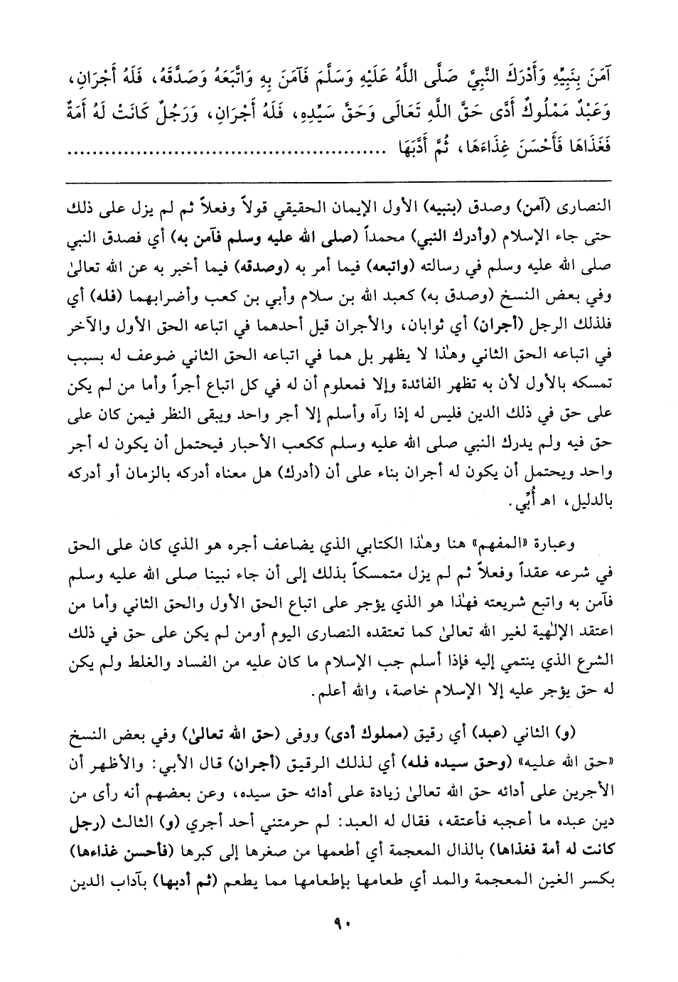آمَنَ بِنَبِيِّهِ وَأَدْرَكَ النَّبِيّ صلى الله عَلَيهِ وَسلمَ فَآمَنَ بِهِ وَاتَّبَعَهُ وَصَدَّقَهُ، فَلَهُ أَجْرَانِ، وَعَبْدٌ مَمْلُوكٌ أَدَّى حَقَّ الله تَعَالى وَحَقَّ سَيِّدِهِ، فَلَهُ أَجْرَانِ، وَرَجُلٌ كَانَتْ لَهُ أَمَةٌ فَغَذَاهَا فَأَحْسَنَ غِذَاءَهَا، ثُمَّ أَدَّبَهَا