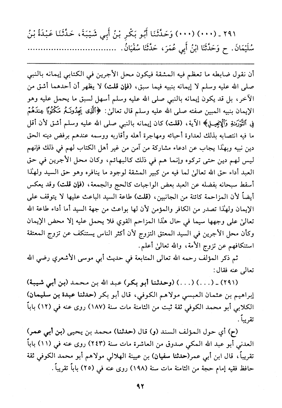 (٢٩١) - (٠٠) (٠٠) (وحدثنا أبو بكر) عبد الله بن محمَّد (بن أبي شيبة) إبراهيم بن عثمان العبسي مولاهم الكُوفيّ، قال أبو بكر (حَدَّثَنَا عبدة بن سليمان) الكلابي أبو محمَّد الكُوفيّ ثِقَة ثبت من الثامنة مات سنة (١٨٧) روى عنه في (١٢) بابا تقريبًا.