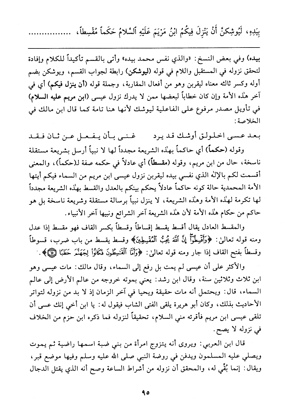 وقوله (حكمًا) أي حاكمًا بهذه الشريعة مجددًا لها لا نبيًّا أرسل بشريعة مستقلة ناسخة، حال من ابن مريم، وقوله (مقسطًا) أي عادلًا في حكمه صفة لـ (حكمًا)، والمعنى أقسمت لكم بالإله الذي نفسي بيده ليقربن نزول عيسى ابن مريم من السماء فيكم أيتها الأمة المحمدية حالة كونه حاكمًا عادلًا يحكم بينكم بالعدل والقسط بهذه الشريعة مجددًا لها تكرمة لهذه الأمة وهذه الشريعة، لا ينزل نبيًّا برسالة مستقلة وشريعة ناسخة بل هو حاكم من حكام هذه الأمة لأن هذه الشريعة آخر الشرائع ونبيها آخر الأنبياء.