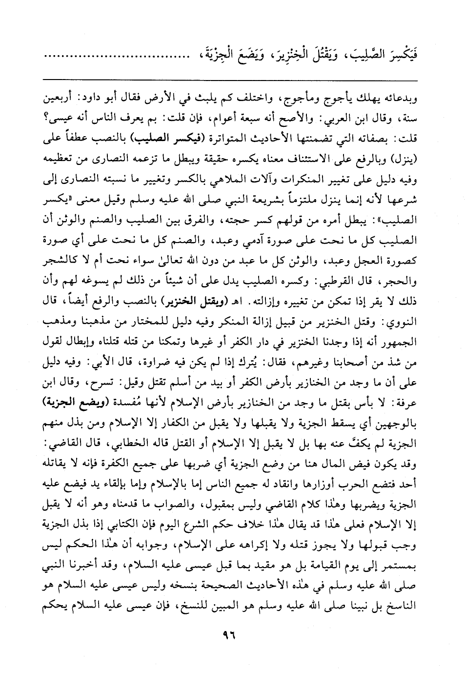 فَيَكْسِرَ الصَّلِيبَ، وَيَقْتُلَ الْخِنْزِيرَ، وَيضَعَ الْجِزْيَةَ،