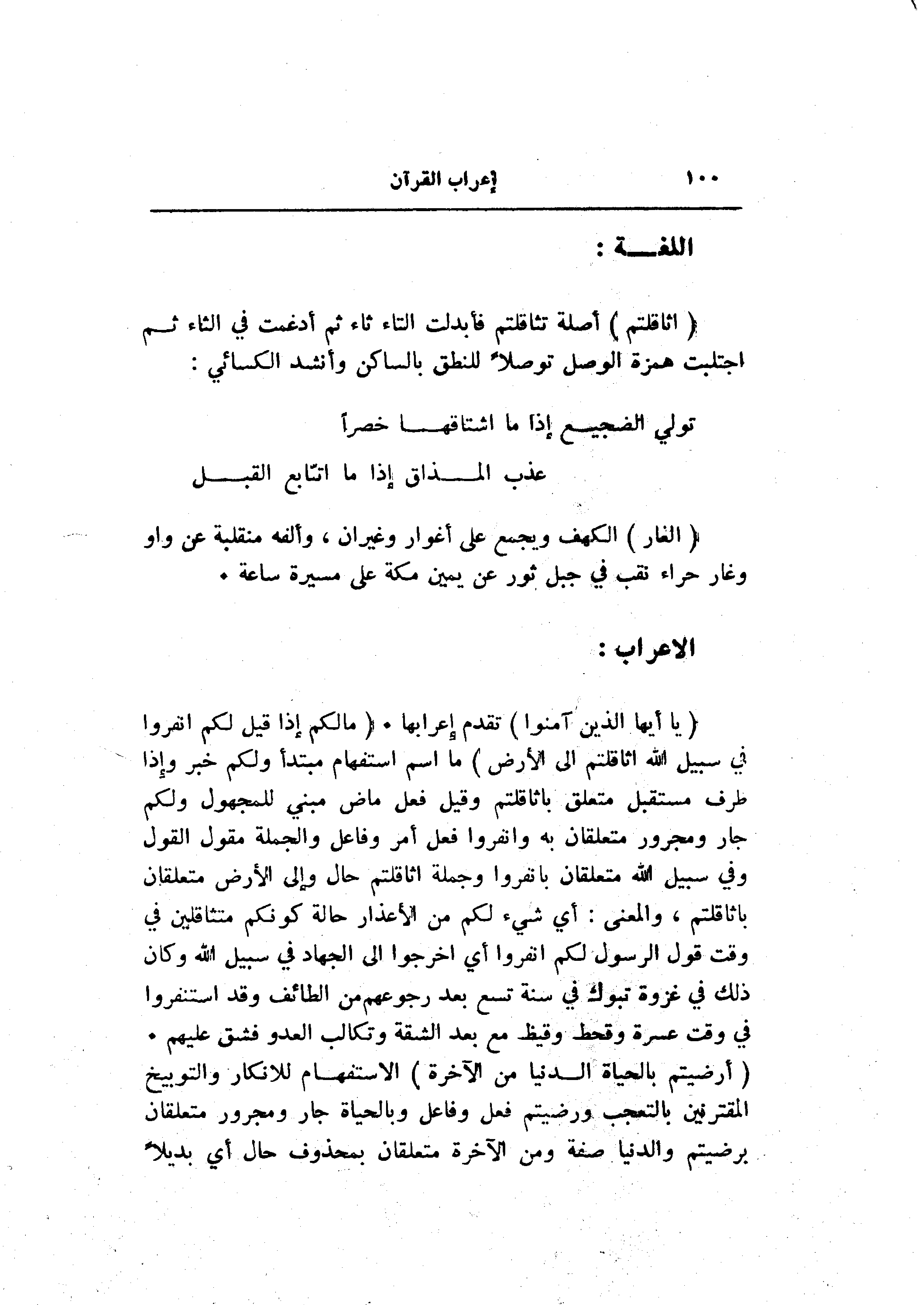 (اثَّاقَلْتُمْ) أصله تثاقلتم فأبدلت التاء ثاء ثم أدغمت في الثاء ثم اجتلبت همزة الوصل توصلا للنطق بالساكن وأنشد الكسائي:
