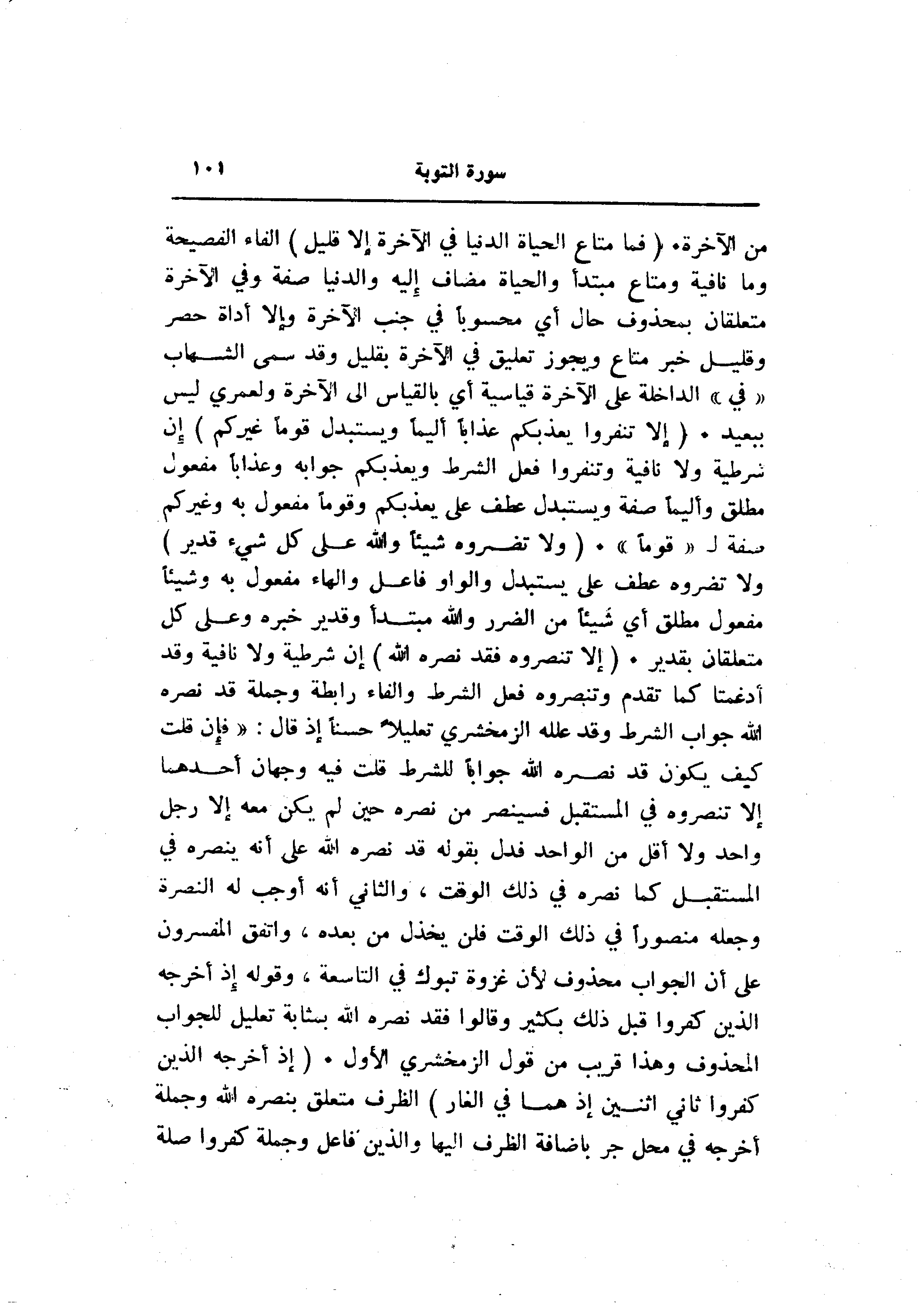 من الآخرة. (فَما مَتاعُ الْحَياةِ الدُّنْيا فِي الْآخِرَةِ إِلَّا قَلِيلٌ) الفاء الفصيحة وما نافية ومتاع مبتدأ والحياة مضاف إليه والدنيا صفة وفي الآخرة متعلقان بمحذوف حال أي محسوبا في جنب الآخرة وإلا أداة حصر وقليل خبر متاع ويجوز تعليق في الآخرة بقليل وقد سمى الشهاب «في» الداخلة على الآخرة قياسية أي بالقياس الى الآخرة ولعمري ليس ببعيد. (إِلَّا تَنْفِرُوا يُعَذِّبْكُمْ عَذاباً أَلِيماً وَيَسْتَبْدِلْ قَوْماً غَيْرَكُمْ) إن شرطية ولا نافية وتنفروا فعل الشرط ويعذبكم جوابه وعذابا مفعول مطلق وأليما صفة ويستبدل عطف على يعذبكم وقوما مفعول به وغيركم صفة ل «قوما» . (وَلا تَضُرُّوهُ شَيْئاً وَاللَّهُ عَلى كُلِّ شَيْءٍ قَدِيرٌ) ولا تضروه عطف على يستبدل والواو فاعل والهاء مفعول به وشيئا مفعول مطلق أي شيئا من الضرر والله مبتدأ وقدير خبره وعلى كل متعلقان بقدير. (إِلَّا تَنْصُرُوهُ فَقَدْ نَصَرَهُ اللَّهُ) إن شرطية ولا نافية وقد أدغمتا كما تقدم وتنصروه فعل الشرط والفاء رابطة وجملة قد نصره الله جواب الشرط وقد علله الزمخشري تعليلا حسنا إذ قال: «فإن قلت كيف يكون قد نصره الله جوابا للشرط قلت فيه وجهان أحدهما إلا تنصروه في المستقبل فسينصر من نصره حين لم يكن معه إلا رجل واحد ولا أقل من الواحد فدل بقوله قد نصره الله على أنه ينصره في المستقبل كما نصره في ذلك الوقت، والثاني أنه أوجب له النصرة وجعله منصورا في ذلك الوقت فلن يخذل من بعده، واتفق المفسرون على أن الجواب محذوف لأن غزوة تبوك في التاسعة، وقوله إذ أخرجه الذين كفروا قبل ذلك بكثير وقالوا فقد نصره الله بمثابة تعليل للجواب المحذوف وهذا قريب من قول الزمخشري الأول. (إِذْ أَخْرَجَهُ الَّذِينَ كَفَرُوا ثانِيَ اثْنَيْنِ إِذْ هُما فِي الْغارِ) الظرف متعلق بنصره الله وجملة أخرجه في محل جر باضافة الظرف إليها والذين فاعل وجملة كفروا صلة