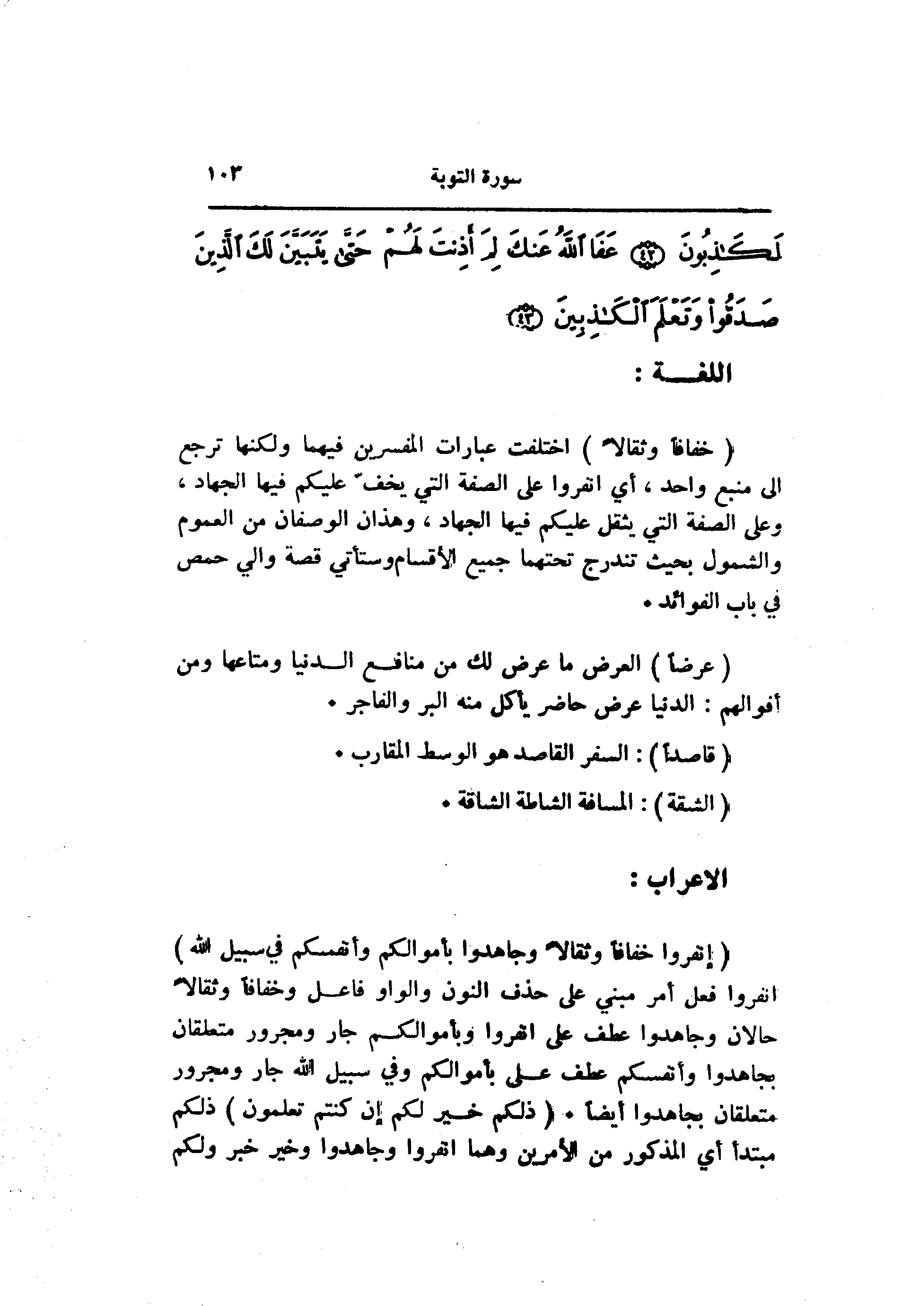 (انْفِرُوا خِفافاً وَثِقالًا وَجاهِدُوا بِأَمْوالِكُمْ وَأَنْفُسِكُمْ فِي سَبِيلِ اللَّهِ) انفروا فعل أمر مبني على حذف النون والواو فاعل وخفافا وثقالا حالان وجاهدوا عطف على انفروا وبأموالكم جار ومجرور متعلقان بجاهدوا وأنفسكم عطف على بأموالكم وفي سبيل الله جار ومجرور متعلقان بجاهدوا أيضا. (ذلِكُمْ خَيْرٌ لَكُمْ إِنْ كُنْتُمْ تَعْلَمُونَ) ذلكم مبتدأ أي المذكور من الأمرين وهما انفروا وجاهدوا وخير خبر ولكم