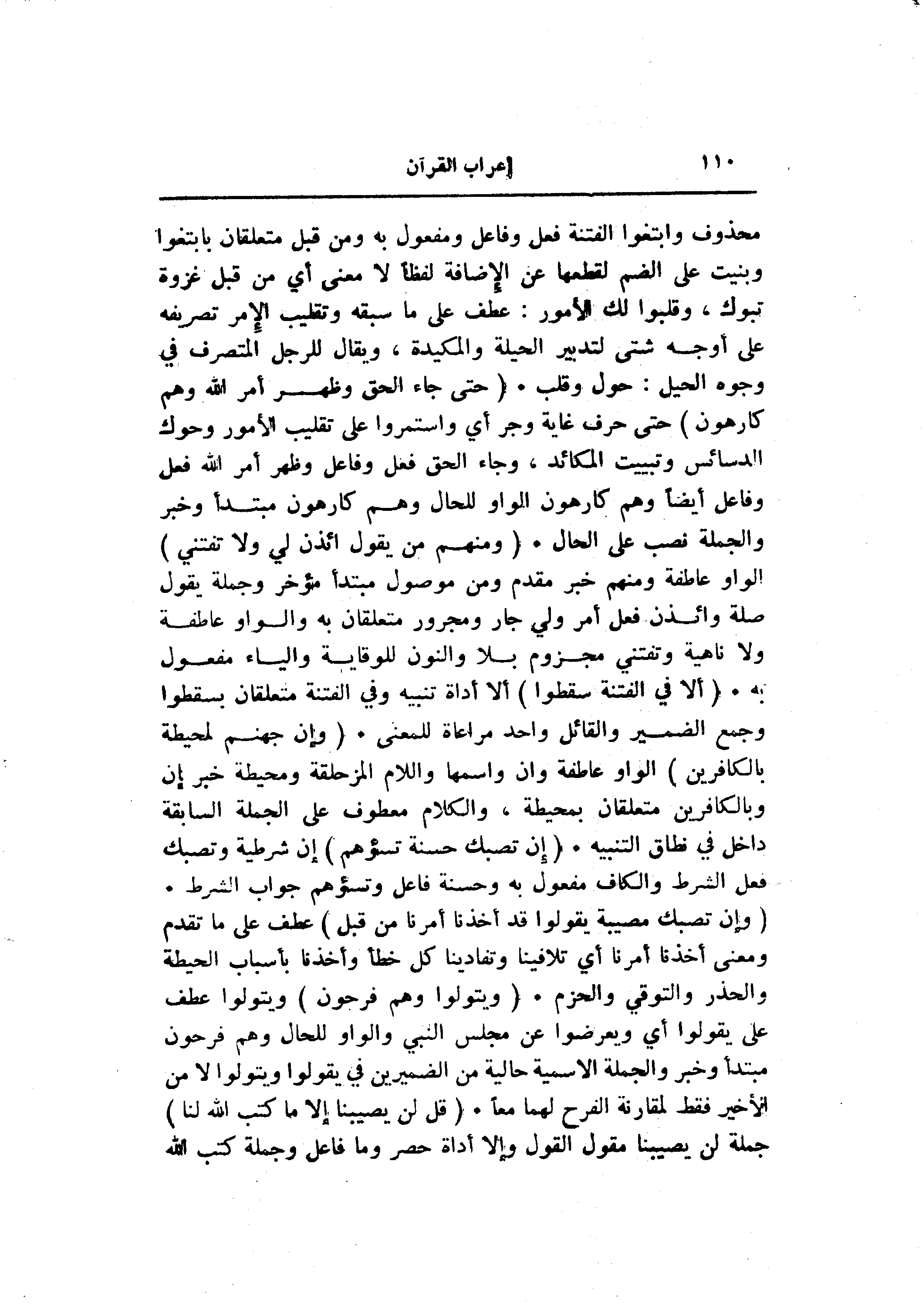 محذوف وابتغوا الفتنة فعل وفاعل ومفعول به ومن قبل متعلقان بابتغوا وبنيت على الضم لقطعها عن الإضافة لفظا لا معنى أي من قبل غزوة تبوك، وقلبوا لك الأمور: عطف على ما سبقه وتقليب الإمر تصريفه على أوجه شتى لتدبير الحيلة والمكيدة، ويقال للرجل المتصرف في وجوه الحيل: حول وقلب. (حَتَّى جاءَ الْحَقُّ وَظَهَرَ أَمْرُ اللَّهِ وَهُمْ كارِهُونَ) حتى حرف غاية وجر أي واستمروا على تقليب الأمور وحوك الدسائس وتبييت المكائد، وجاء الحق فعل وفاعل وظهر أمر الله فعل وفاعل أيضا وهم كارهون الواو للحال وهم كارهون مبتدأ وخبر والجملة نصب على الحال. (وَمِنْهُمْ مَنْ يَقُولُ ائْذَنْ لِي وَلا تَفْتِنِّي) الواو عاطفة ومنهم خبر مقدم ومن موصول مبتدأ مؤخر وجملة يقول صلة وائذن فعل أمر ولي جار ومجرور متعلقان به والواو عاطفة ولا ناهية وتفتني مجزوم بلا والنون للوقاية والياء مفعول به. (أَلا فِي الْفِتْنَةِ سَقَطُوا) ألا أداة تنبيه وفي الفتنة متعلقان بسقطوا وجمع الضمير والقائل واحد مراعاة للمعنى. (وَإِنَّ جَهَنَّمَ لَمُحِيطَةٌ بِالْكافِرِينَ) الواو عاطفة وان واسمها واللام المزحلقة ومحيطة خبر إن وبالكافرين متعلقان بمحيطة، والكلام معطوف على الجملة السابقة داخل في نطاق التنبيه. (إِنْ تُصِبْكَ حَسَنَةٌ تَسُؤْهُمْ) إن شرطية وتصبك فعل الشرط والكاف مفعول به وحسنة فاعل وتسؤهم جواب الشرط.
