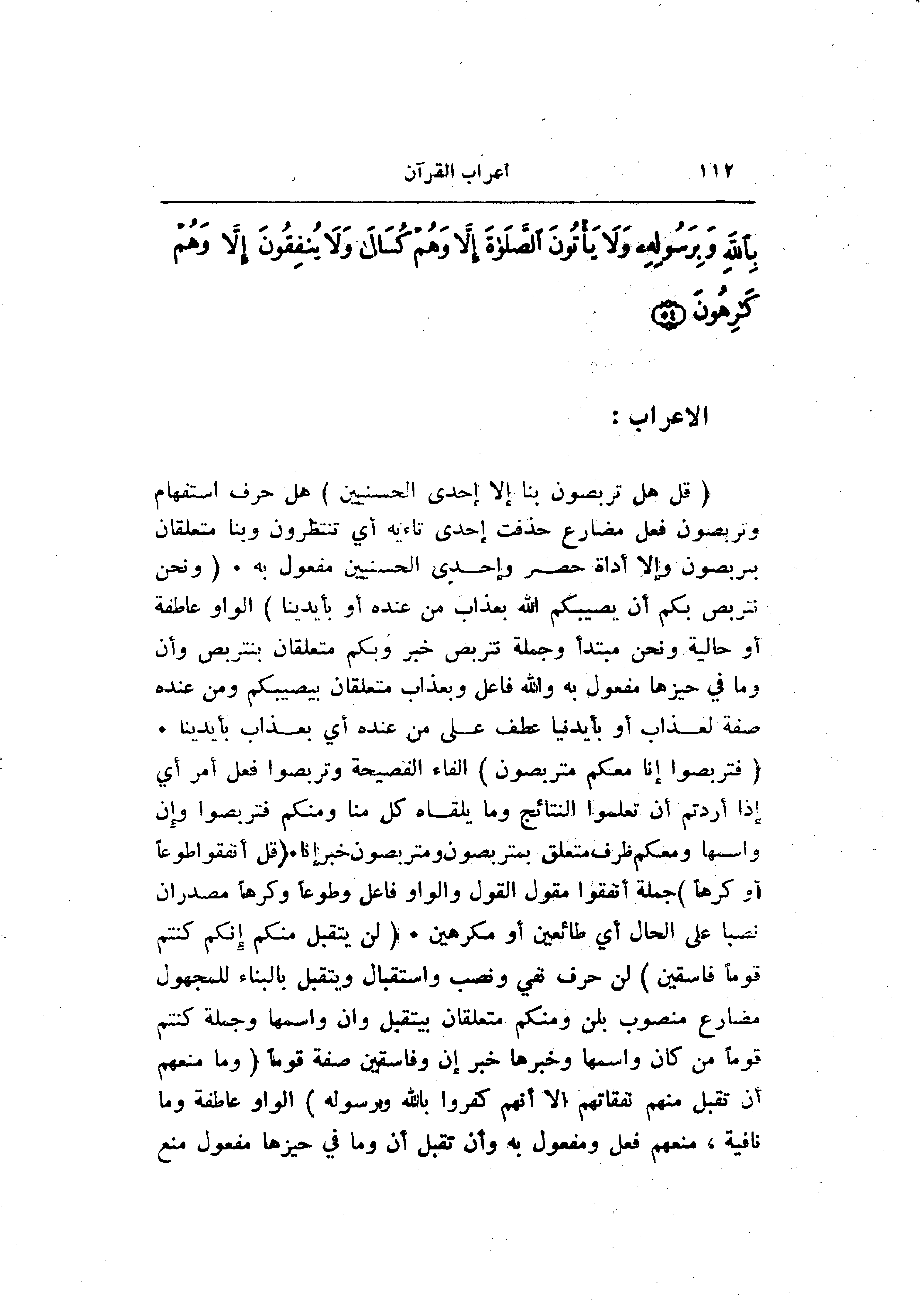(فَتَرَبَّصُوا إِنَّا مَعَكُمْ مُتَرَبِّصُونَ) الفاء الفصيحة وتربصوا فعل أمر أي إذا أردتم أن تعلموا النتائج وما يلقاه كل منا ومنكم فتربصوا وإن واسمها ومعكم ظرف متعلق بمتربصون ومتربصون خبر إنا. (قُلْ أَنْفِقُوا طَوْعاً أَوْ كَرْهاً) جملة أنفقوا مقول القول والواو فاعل وطوعا وكرها مصدر ان نصبا على الحال أي طائعين أو مكرهين. (لَنْ يُتَقَبَّلَ مِنْكُمْ إِنَّكُمْ كُنْتُمْ قَوْماً فاسِقِينَ) لن حرف نفي ونصب واستقبال ويتقبل بالبناء للمجهول مضارع منصوب بلن ومنكم متعلقان بيتقبل وان واسمها وجملة كنتم قوما من كان واسمها وخبرها خبر إن وفاسقين صفة قوما (وَما مَنَعَهُمْ أَنْ تُقْبَلَ مِنْهُمْ نَفَقاتُهُمْ إِلَّا أَنَّهُمْ كَفَرُوا بِاللَّهِ وَبِرَسُولِهِ) الواو عاطفة وما نافية، منعهم فعل ومفعول به وأن تقبل أن وما في حيزها مفعول منع