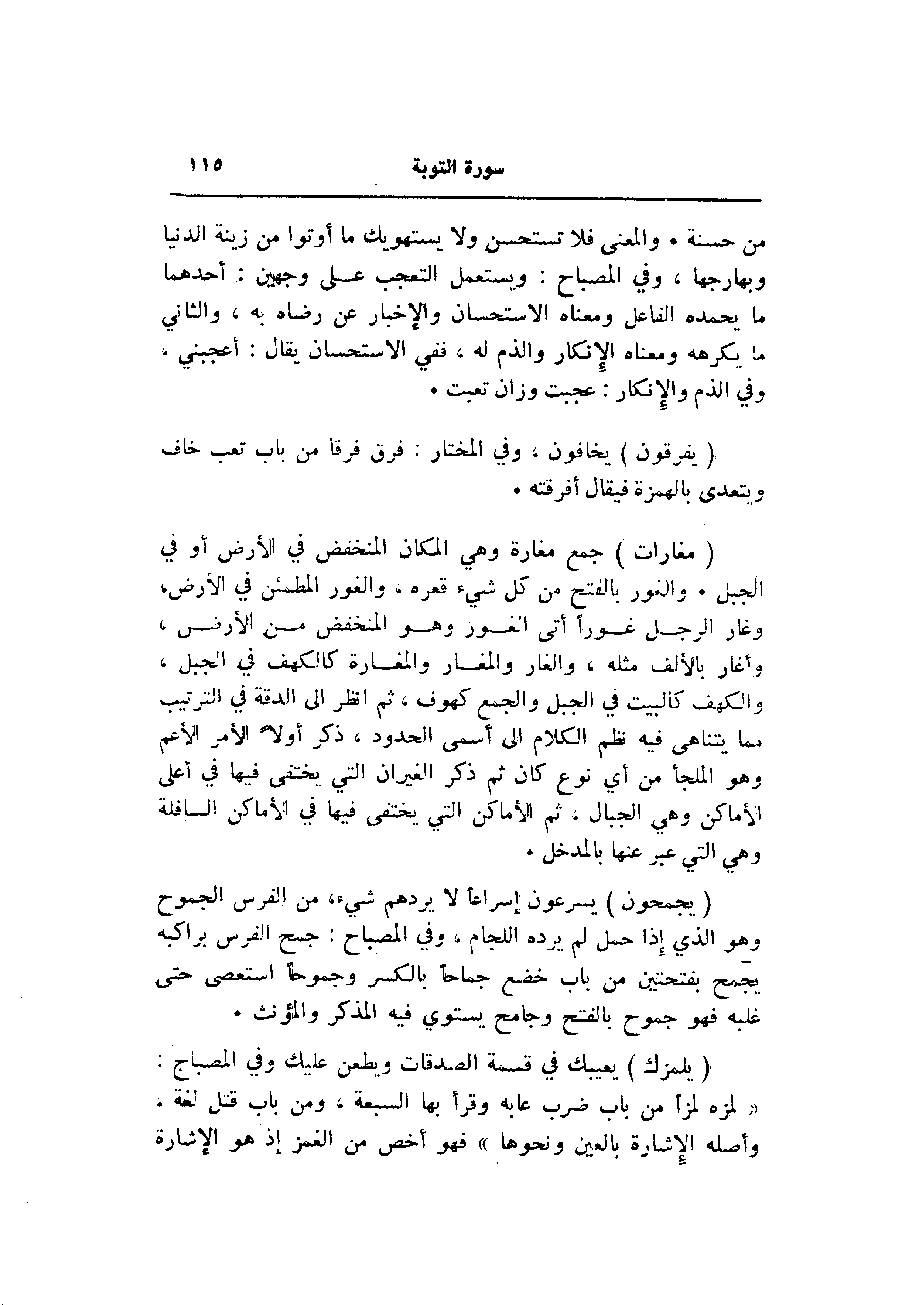 (مَغاراتٍ) جمع مغارة وهي المكان المنخفض في الأرض أو في الجبل. والغور بالفتح من كل شيء قعره، والغور المطمئن في الأرض، وغار الرجل غورا أتى الغور وهو المنخفض من الأرض، وأغار بالألف مثله، والغار والمغار والمغارة كالكهف في الجبل، والكهف كالبيت في الجبل والجمع كهوف، ثم انظر الى الدقة في الترتيب مما يتناهى فيه نظم الكلام الى أسمى الحدود، ذكر أولا الأمر الأعم وهو الملجأ من أي نوع كان ثم ذكر الغيران التي يختفى فيها في أعلى الأماكن وهي الجبال، ثم الأماكن التي يختفى فيها في الأماكن السافلة وهي التي عبر عنها بالمدخل.