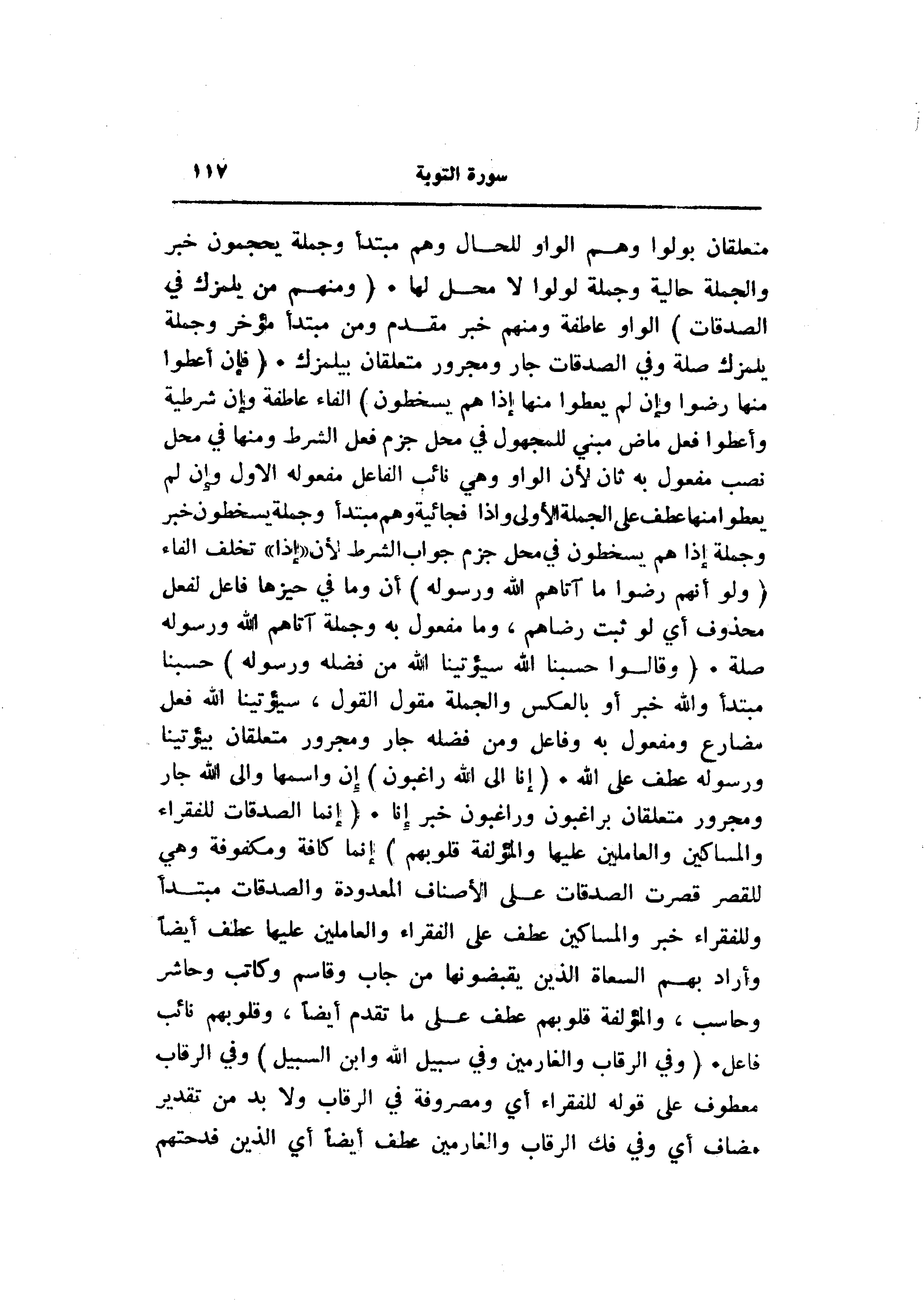 متعلقان بولوا وهم الواو للحال وهم مبتدأ وجملة يحجمون خبر والجملة حالية وجملة لولوا لا محل لها. (وَمِنْهُمْ مَنْ يَلْمِزُكَ فِي الصَّدَقاتِ) الواو عاطفة ومنهم خبر مقدم ومن مبتدأ مؤخر وجملة يلمزك صلة وفي الصدقات جار ومجرور متعلقان بيلمزك. (فَإِنْ أُعْطُوا مِنْها رَضُوا وَإِنْ لَمْ يُعْطَوْا مِنْها إِذا هُمْ يَسْخَطُونَ) الفاء عاطفة وإن شرطية وأعطوا فعل ماض مبني للمجهول في محل جزم فعل الشرط ومنها في محل نصب مفعول به ثان لأن الواو وهي نائب الفاعل مفعوله الأول وإن لم يعطوا منها عطف على الجملة الأولى وإذا فجائية وهم مبتدأ وجملة يسخطون خبر وجملة إذا هم يسخطون في محل جزم جواب الشرط لأن «إذا» تخلف الفاء (وَلَوْ أَنَّهُمْ رَضُوا ما آتاهُمُ اللَّهُ وَرَسُولُهُ) أن وما في حيزها فاعل لفعل محذوف أي لو ثبت رضاهم، وما مفعول به وجملة آتاهم الله ورسوله صلة. (وَقالُوا حَسْبُنَا اللَّهُ سَيُؤْتِينَا اللَّهُ مِنْ فَضْلِهِ وَرَسُولُهُ) حسبنا مبتدأ والله خبر أو بالعكس والجملة مقول القول، سيؤتينا الله فعل مضارع ومفعول به وفاعل ومن فضله جار ومجرور متعلقان بيؤتينا ورسوله عطف على الله. (إِنَّا إِلَى اللَّهِ راغِبُونَ) إن واسمها والى الله جار ومجرور متعلقان براغبون وراغبون خبر إنا. (إِنَّمَا الصَّدَقاتُ لِلْفُقَراءِ وَالْمَساكِينِ وَالْعامِلِينَ عَلَيْها وَالْمُؤَلَّفَةِ قُلُوبُهُمْ) إنما كافة ومكفوفة وهي للقصر قصرت الصدقات على الأصناف المعدودة والصدقات مبتدأ وللفقراء خبر والمساكين عطف على الفقراء والعاملين عليها عطف أيضا وأراد بهم السعاة الذين يقبضونها من جاب وقاسم وكاتب وحاشر وحاسب، والمؤلفة قلوبهم عطف على ما تقدم أيضا، وقلوبهم نائب فاعل. (وَفِي الرِّقابِ وَالْغارِمِينَ وَفِي سَبِيلِ اللَّهِ وَابْنِ السَّبِيلِ) وفي الرقاب معطوف على قوله للفقراء أي ومصروفة في الرقاب ولا بد من تقدير مضاف أي وفي فك الرقاب والغارمين عطف أيضا أي الذين فدحتهم