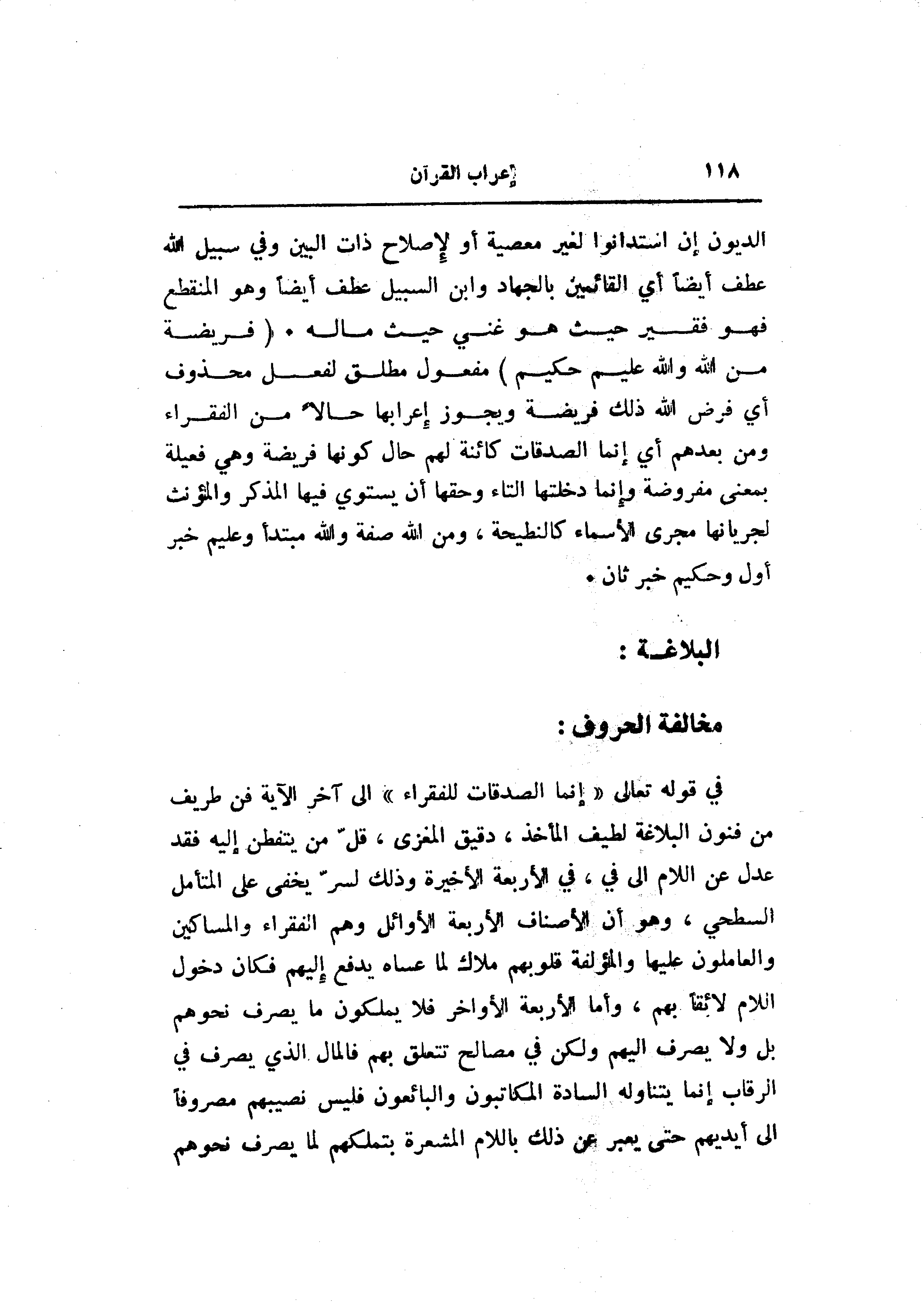 في قوله تعالى «إنما الصدقات للفقراء» الى آخر الآية فن طريف من فنون البلاغة لطيف المأخذ، دقيق المغزى، قلّ من يتفطن إليه فقد عدل عن اللام الى في، في الأربعة الأخيرة وذلك لسرّ يخفى على المتأمل السطحي، وهو أن الأصناف الأربعة الأوائل وهم الفقراء والمساكين والعاملون عليها والمؤلفة قلوبهم ملاك لما عساه يدفع إليهم فكان دخول اللام لائقا بهم، وأما الأربعة الأواخر فلا يملكون ما يصرف نحوهم بل ولا يصرف إليهم ولكن في مصالح تتعلق بهم فالمال الذي يصرف في الرقاب إنما يتناوله السادة المكاتبون والبائعون فليس نصيبهم مصروفا الى أيديهم حتى يعبر عن ذلك باللام المشعرة بتملكهم لما يصرف نحوهم