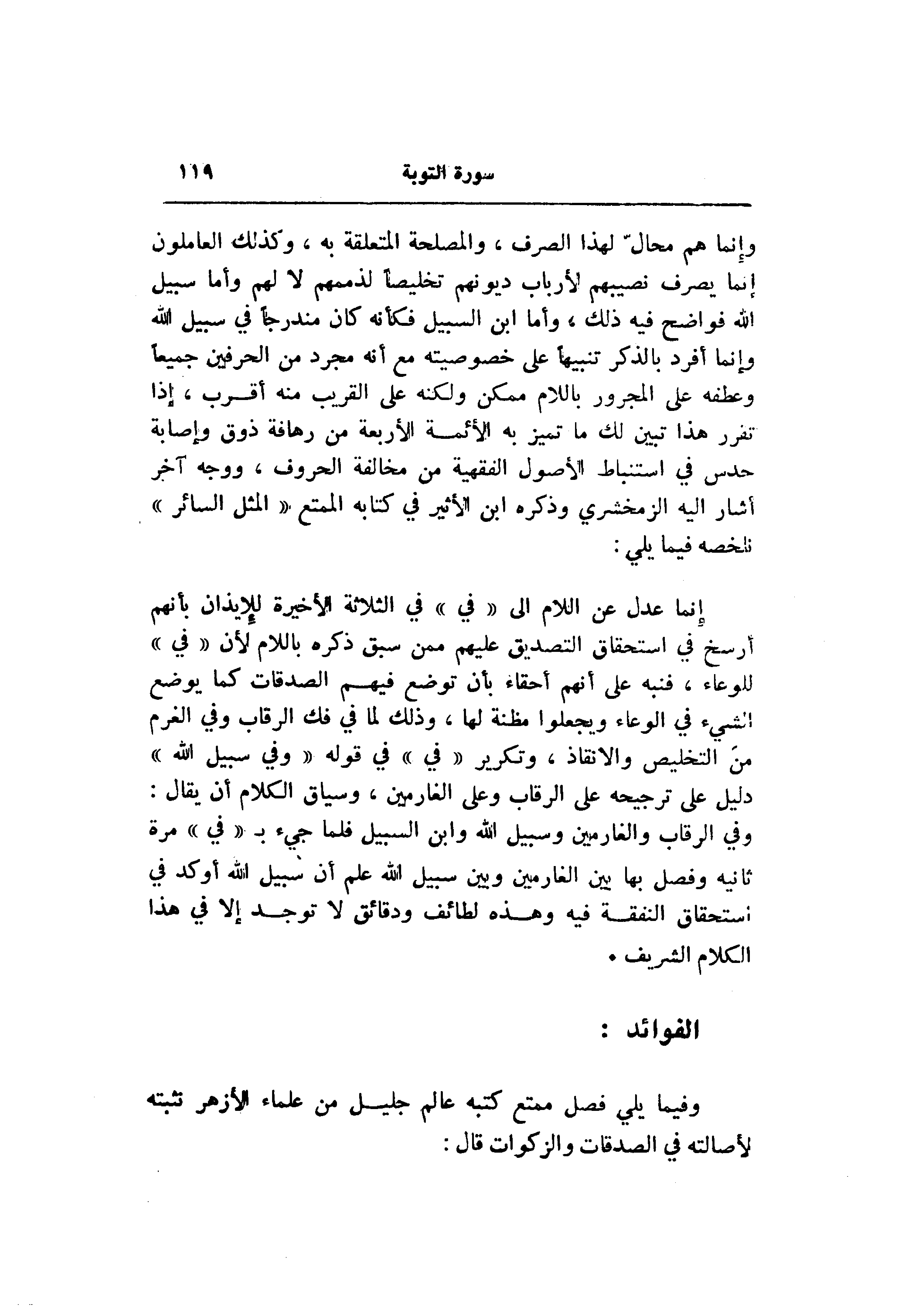 وإنما هم محالّ لهذا الصرف، والمصلحة المتعلقة به، وكذلك العاملون إنما يصرف نصيبهم لأرباب ديونهم تخليصا لذممهم لا لهم وأما سبيل الله فواضح فيه ذلك، وأما ابن السبيل فكأنه كان مندرجا في سبيل الله وإنما أفرد بالذكر تنبيها على خصوصيته مع أنه مجرد من الحرفين جميعا وعطفه على المجرور باللام ممكن ولكنه على القريب منه أقرب، إذا تفرر هذا تبين لك ما تميز به الأئمة الأربعة من رهافة ذوق وإصابة حدس في استنباط الأصول الفقهية من مخالفة الحروف، ووجه آخر أشار اليه الزمخشري وذكره ابن الأثير في كتابه الممتع «المثل السائر» نلخصه فيما يلي: