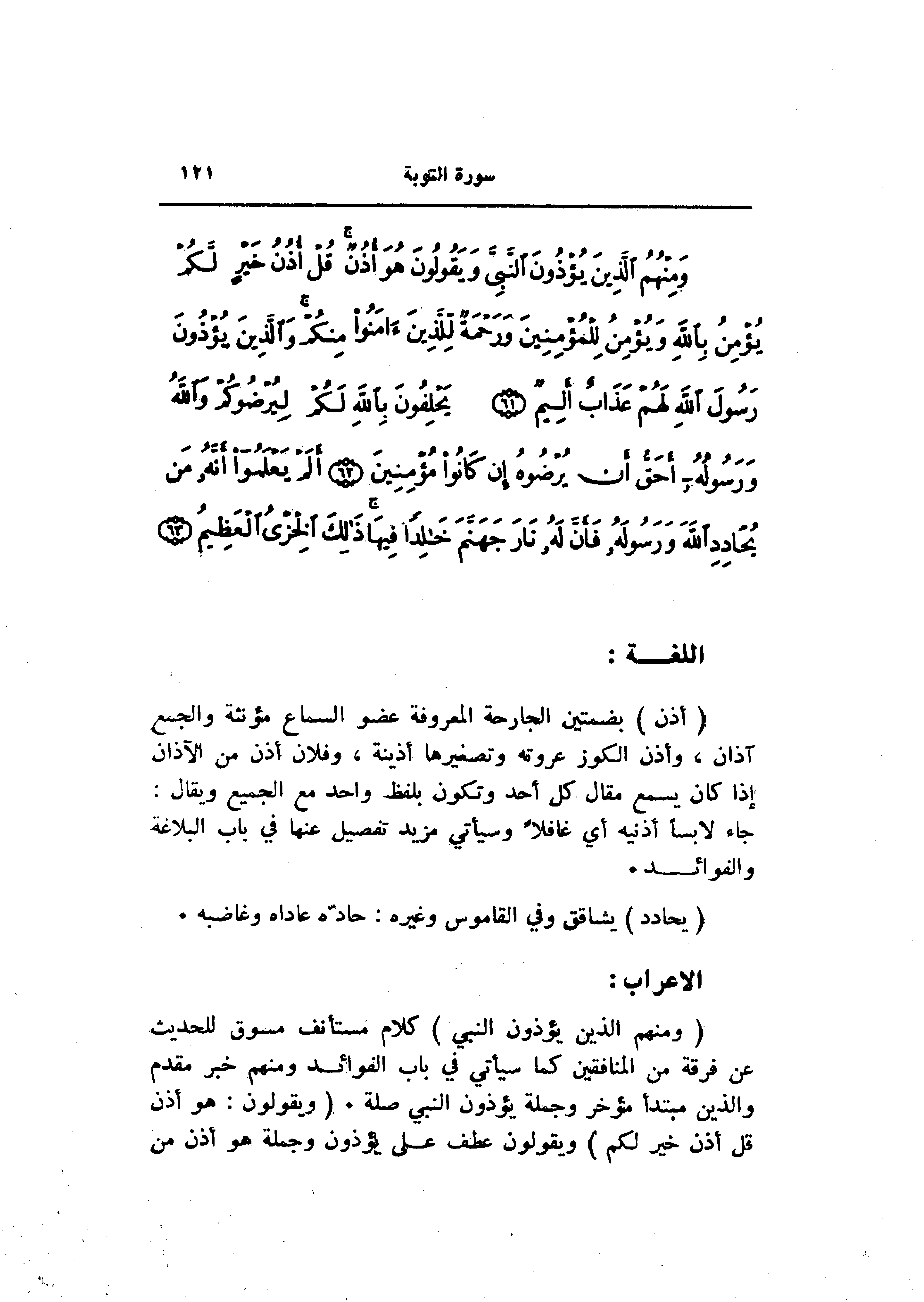(وَمِنْهُمُ الَّذِينَ يُؤْذُونَ النَّبِيَّ) كلام مستأنف مسوق للحديث عن فرقة من المنافقين كما سيأتي في باب الفوائد ومنهم خبر مقدم والذين مبتدأ مؤخر وجملة يؤذون النبي صلة. (وَيَقُولُونَ: هُوَ أُذُنٌ قُلْ أُذُنُ خَيْرٍ لَكُمْ) ويقولون عطف على يؤذون وجملة هو أذن من