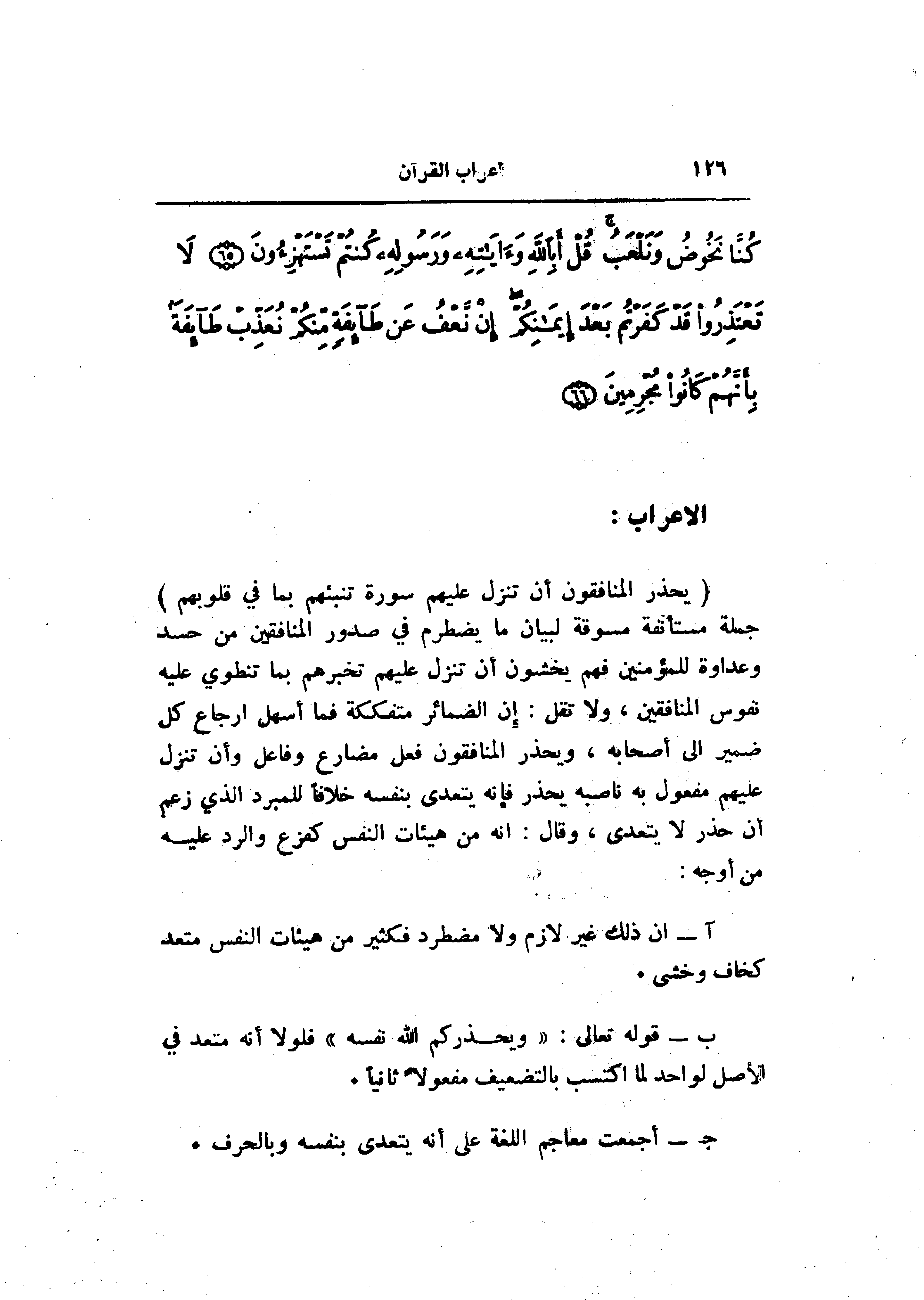 (يَحْذَرُ الْمُنافِقُونَ أَنْ تُنَزَّلَ عَلَيْهِمْ سُورَةٌ تُنَبِّئُهُمْ بِما فِي قُلُوبِهِمْ) جملة مستأنفة مسوقة لبيان ما يضطرم في صدور المنافقين من حسد وعداوة للمؤمنين فهم يخشون أن تنزل عليهم تخبرهم بما تنطوي عليه نفوس المنافقين، ولا تقل: إن الضمائر متفككة فما أسهل إرجاع كل ضمير الى أصحابه، ويحذر المنافقون فعل مضارع وفاعل وأن تنزل عليهم مفعول به ناصبه يحذر فإنه يتعدى بنفسه خلافا للمبرد الذي زعم أن حذر لا يتعدى، وقال: انه من هيئات النفس كفزع والرد عليه من أوجه: