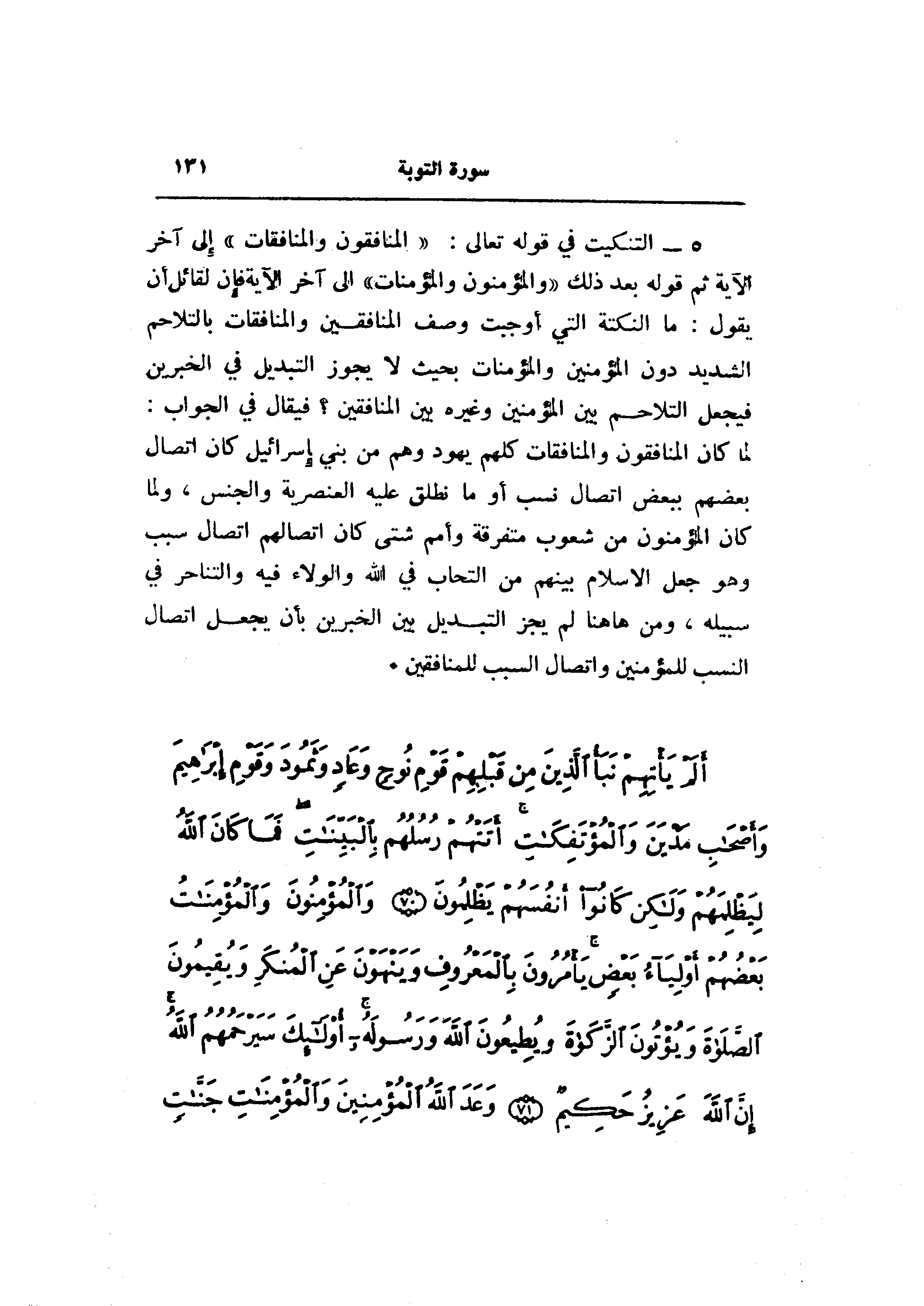 لما كان المنافقون والمنافقات كلهم يهود وهم من بني إسرائيل كان اتصال بعضهم ببعض اتصال نسب أو ما نطلق عليه العنصرية والجنس، ولما كان المؤمنون من شعوب متفرقة وأمم شتى كان اتصالهم اتصال سبب وهو جعل الإسلام بينهم من التحاب في الله والولاء فيه والتناحر في سبيله، ومن هاهنا لم يجز التبديل بين الخبرين بأن يجعل اتصال النسب للمؤمنين واتصال السبب للمنافقين.