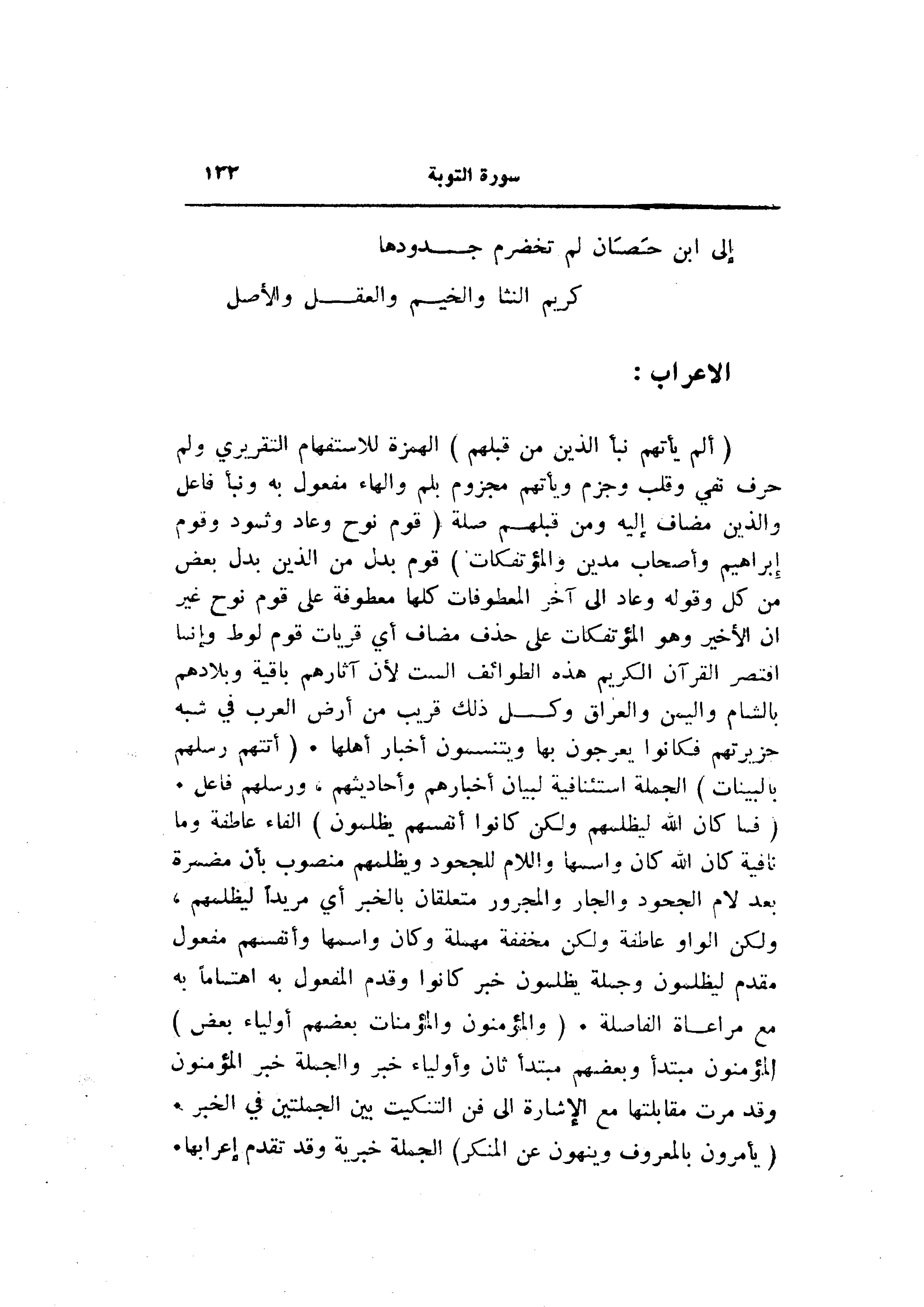 (أَلَمْ يَأْتِهِمْ نَبَأُ الَّذِينَ مِنْ قَبْلِهِمْ) الهمزة للاستفهام التقريري ولم حرف نفي وقلب وجزم ويأتهم مجزوم بلم والهاء مفعول به ونبأ فاعل والذين مضاف إليه ومن قبلهم صلة (قَوْمِ نُوحٍ وَعادٍ وَثَمُودَ وَقَوْمِ إِبْراهِيمَ وَأَصْحابِ مَدْيَنَ وَالْمُؤْتَفِكاتِ) قوم بدل من الذين بدل بعض من كل وقوله وعاد الى آخر المعطوفات كلها معطوفة على قوم نوح غير ان الأخير وهو المؤتفكات على حذف مضاف أي قريات قوم لوط وإنما افتصر القرآن الكريم هذه الطوائف الست لأن آثارهم باقية وبلادهم بالشام واليمن والعراق وكل ذلك قريب من أرض العرب في شبه حزيرتهم فكانوا يعرجون بها ويتنسمون أخبار أهلها. (أَتَتْهُمْ رُسُلُهُمْ بِالْبَيِّناتِ) الجملة استئنافية لبيان أخبارهم وأحاديثهم، ورسلهم فاعل.