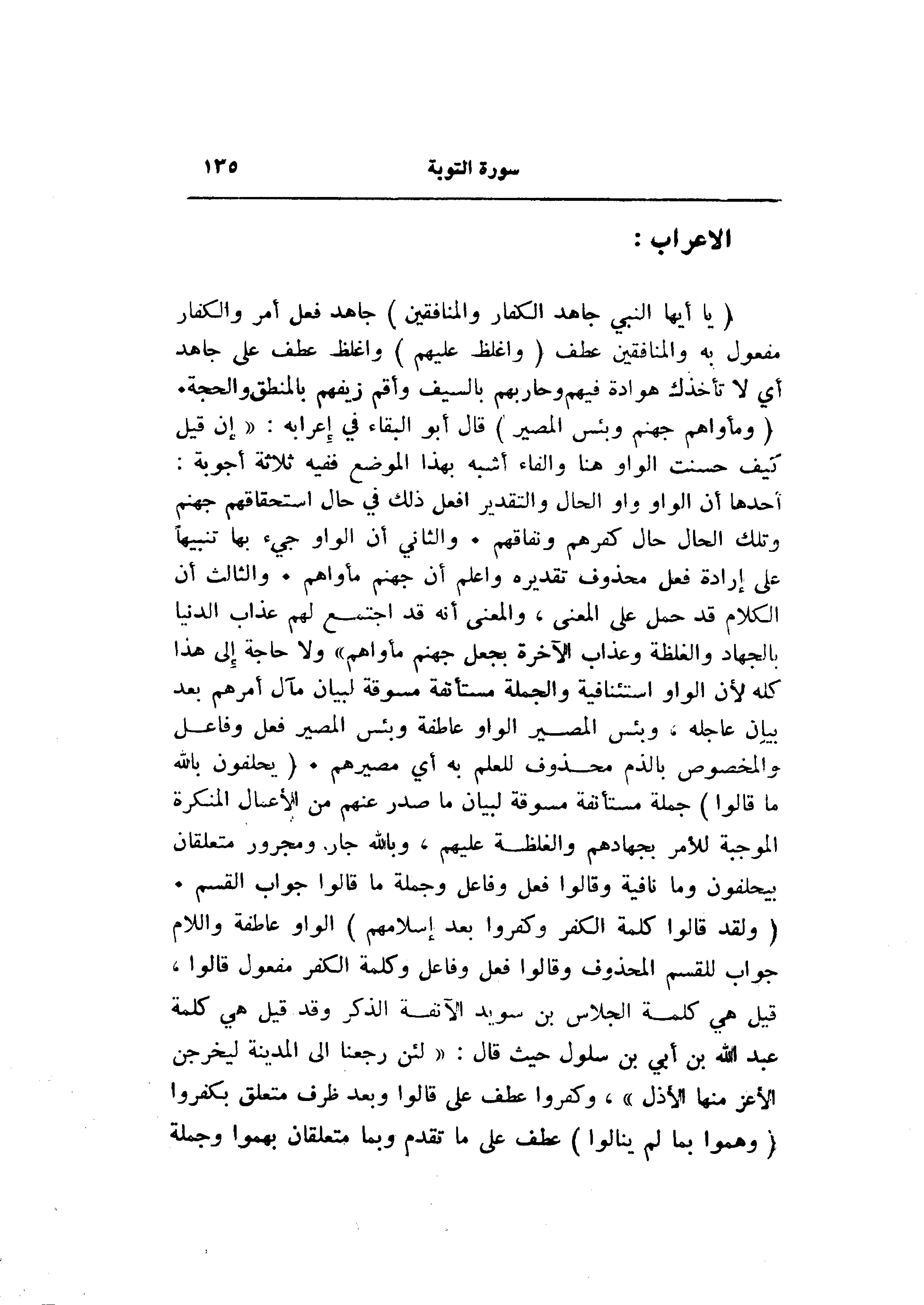 أحدها أن الواو واو الحال والتقدير افعل ذلك في حال استحقاقهم جهنم وتلك الحال حال كفرهم ونفاقهم. والثاني أن الواو جيء بها تنبيها على إرادة فعل محذوف تقديره واعلم أن جهنم مأواهم. والثالث أن الكلام قد حمل على المعنى، والمعنى أنه قد اجتمع لهم عذاب الدنيا بالجهاد والغلظة وعذاب الآخرة بجعل جهنم مأواهم» ولا حاجة إلى هذا كله لأن الواو استئنافية والجملة مستأنفة مسوقة لبيان مآل أمرهم بعد بيان عاجله، وبئس المصير الواو عاطفة وبئس المصير فعل وفاعل والمخصوص بالذم محذوف للعلم به أي مصيرهم. (يَحْلِفُونَ بِاللَّهِ ما قالُوا) جملة مستأنفة مسوقة لبيان ما صدر عنهم من الأعمال المنكرة الموجبة للأمر بجهادهم والغلظة عليهم، وبالله جار ومجرور متعلقان بيحلفون وما نافية وقالوا فعل وفاعل وجملة ما قالوا جواب القسم.