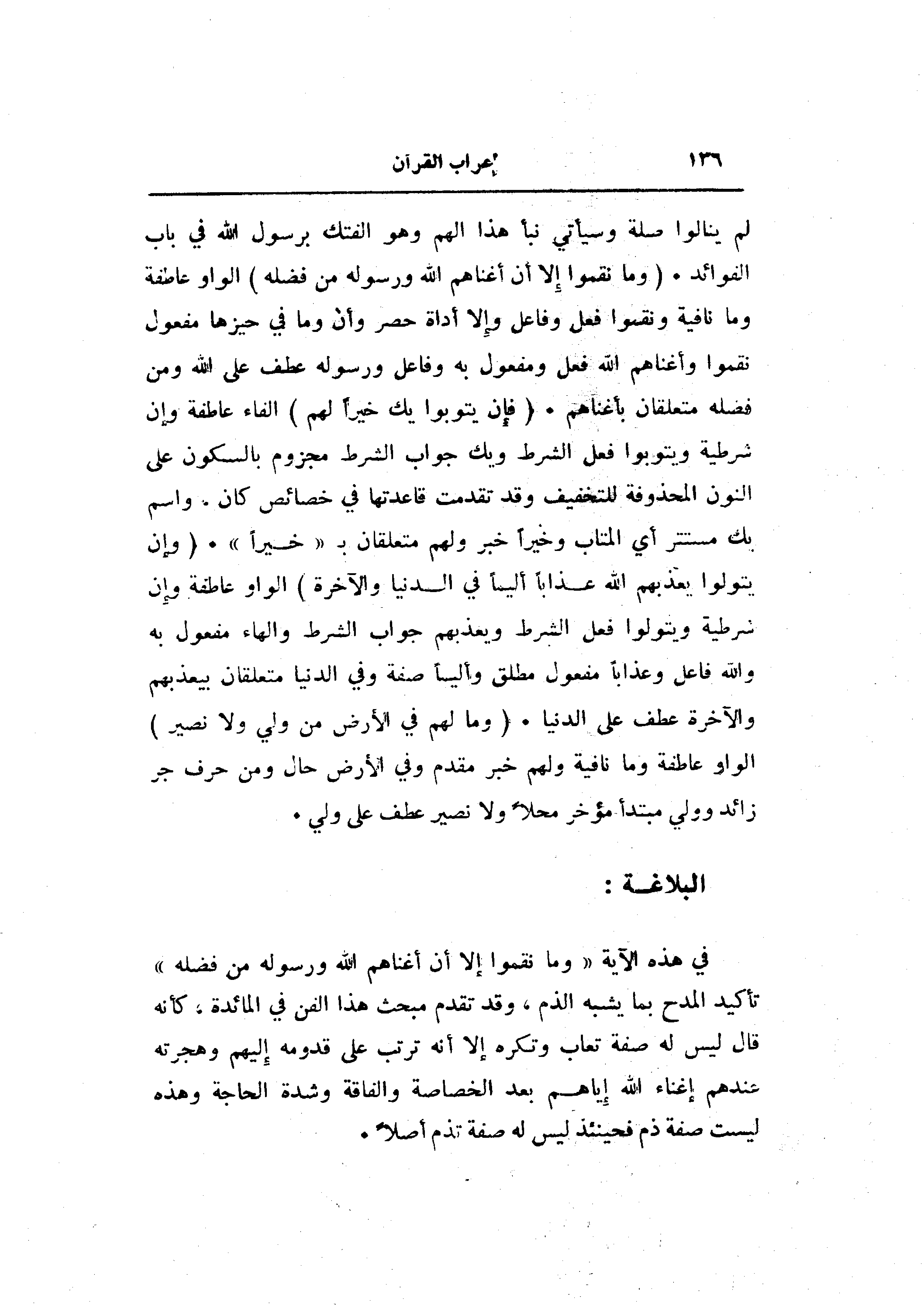 لم ينالوا صلة وسيأتي نبأ هذا الهم وهو الفتك برسول الله في باب الفوائد. (وَما نَقَمُوا إِلَّا أَنْ أَغْناهُمُ اللَّهُ وَرَسُولُهُ مِنْ فَضْلِهِ) الواو عاطفة وما نافية ونقموا فعل وفاعل وإلا أداة حصر وأن وما في حيزها مفعول نقموا وأغناهم الله فعل ومفعول به وفاعل ورسوله عطف على الله ومن فضله متعلقان بأغناهم. (فَإِنْ يَتُوبُوا يَكُ خَيْراً لَهُمْ) الفاء عاطفة وإن شرطية ويتوبوا فعل الشرط ويك جواب الشرط مجزوم بالسكون على النون المحذوفة للتخفيف وقد تقدمت قاعدتها في خصائص كان، واسم بك مستتر أي المتاب وخيرا خبر ولهم متعلقان ب «خيرا» . (وَإِنْ يَتَوَلَّوْا يُعَذِّبْهُمُ اللَّهُ عَذاباً أَلِيماً فِي الدُّنْيا وَالْآخِرَةِ) الواو عاطفة وإن شرطية ويتولوا فعل الشرط ويعذبهم جواب الشرط والهاء مفعول به والله فاعل وعذابا مفعول مطلق وأليما صفة وفي الدنيا متعلقان بيعذبهم والآخرة عطف على الدنيا. (وَما لَهُمْ فِي الْأَرْضِ مِنْ وَلِيٍّ وَلا نَصِيرٍ) الواو عاطفة وما نافية ولهم خبر مقدم وفي الأرض حال ومن حرف جر زائد وولي مبتدأ مؤخر محلا ولا نصير عطف على ولي.