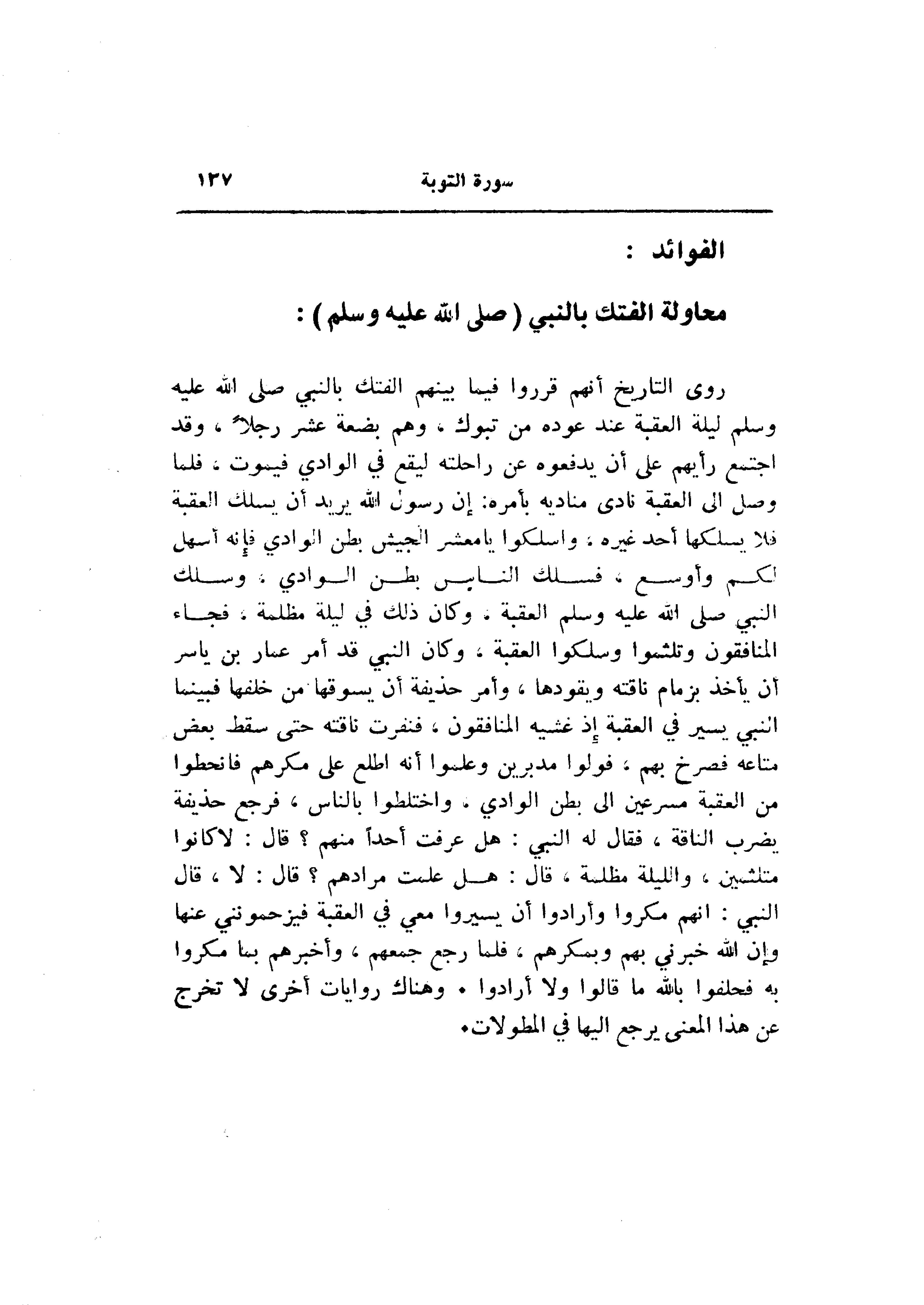 روى التاريخ أنهم قرروا فيما بينهم الفتك بالنبي صلى الله عليه وسلم ليلة العقبة عند عوده من تبوك، وهم بضعة عشر رجلا، وقد اجتمع رأيهم على أن يدفعوه عن راحلته ليقع في الوادي فيموت، فلما وصل الى العقبة نادى مناديه بأمره: إن رسول الله يريد أن يسلك العقبة فلا يسلكها أحد غيره، واسلكوا يا معشر الجيش بطن الوادي فإنه أسهل لكم وأوسع، فسلك الناس بطن الوادي، وسلك النبي صلى الله عليه وسلم العقبة، وكان ذلك في ليلة مظلمة، فجاء المنافقون وتلثموا وسلكوا العقبة، وكان النبي قد أمر عمار بن ياسر أن يأخذ بزمام ناقته ويقودها، وأمر حذيفة أن يسوقها من خلفها فبينما النبي يسير في العقبة إذ غشيه المنافقون، فنفرت ناقته حتى سقط بعض متاعه فصرخ بهم، فولوا مدبرين وعلموا أنه اطلع على مكرهم فانحطوا من العقبة مسرعين الى بطن الوادي، واختلطوا بالناس، فرجع حذيفة يضرب الناقة، فقال له النبي: هل عرفت أحدا منهم؟ قال: لا كانوا متلثمين، والليلة مظلمة، قال: هل علمت مرادهم؟ قال: لا، قال النبي: انهم مكروا وأرادوا أن يسيروا معي في العقبة فيزحمونني عنها وإن الله خبرني بهم وبمكرهم، فلما رجع جمعهم، وأخبرهم بما مكروا به فحلفوا بالله ما قالوا ولا أرادوا. وهناك روايات أخرى لا تخرج عن هذا المعنى يرجع إليها في المطولات.