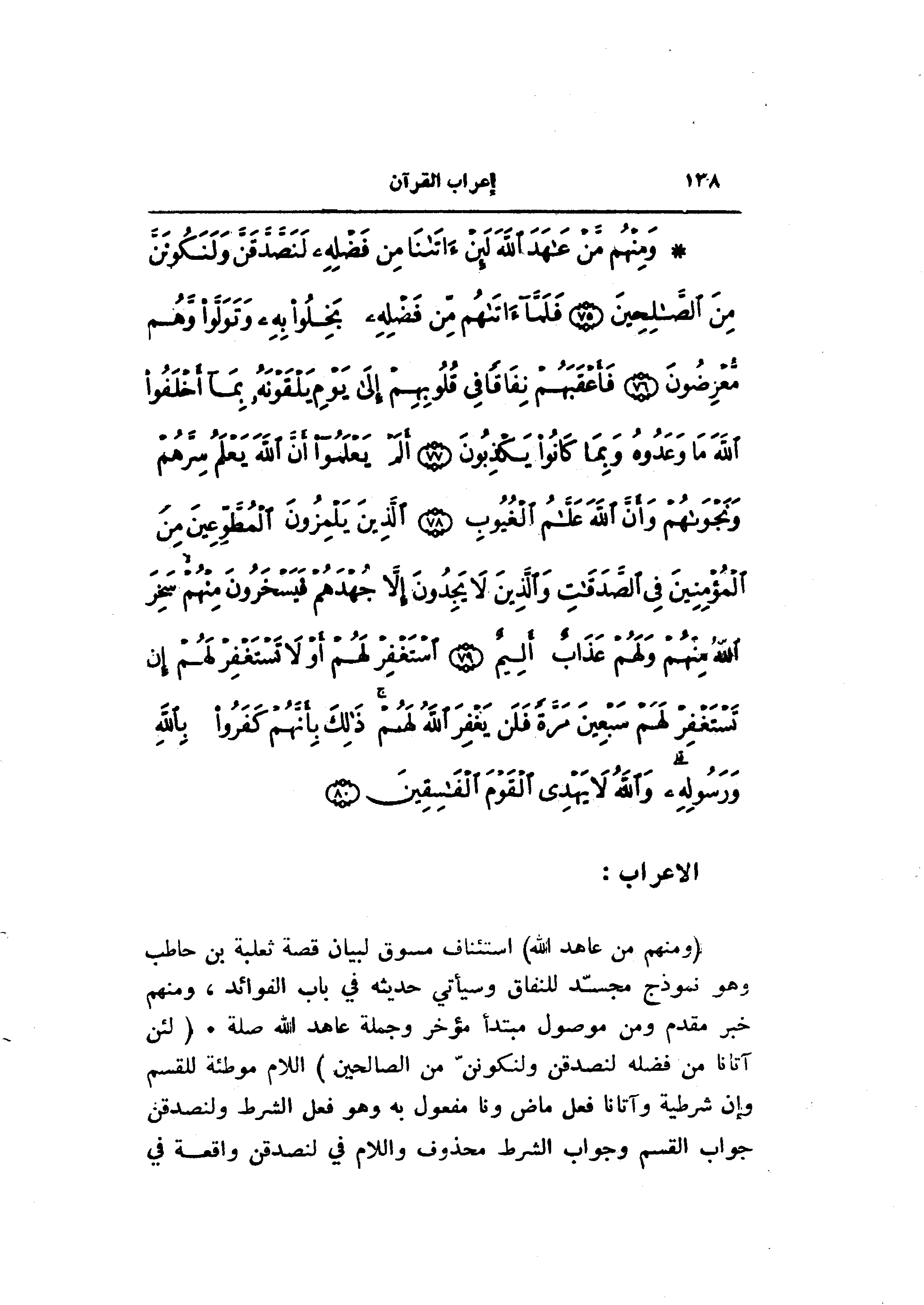 (وَمِنْهُمْ مَنْ عاهَدَ اللَّهَ) استئناف مسوق لبيان قصة ثعلبة بن حاطب وهو نموذج مجسّد للنفاق وسيأتي حديثه في باب الفوائد، ومنهم خبر مقدم ومن موصول مبتدأ مؤخر وجملة عاهد الله صلة. (لَئِنْ آتانا مِنْ فَضْلِهِ لَنَصَّدَّقَنَّ وَلَنَكُونَنَّ مِنَ الصَّالِحِينَ) اللام موطئة للقسم وإن شرطية وآتانا فعل ماض ونا مفعول به وهو فعل الشرط ولنصدقن جواب القسم وجواب الشرط محذوف واللام في لنصدقن واقعة في