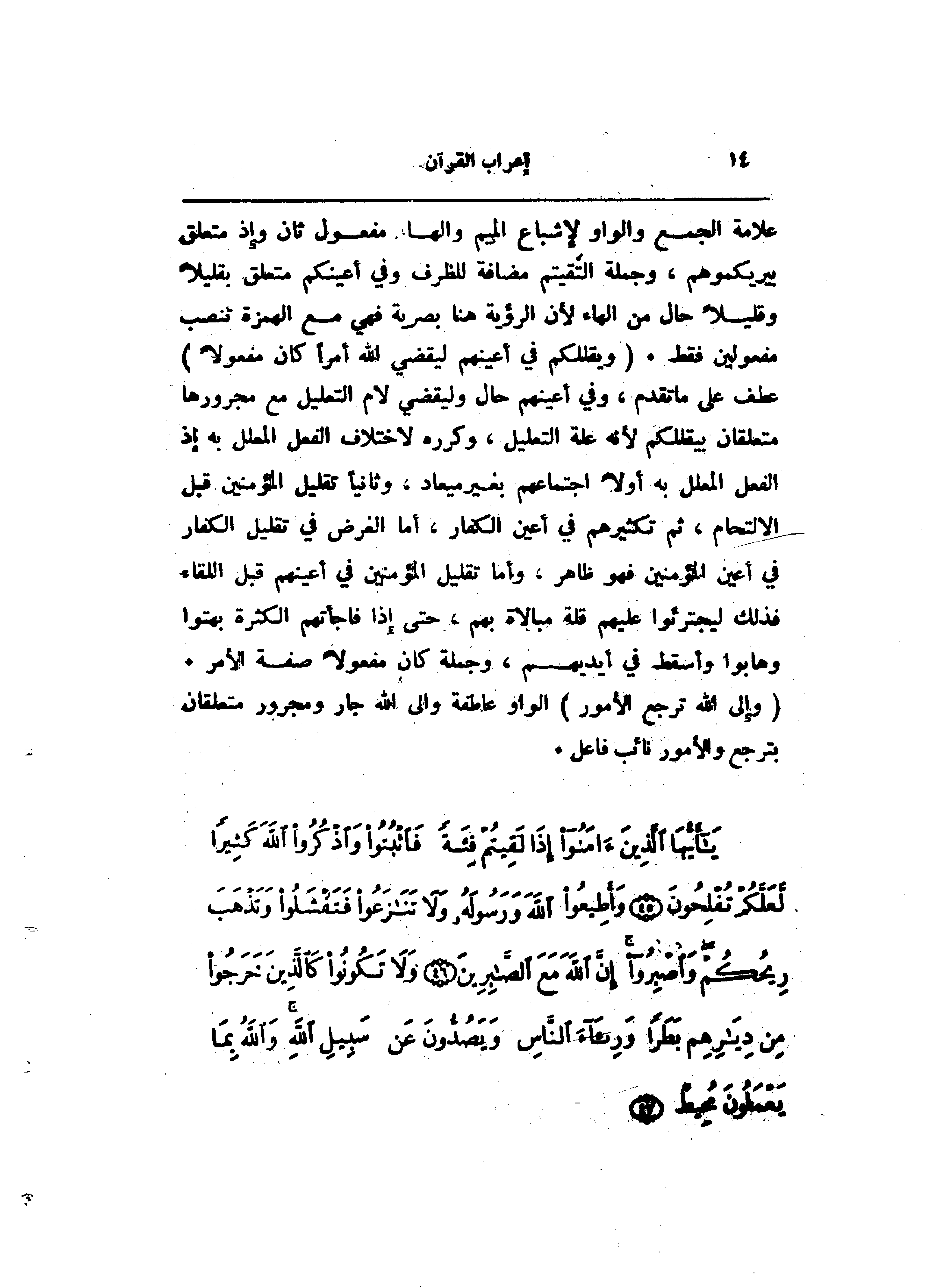 علامة الجمع والواو لإشباع الميم والهاء مفعول ثان وإذ متعلق بيريكموهم، وجملة التقيتم مضافة للظرف وفي أعينكم متعلق بقليلا وقليلا حال من الهاء لأن الرؤية هنا بصرية فهي مع الهمزة تنصب مفعولين فقط. (وَيُقَلِّلُكُمْ فِي أَعْيُنِهِمْ لِيَقْضِيَ اللَّهُ أَمْراً كانَ مَفْعُولًا) عطف على ما تقدم، وفي أعينهم حال وليقضي لام التعليل مع مجرورها متعلقان بيقللكم لأنه علة التعليل، وكرره لاختلاف الفعل المعلل به إذ الفعل المعلل به أولا اجتماعهم بغير ميعاد، وثانيا تقليل المؤمنين قبل الالتحام، ثم تكثيرهم في أعين الكفار، أما الغرض في تقليل الكفار في أعين المؤمنين فهو ظاهر، وأما تقليل المؤمنين في أعينهم قبل اللقاء فذلك ليجترئوا عليهم قلة مبالاة بهم، حتى إذا فاجأتهم الكثرة بهتوا وهابوا وأسقط في أيديهم، وجملة كان مفعولا صفة الأمر.