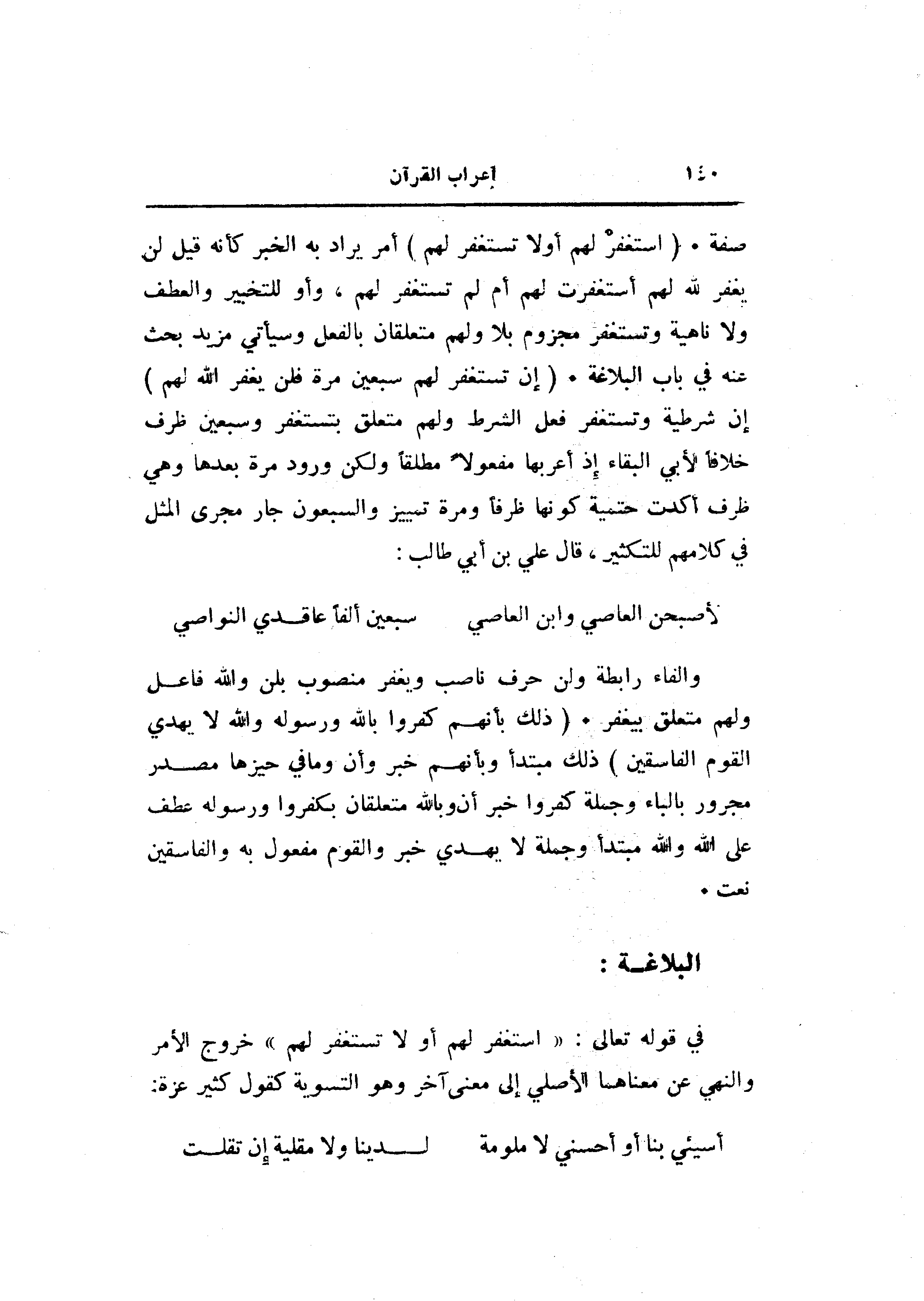صفة. (اسْتَغْفِرْ لَهُمْ أَوْ لا تَسْتَغْفِرْ لَهُمْ) أمر يراد به الخبر كأنه قيل لن يغفر الله لهم أستغفرت لهم أم لم تستغفر لهم، وأو للتخبير والعطف ولا ناهية وتستغفر مجزوم بلا ولهم متعلقان بالفعل وسيأتي مزيد بحث عنه في باب البلاغة. (إِنْ تَسْتَغْفِرْ لَهُمْ سَبْعِينَ مَرَّةً فَلَنْ يَغْفِرَ اللَّهُ لَهُمْ) إن شرطية وتستغفر فعل الشرط ولهم متعلق بتستغفر وسبعين ظرف خلافا لأبي البقاء إذ أعربها مفعولا مطلقا ولكن ورود مرة بعدها وهي ظرف أكدت حتمية كونها ظرفا ومرة تمييز والسبعون جار مجرى المثل في كلامهم للتكثير، قال علي بن أبي طالب: