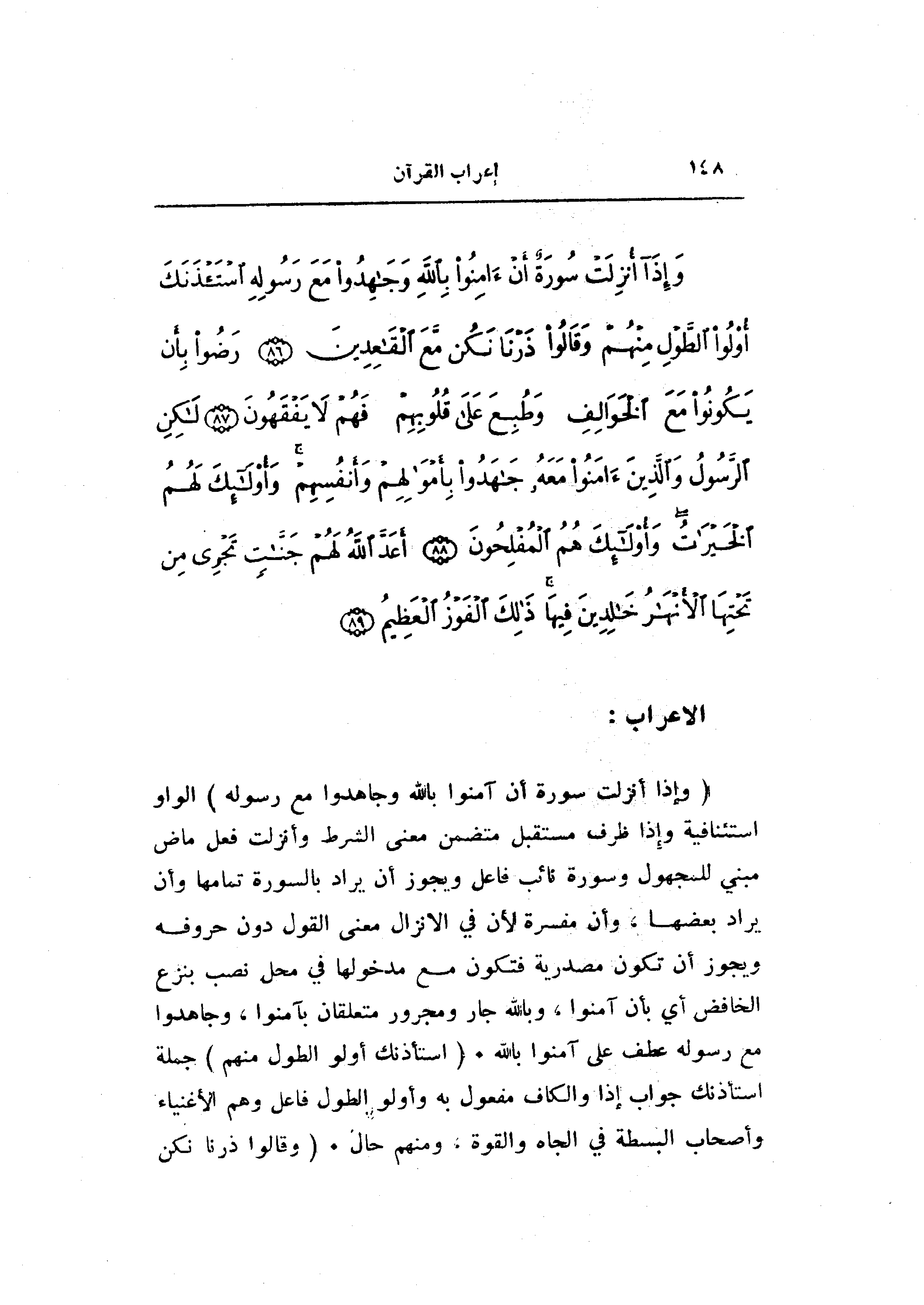 (وَإِذا أُنْزِلَتْ سُورَةٌ أَنْ آمِنُوا بِاللَّهِ وَجاهِدُوا مَعَ رَسُولِهِ) الواو استئنافية وإذا ظرف مستقبل متضمن معنى الشرط وأنزلت فعل ماض مبني للمجهول وسورة نائب فاعل ويجوز أن يراد بالسورة تمامها وأن يراد بعضها، وأن مفسرة لأن في الانزال معنى القول دون حروفه ويجوز أن تكون مصدرية فتكون مع مدخولها في محل نصب بنزع الخافض أي بأن آمنوا، وبالله جار ومجرور متعلقان بآمنوا، وجاهدوا مع رسوله عطف على آمنوا بالله. (اسْتَأْذَنَكَ أُولُوا الطَّوْلِ مِنْهُمْ) جملة استأذنك جواب إذا والكاف مفعول به وأولو الطول فاعل وهم الأغنياء وأصحاب البسطة في الجاه والقوة، ومنهم حال. (وَقالُوا ذَرْنا نَكُنْ