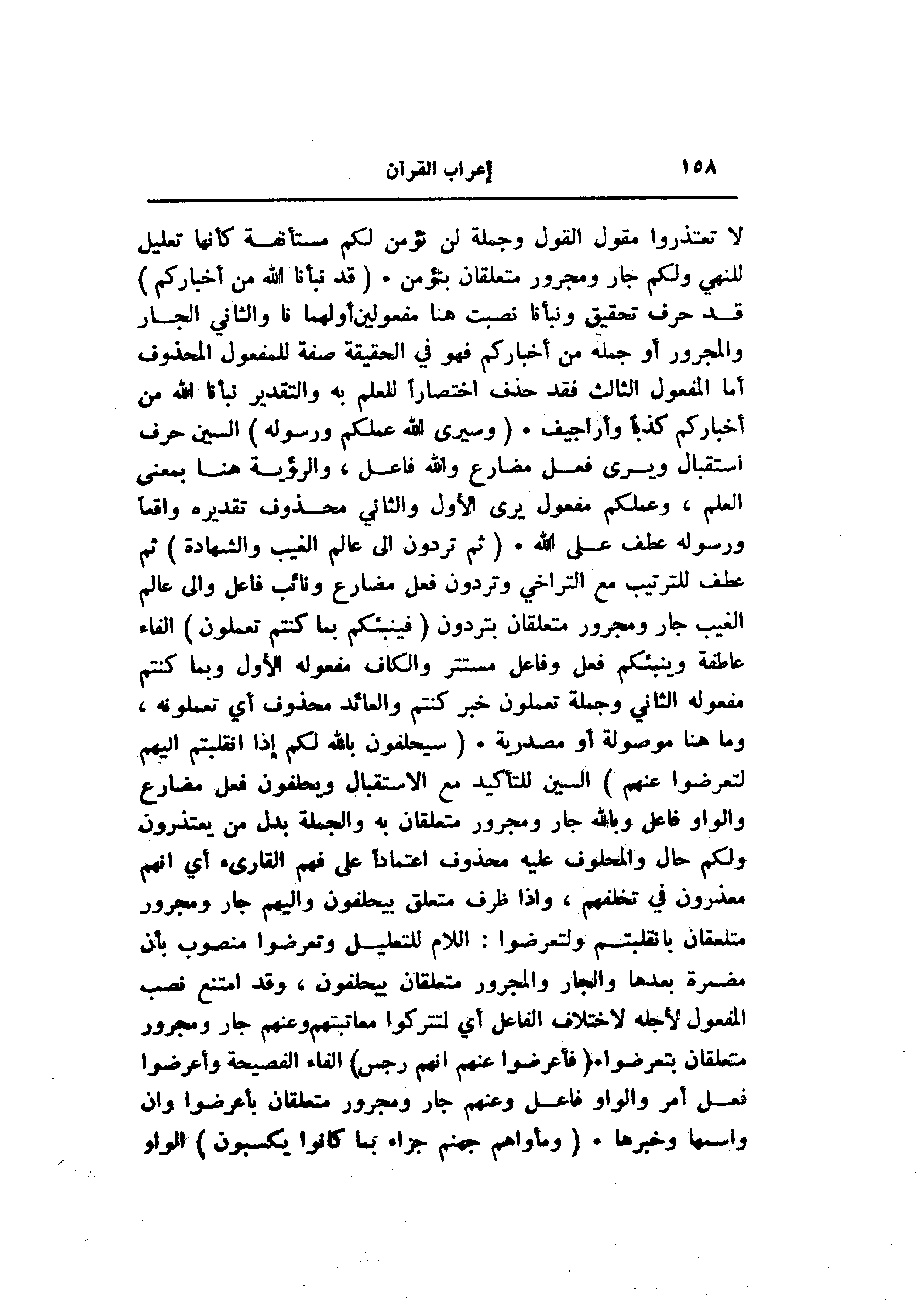 لا تعتذروا مقول القول وجملة لن نؤمن لكم مستأنفة كأنها تعليل للنهي ولكم جار ومجرور متعلقان بنؤمن. (قَدْ نَبَّأَنَا اللَّهُ مِنْ أَخْبارِكُمْ) قد حرف تحقيق ونبأنا نصبت هنا مفعولين أولهما نا والثاني الجار والمجرور أو جملة من أخباركم فهو في الحقيقة صفة للمفعول المحذوف أما المفعول الثالث فقد حذف اختصارا للعلم به والتقدير نبأنا الله من أخباركم كذبا وأراجيف. (وَسَيَرَى اللَّهُ عَمَلَكُمْ وَرَسُولُهُ) السين حرف استقبال ويرى فعل مضارع والله فاعل، والرؤية هنا بمعنى العلم، وعملكم مفعول يرى الأول والثاني محذوف تقديره واقعا ورسوله عطف على الله. (ثُمَّ تُرَدُّونَ إِلى عالِمِ الْغَيْبِ وَالشَّهادَةِ) ثم عطف للترتيب مع التراخي وتردون فعل مضارع ونائب فاعل والى عالم الغيب جار ومجرور متعلقان بتردون (فَيُنَبِّئُكُمْ بِما كُنْتُمْ تَعْمَلُونَ) الفاء عاطفة وينبئكم فعل وفاعل مستتر والكاف مفعوله الأول وبما كنتم مفعوله الثاني وجملة تعملون خبر كنتم والعائد محذوف أي تعملونه، وما هنا موصولة أو مصدرية. (سَيَحْلِفُونَ بِاللَّهِ لَكُمْ إِذَا انْقَلَبْتُمْ إِلَيْهِمْ لِتُعْرِضُوا عَنْهُمْ) السين للتأكيد مع الاستقبال ويحلفون فعل مضارع والواو فاعل وبالله جار ومجرور متعلقان به والجملة بدل من يعتذرون ولكم حال والمحلوف عليه محذوف اعتمادا على فهم القارئ أي انهم معذرون في تخلفهم، وإذا ظرف متعلق بيحلفون وإليهم جار ومجرور متعلقان بانقلبتم ولتعرضوا: اللام للتعليل وتعرضوا منصوب بأن مضمرة بعدها والجار والمجرور متعلقان بيحلفون، وقد امتنع نصب المفعول لأجله لاختلاف الفاعل أي لتتركوا معاتبتهم وعنهم جار ومجرور متعلقان بتعرضوا. (فَأَعْرِضُوا عَنْهُمْ إِنَّهُمْ رِجْسٌ) الفاء الفصيحة وأعرضوا فعل أمر والواو فاعل وعنهم جار ومجرور متعلقان بأعرضوا وان واسمها وخبرها. (وَمَأْواهُمْ جَهَنَّمُ جَزاءً بِما كانُوا يَكْسِبُونَ) الواو