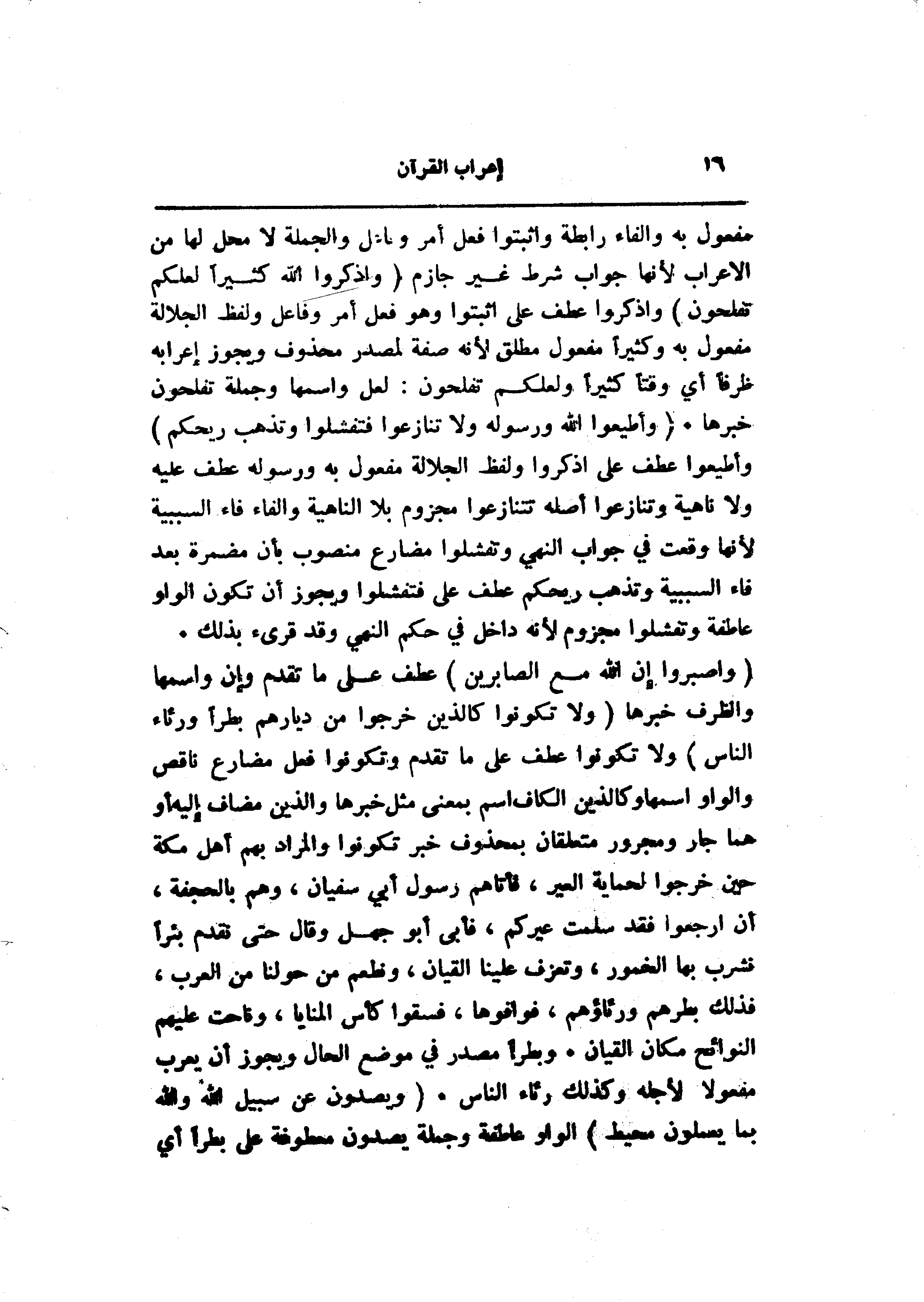 مفعول به والفاء رابطة واثبتوا فعل أمر وفاعل والجملة لا محل لها من الإعراب لأنها جواب شرط غير جازم (وَاذْكُرُوا اللَّهَ كَثِيراً لَعَلَّكُمْ تُفْلِحُونَ) واذكروا عطف على اثبتوا وهو فعل أمر وفاعل ولفظ الجلالة مفعول به وكثيرا مفعول مطلق لأنه صفة لمصدر محذوف ويجوز إعرابه ظرفا أي وقتا كثيرا ولعلكم تفلحون: لعل واسمها وجملة تفلحون خبرها. (وَأَطِيعُوا اللَّهَ وَرَسُولَهُ وَلا تَنازَعُوا فَتَفْشَلُوا وَتَذْهَبَ رِيحُكُمْ) وأطيعوا عطف على اذكروا ولفظ الجلالة مفعول به ورسوله عطف عليه ولا ناهية وتنازعوا أصله تتنازعوا مجزوم بلا الناهية والفاء فاء السببية لأنها وقعت في جواب النهي وتفشلوا مضارع منصوب بأن مضمرة بعد فاء السببية وتذهب ريحكم عطف على فتفشلوا ويجوز أن تكون الواو عاطفة وتفشلوا مجزوم لأنه داخل في حكم النهي وقد قرىء بذلك.