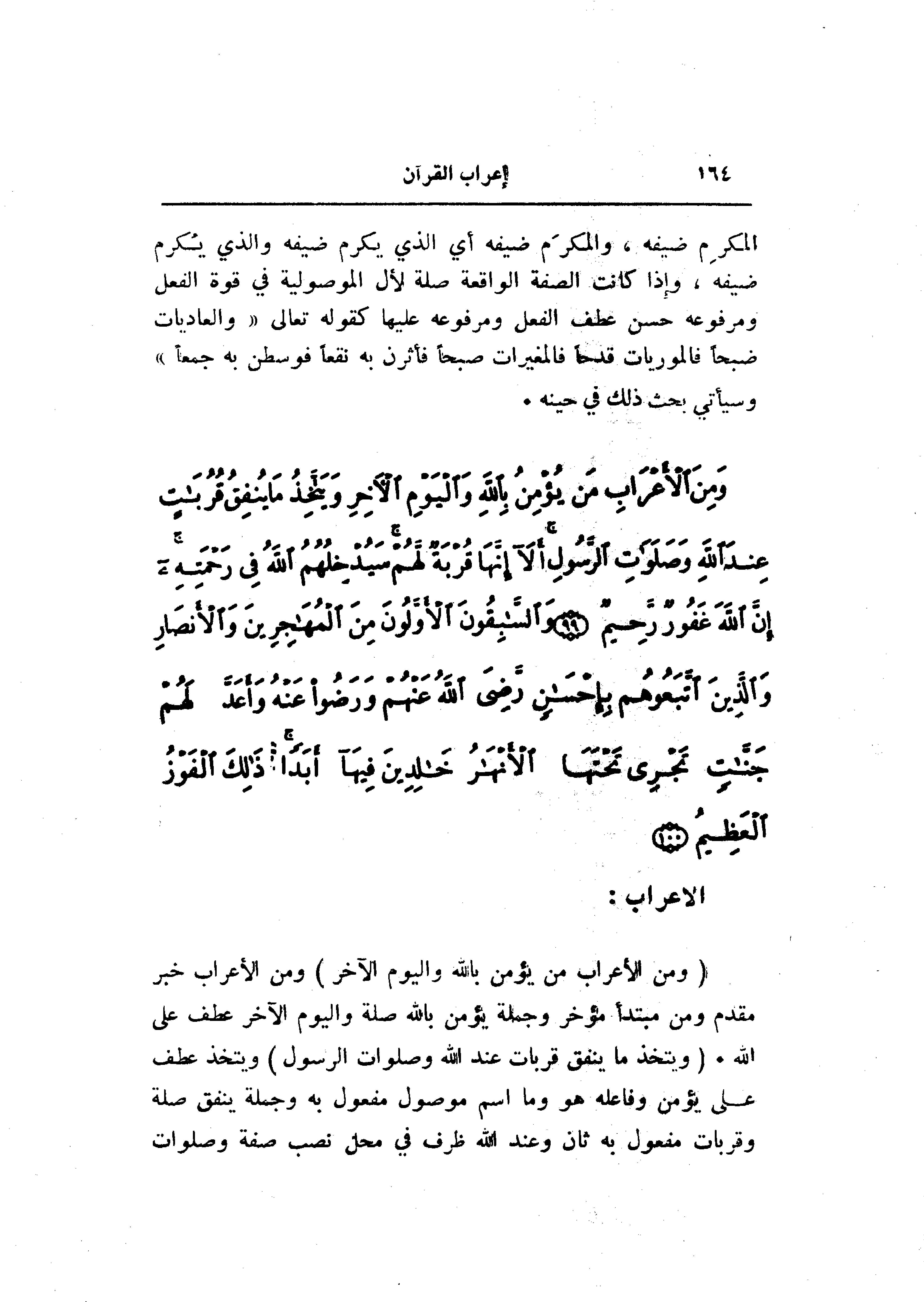 (وَمِنَ الْأَعْرابِ مَنْ يُؤْمِنُ بِاللَّهِ وَالْيَوْمِ الْآخِرِ) ومن الأعراب خبر مقدم ومن مبتدأ مؤخر وجملة يؤمن بالله صلة واليوم الآخر عطف على الله. (وَيَتَّخِذُ ما يُنْفِقُ قُرُباتٍ عِنْدَ اللَّهِ وَصَلَواتِ الرَّسُولِ) ويتخذ عطف على يؤمن وفاعله هو وما اسم موصول مفعول به وجملة ينفق صلة وقربات مفعول به ثان وعند الله ظرف في محل نصب صفة وصلوات