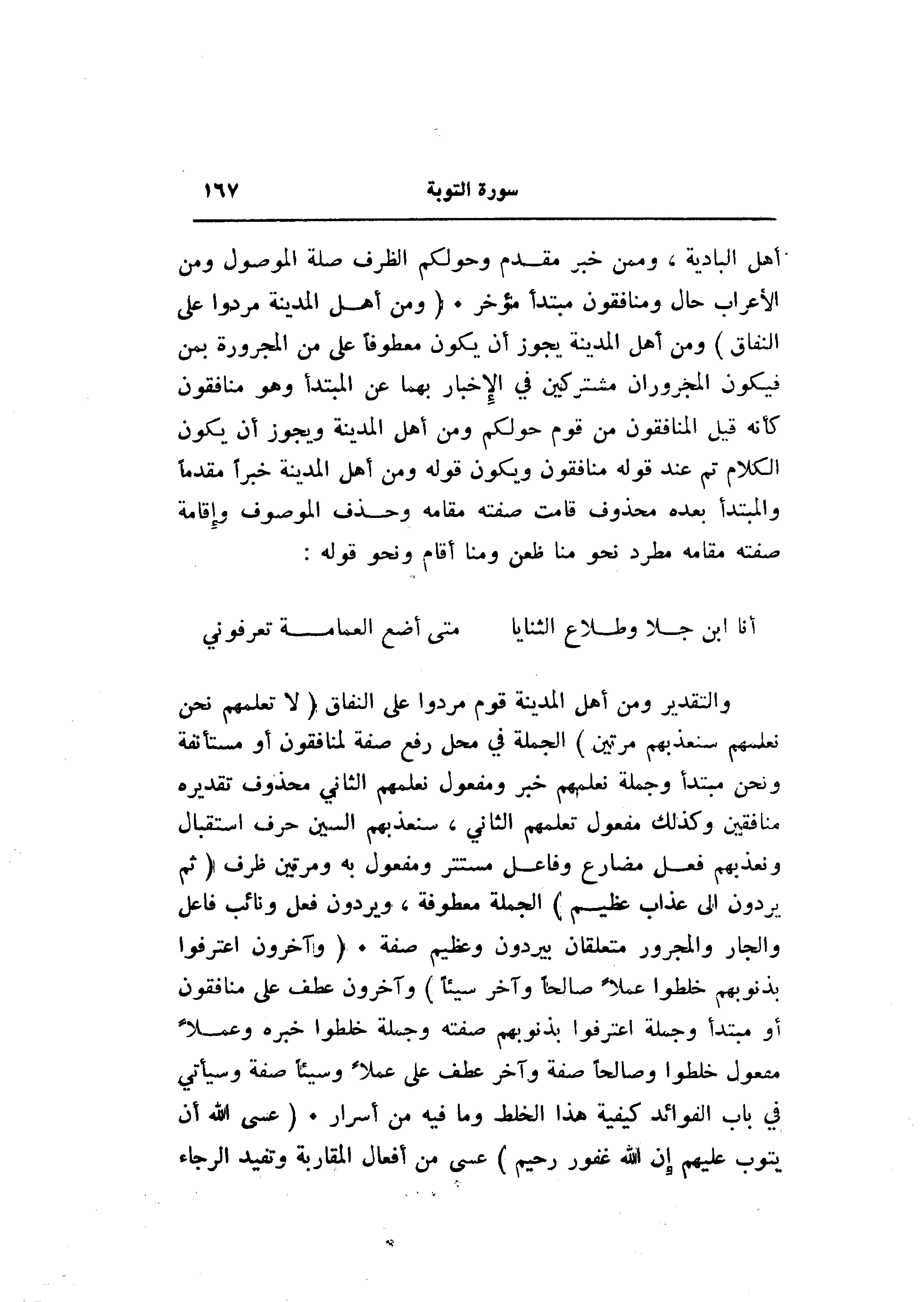 أهل البادية، وممن خبر مقدم وحولكم الظرف صلة الموصول ومن الأعراب حال ومنافقون مبتدأ مؤخر. (وَمِنْ أَهْلِ الْمَدِينَةِ مَرَدُوا عَلَى النِّفاقِ) ومن أهل المدينة يجوز أن يكون معطوفا على من المجرورة بمن فيكون المجروران مشتركين في الإخبار بهما عن المبتدأ وهو منافقون كأنه قيل المنافقون من قوم حولكم ومن أهل المدينة ويجوز أن يكون الكلام تم عند قوله منافقون ويكون قوله ومن أهل المدينة خبرا مقدما والمبتدأ بعده محذوف قامت صفته مقامه وحذف الموصوف وإقامة صفته مقامه مطرد نحو منا ظعن ومنا أقام ونحو قوله: