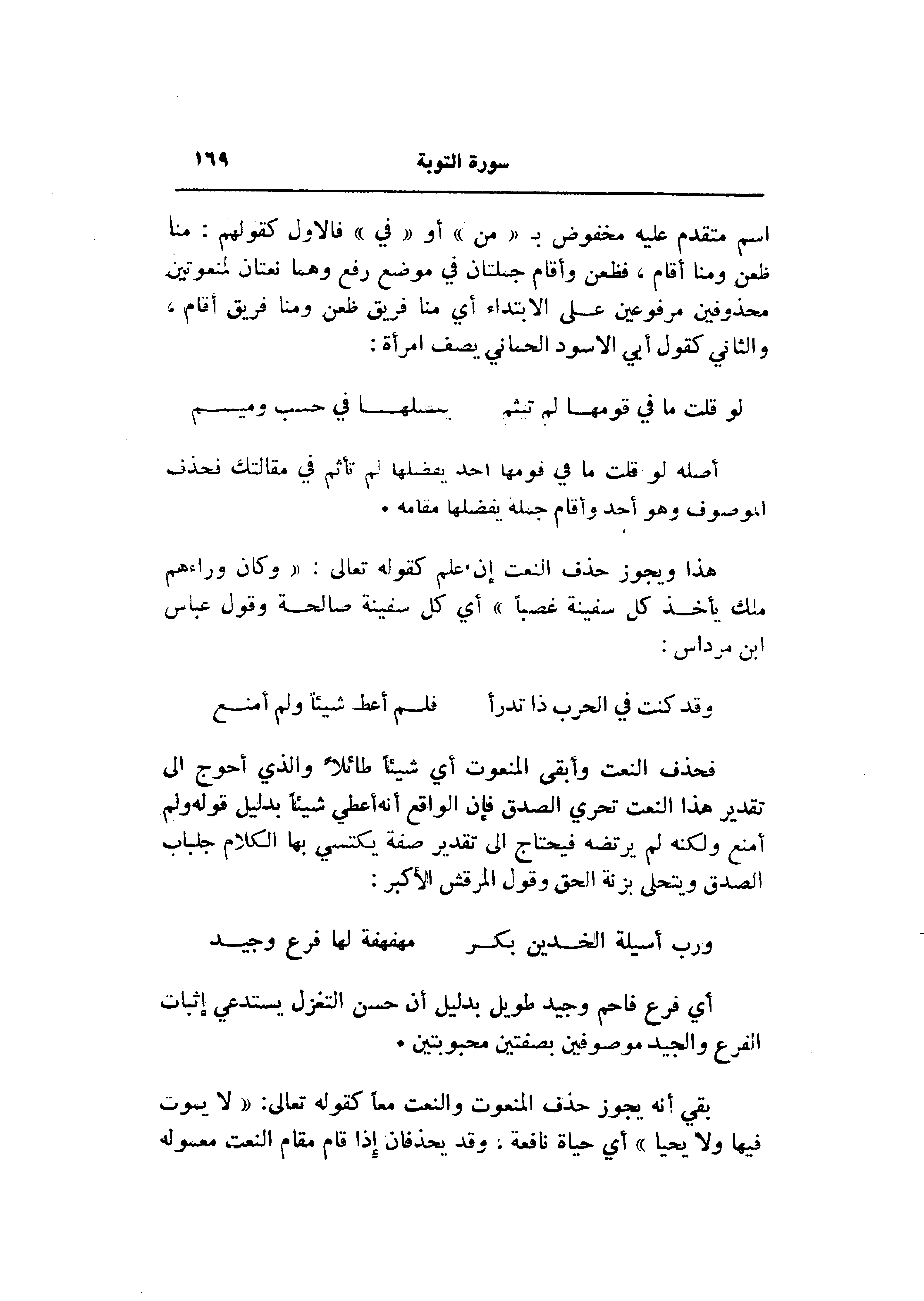 هذا ويجوز حذف النعت إن علم كقوله تعالى: «وكان وراءهم ملك يأخذ كل سفينة غصبا» أي كل سفينة صالحة وقول عباس ابن مرداس: