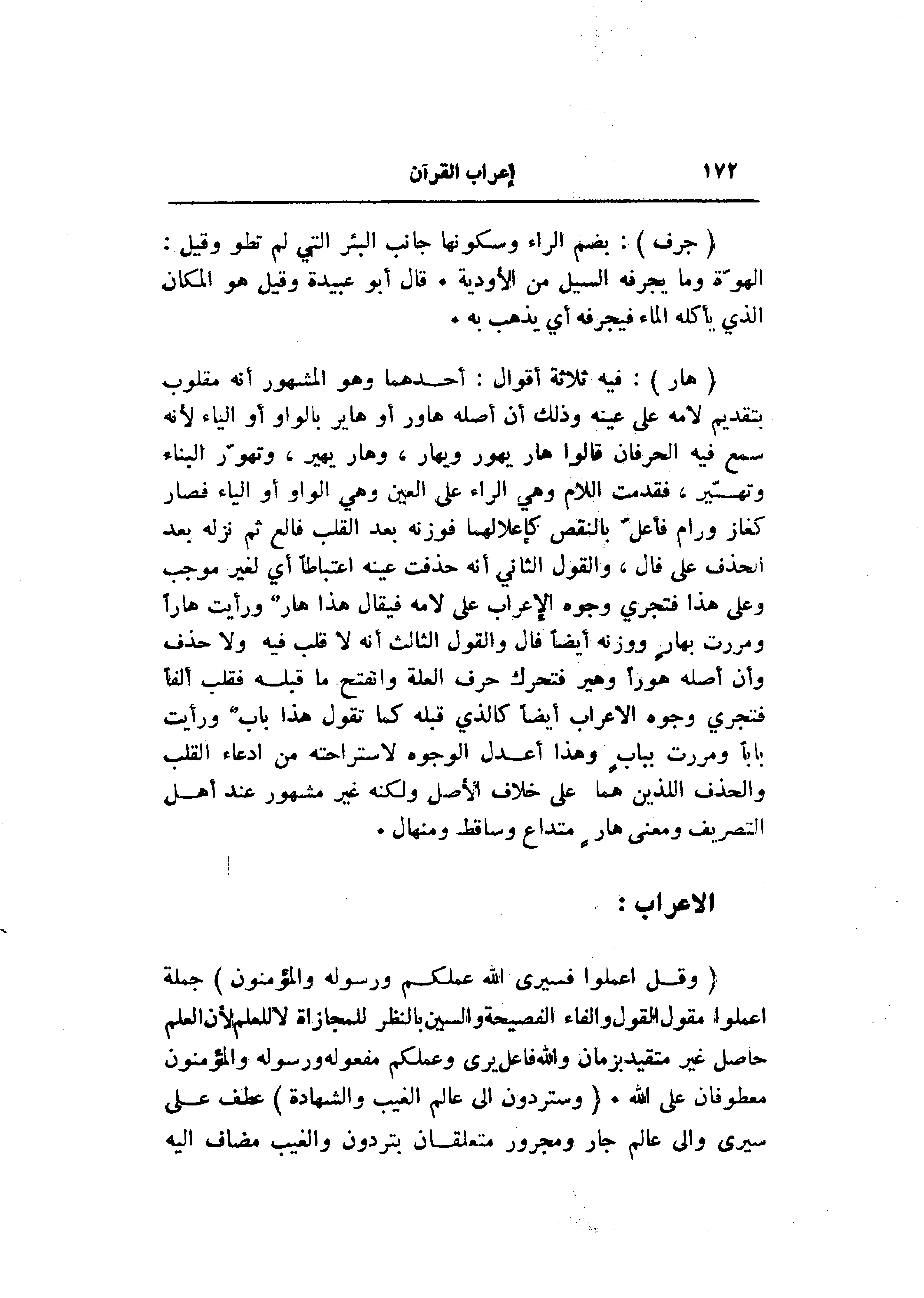 (هارٍ) : فيه ثلاثة أقوال: أحدهما وهو المشهور أنه مقلوب بتقديم لامه على عينه وذلك أن أصله هاور أو هاير بالواو أو الياء لأنه سمع فيه الحرفان قالوا هار يهور ويهار، وهار يهير، وتهوّر البناء وتهيّر، فقدمت اللام وهي الراء على العين وهي الواو أو الياء فصار كغاز ورام فأعلّ بالنقص كإعلالهما فوزنه بعد القلب فالع ثم نزله بعد الحذف على فال، والقول الثاني أنه حذفت عينه اعتباطا أي لغير موجب وعلى هذا فتجري وجوه الإعراب على لامه فيقال هذا هار ورأيت هارا ومررت بهار ووزنه أيضا فال والقول الثالث أنه لا قلب فيه ولا حذف وأن أصله هورا وهير فتحرك حرف العلة وانفتح ما قبله فقلب ألفا فتجري وجوه الاعراب أيضا كالذي قبله كما تقول هذا باب ورأيت بابا ومررت بباب وهذا أعدل الوجوه لاستراحته من ادعاء القلب والحذف اللذين هما على خلاف الأصل ولكنه غير مشهور عند أهل التصريف ومعنى هار متداع وساقط ومنهال.