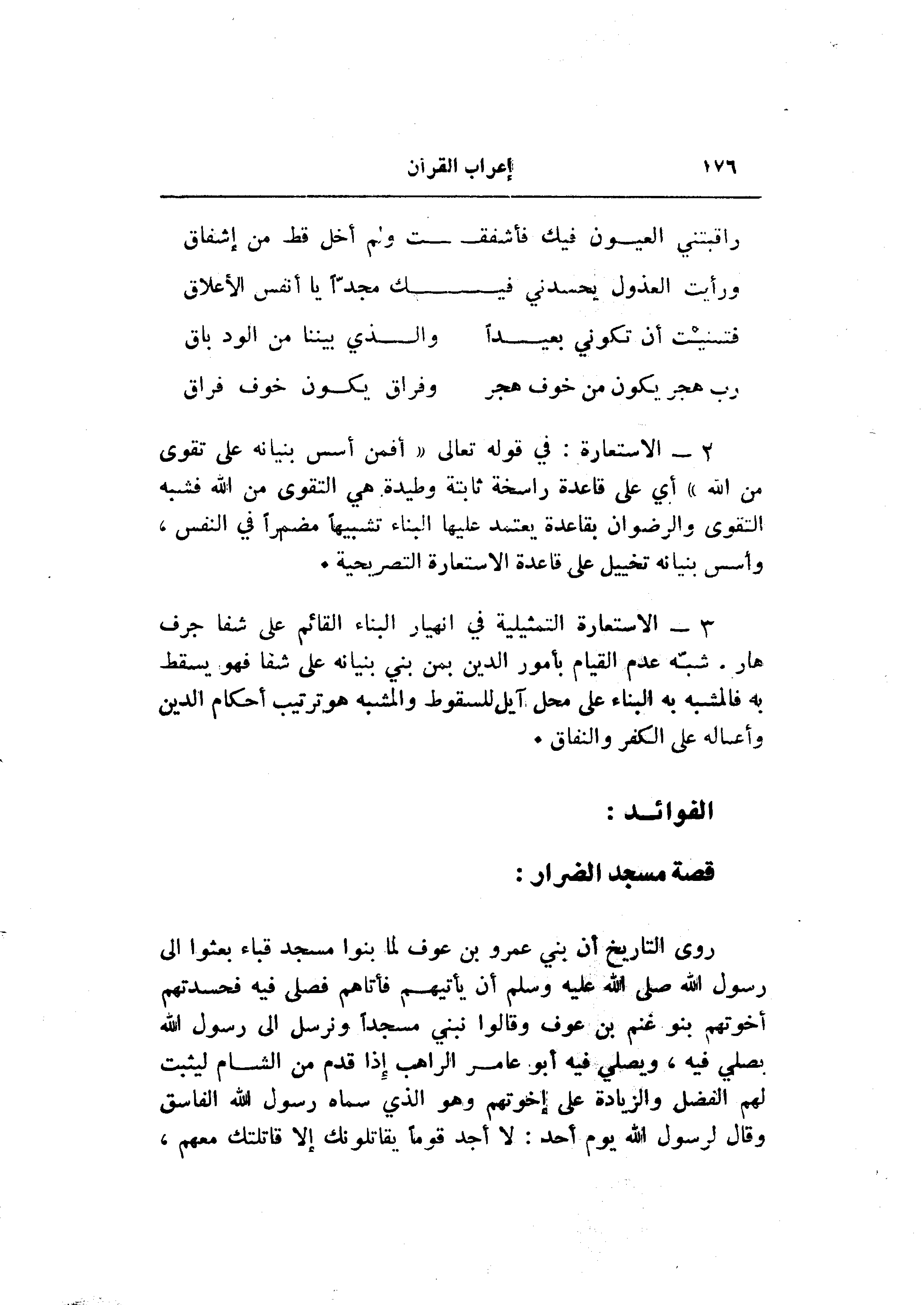 3- الاستعارة التمثيلية في انهيار البناء القائم على شفا جرف هار. شبّه عدم القيام بأمور الدين بمن بني بنيانه على شفا فهو يسقط به فالمشبه به البناء على محل آيل للسقوط والمشبه هو ترتيب أحكام الدين وأعماله على الكفر والنفاق.