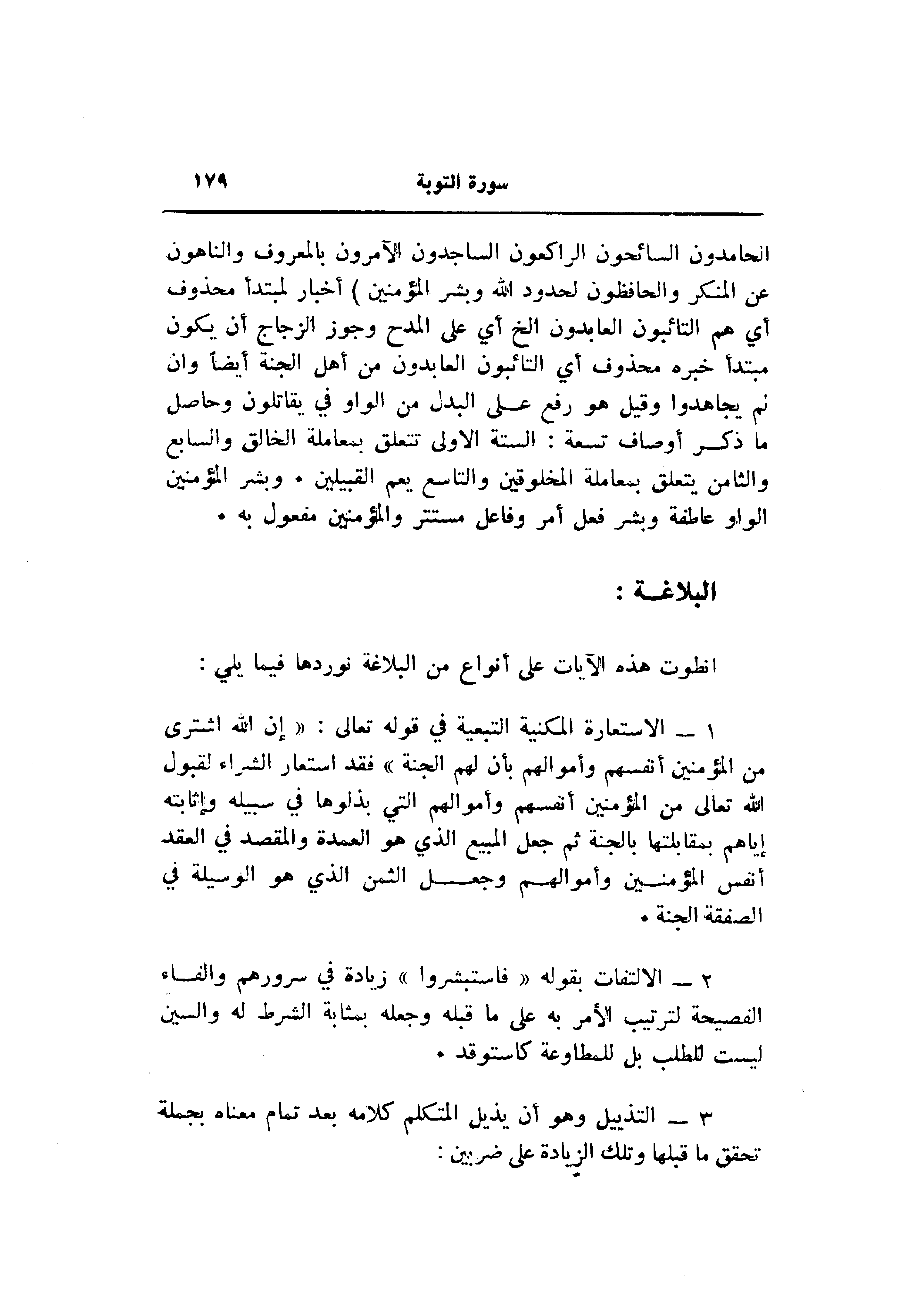 أخبار لمبتدأ محذوف أي هم التائبون العابدون إلخ أي على المدح وجوز الزجاج أن يكون مبتدأ خبره محذوف أي التائبون العابدون من أهل الجنة أيضا وان ثم يجاهدوا وقيل هو رفع على البدل من الواو في يقاتلون وحاصل ما ذكر أوصاف تسعة: الستة الاولى تتعلق بمعاملة الخالق والسابع والثامن يتعلق بمعاملة المخلوقين والتاسع يعم القبيلين. وبشر المؤمنين الواو عاطفة وبشر فعل أمر وفاعل مستتر والمؤمنين مفعول به.