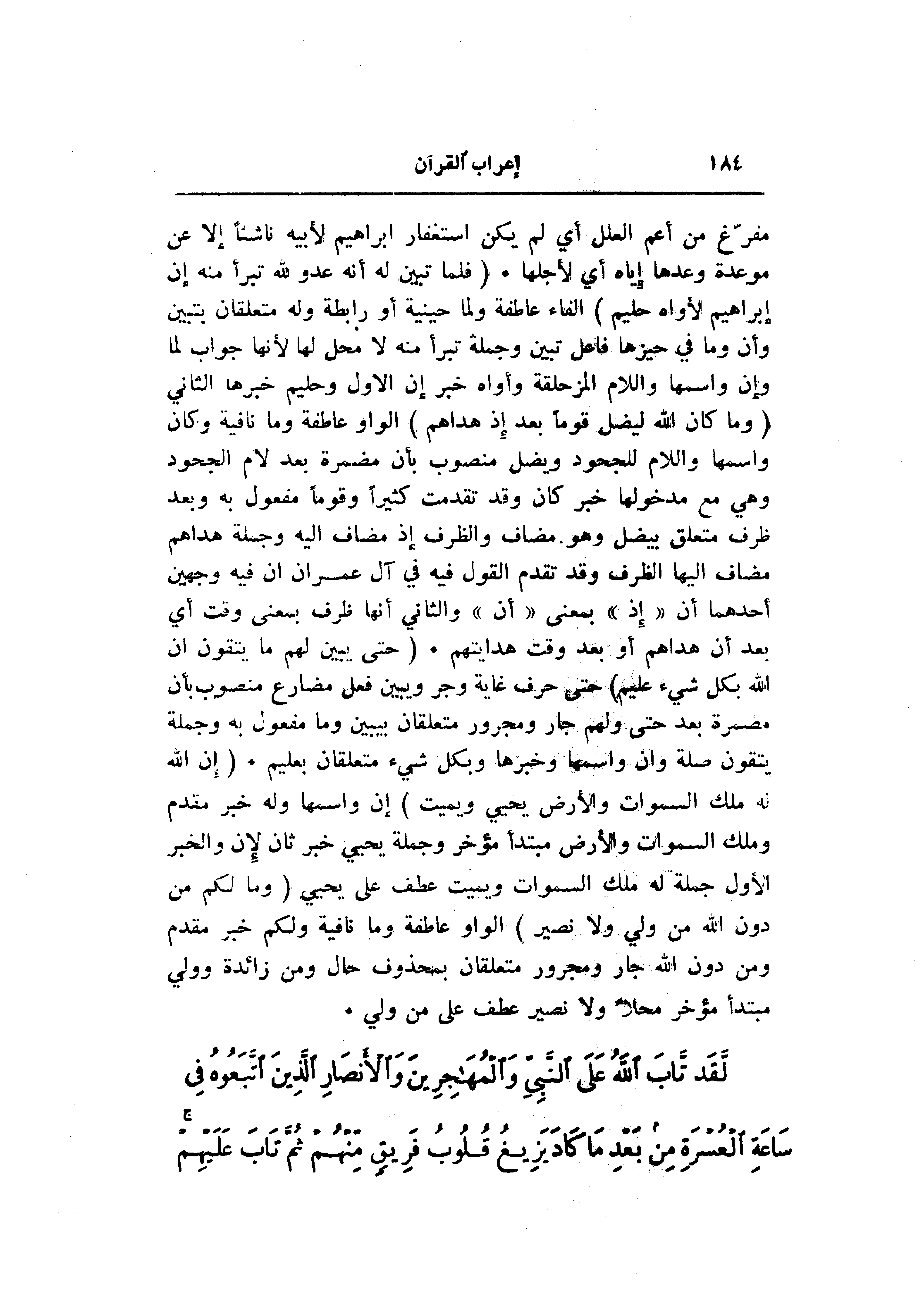 مفرّغ من أعم العلل أي لم يكن استغفار ابراهيم لأبيه ناشئا إلا عن موعدة وعدها إياه أي لأجلها. (فَلَمَّا تَبَيَّنَ لَهُ أَنَّهُ عَدُوٌّ لِلَّهِ تَبَرَّأَ مِنْهُ إِنَّ إِبْراهِيمَ لَأَوَّاهٌ حَلِيمٌ) الفاء عاطفة ولما حينية أو رابطة وله متعلقان بتبين وأن وما في حيزها فاعل تبين وجملة تبرأ منه لا محل لها لأنها جواب لما وإن واسمها واللام المزحلقة وأواه خبر إن الاول وحليم خبرها الثاني (وَما كانَ اللَّهُ لِيُضِلَّ قَوْماً بَعْدَ إِذْ هَداهُمْ) الواو عاطفة وما نافية وكان واسمها واللام للجحود ويضل منصوب بأن مضمرة بعد لام الجحود وهي مع مدخولها خبر كان وقد تقدمت كثيرا وقوما مفعول به وبعد ظرف متعلق بيضل وهو مضاف والظرف إذ مضاف اليه وجملة هداهم مضاف إليها الظرف وقد تقدم القول فيه في آل عمران ان فيه وجهين أحدهما أن «إذ» بمعنى «أن» والثاني أنها ظرف بمعنى وقت أي بعد أن هداهم أو بعد وقت هدايتهم. (حَتَّى يُبَيِّنَ لَهُمْ ما يَتَّقُونَ إِنَّ اللَّهَ بِكُلِّ شَيْءٍ عَلِيمٌ) حتى حرف غاية وجر ويبين فعل مضارع منصوب بأن مضمرة بعد حتى ولهم جار ومجرور متعلقان بيبين وما مفعول به وجملة يتقون صلة وان واسمها وخبرها وبكل شيء متعلقان بعليم. (إِنَّ اللَّهَ لَهُ مُلْكُ السَّماواتِ وَالْأَرْضِ يُحْيِي وَيُمِيتُ) إن واسمها وله خبر مقدم وملك السموات والأرض مبتدأ مؤخر وجملة يحيي خبر ثان لإن والخبر الأول جملة له ملك السموات ويميت عطف على يحيي (وَما لَكُمْ مِنْ دُونِ اللَّهِ مِنْ وَلِيٍّ وَلا نَصِيرٍ) الواو عاطفة وما نافية ولكم خبر مقدم ومن دون الله جار ومجرور متعلقان بمحذوف حال ومن زائدة وولي مبتدأ مؤخر محلا ولا نصير عطف على من ولي.