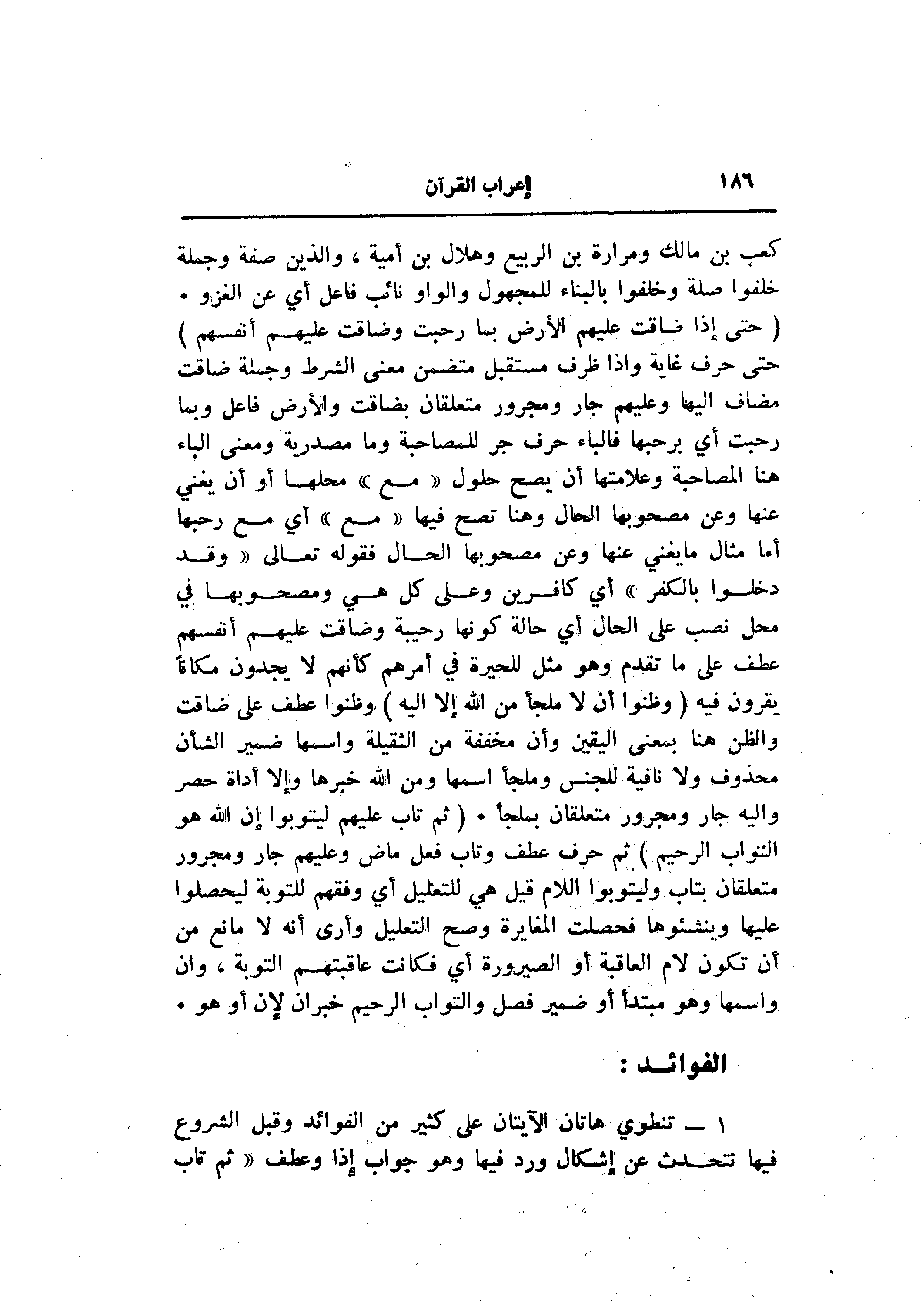 (حَتَّى إِذا ضاقَتْ عَلَيْهِمُ الْأَرْضُ بِما رَحُبَتْ وَضاقَتْ عَلَيْهِمْ أَنْفُسُهُمْ) حتى حرف غاية وإذا ظرف مستقبل متضمن معنى الشرط وجملة ضاقت مضاف إليها وعليهم جار ومجرور متعلقان بضاقت والأرض فاعل وبما رحبت أي برحبها فالباء حرف جر للمصاحبة وما مصدرية ومعنى الباء هنا المصاحبة وعلامتها أن يصح حلول «مع» محلها أو أن يغني عنها وعن مصحوبها الحال وهنا تصح فيها «مع» أي مع رحبها أما مثال ما يغني عنها وعن مصحوبها الحال فقوله تعالى «وقد دخلوا بالكفر» أي كافرين وعلى كل هي ومصحوبها في محل نصب على الحال أي حالة كونها رحيبة وضاقت عليهم أنفسهم عطف على ما تقدم وهو مثل للحيرة في أمرهم كأنهم لا يجدون مكانا يقرون فيه (وَظَنُّوا أَنْ لا مَلْجَأَ مِنَ اللَّهِ إِلَّا إِلَيْهِ) وظنوا عطف على ضاقت والظن هنا بمعنى اليقين وأن مخففة من الثقيلة واسمها ضمير الشأن محذوف ولا نافية للجنس وملجأ اسمها ومن الله خبرها وإلا أداة حصر واليه جار ومجرور متعلقان بملجأ. (ثُمَّ تابَ عَلَيْهِمْ لِيَتُوبُوا إِنَّ اللَّهَ هُوَ التَّوَّابُ الرَّحِيمُ) ثم حرف عطف وتاب فعل ماض وعليهم جار ومجرور متعلقان بتاب وليتوبوا اللام قيل هي للتعليل أي وفقهم للتوبة ليحصلوا عليها وينشئوها فحصلت المغايرة وصح التعليل وأرى أنه لا مانع من أن تكون لام العاقبة أو الصيرورة أي فكانت عاقبتهم التوبة، وان واسمها وهو مبتدأ أو ضمير فصل والتواب الرحيم خبر ان لإن أو هو.