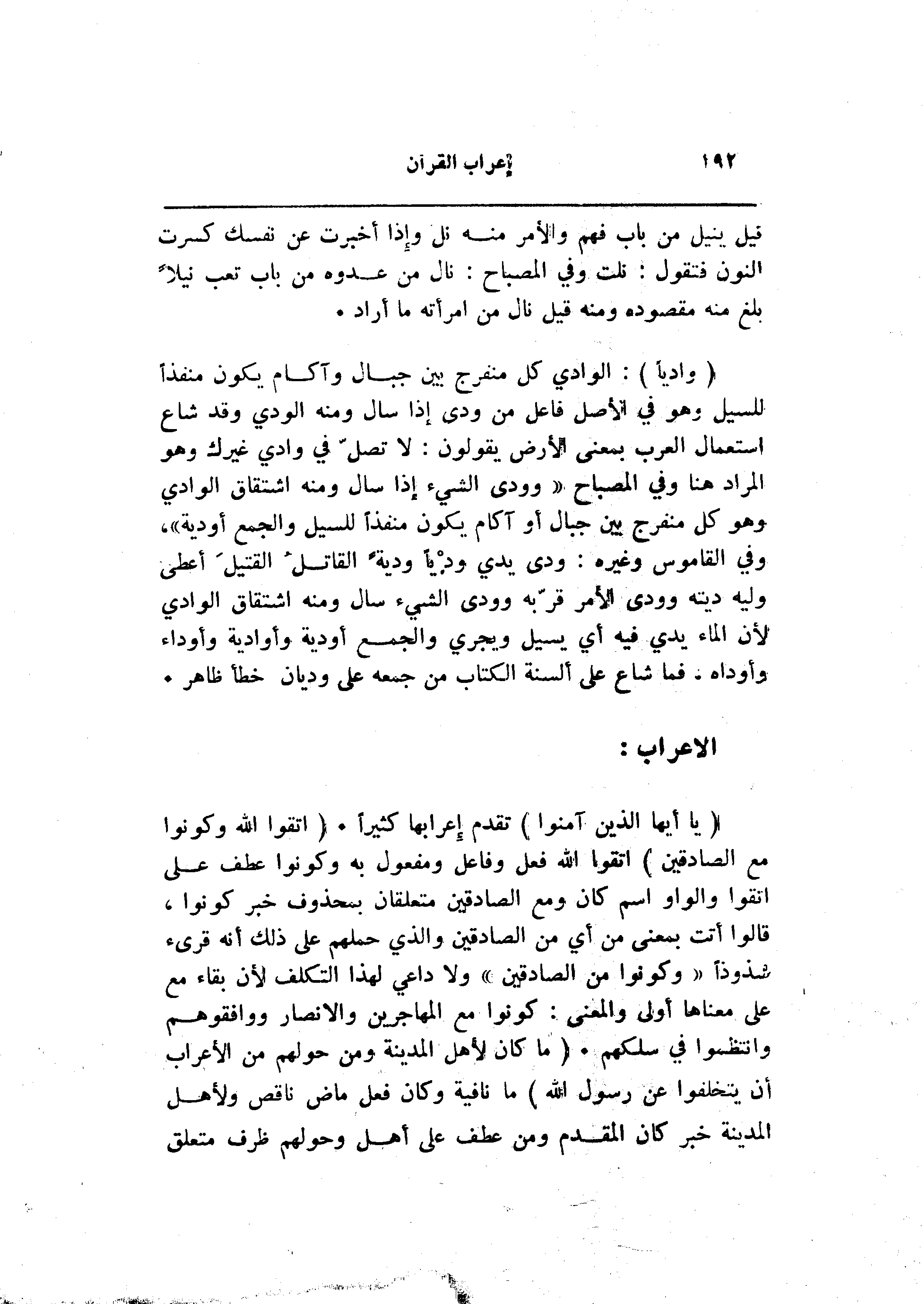 (يا أَيُّهَا الَّذِينَ آمَنُوا) تقدم إعرابها كثيرا. (اتَّقُوا اللَّهَ وَكُونُوا مَعَ الصَّادِقِينَ) اتقوا الله فعل وفاعل ومفعول به وكونوا عطف على اتقوا والواو اسم كان ومع الصادقين متعلقان بمحذوف خبر كونوا، قالوا أتت بمعنى من أي من الصادقين والذي حملهم على ذلك أنه قرىء شذوذا «وكونوا من الصادقين» ولا داعي لهذا التكلف لأن بقاء مع على معناها أولى والمعنى: كونوا مع المهاجرين والأنصار ووافقوهم وانتظموا في سلكهم. (ما كانَ لِأَهْلِ الْمَدِينَةِ وَمَنْ حَوْلَهُمْ مِنَ الْأَعْرابِ أَنْ يَتَخَلَّفُوا عَنْ رَسُولِ اللَّهِ) ما نافية وكان فعل ماض ناقص ولأهل المدينة خبر كان المقدم ومن عطف على أهل وحولهم ظرف متعلق