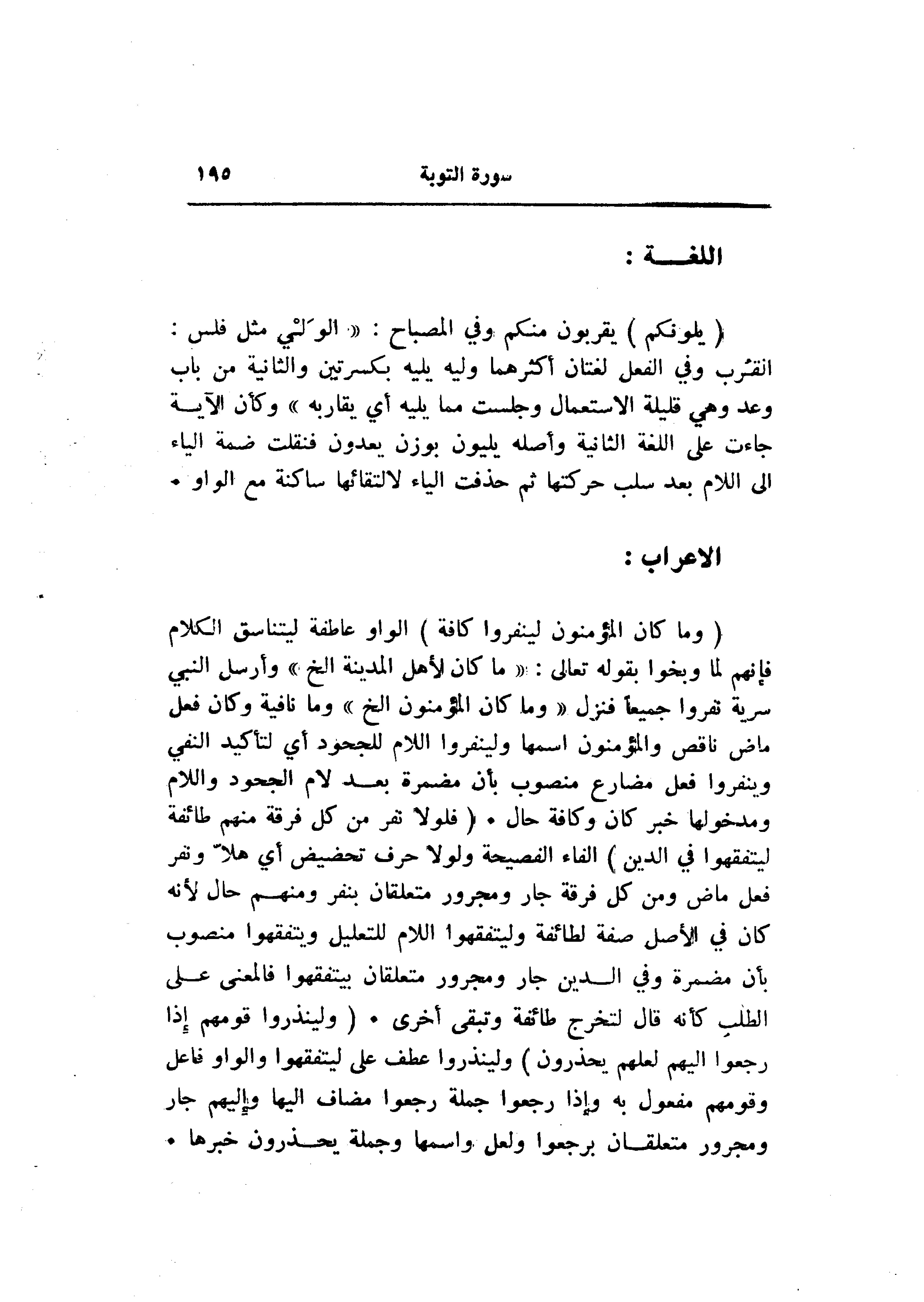(وَما كانَ الْمُؤْمِنُونَ لِيَنْفِرُوا كَافَّةً) الواو عاطفة ليتناسق الكلام فإنهم لما وبخوا بقوله تعالى: «ما كان لأهل المدينة إلخ» وأرسل النبي سرية نفروا جميعا فنزل «وما كان المؤمنون إلخ» وما نافية وكان فعل ماض ناقص والمؤمنون اسمها ولينفروا اللام للجحود أي لتأكيد النفي وينفروا فعل مضارع منصوب بأن مضمرة بعد لام الجحود واللام ومدخولها خبر كان وكافة حال. (فَلَوْلا نَفَرَ مِنْ كُلِّ فِرْقَةٍ مِنْهُمْ طائِفَةٌ لِيَتَفَقَّهُوا فِي الدِّينِ) الفاء الفصيحة ولولا حرف تحضيض أي هلّا ونفر فعل ماض ومن كل فرقة جار ومجرور متعلقان بنفر ومنهم حال لأنه كان في الأصل صفة لطائفة وليتفقهوا اللام للتعليل ويتفقهوا منصوب بأن مضمرة وفي الدين جار ومجرور متعلقان بيتفقهوا فالمعنى على الطلب كأنه قال لتخرج طائفة وتبقى أخرى. (وَلِيُنْذِرُوا قَوْمَهُمْ إِذا رَجَعُوا إِلَيْهِمْ لَعَلَّهُمْ يَحْذَرُونَ) ولينذروا عطف على ليتفقهوا والواو فاعل وقومهم مفعول به وإذا رجعوا جملة رجعوا مضاف إليها وإليهم جار ومجرور متعلقان برجعوا ولعل واسمها وجملة يحذرون خبرها.