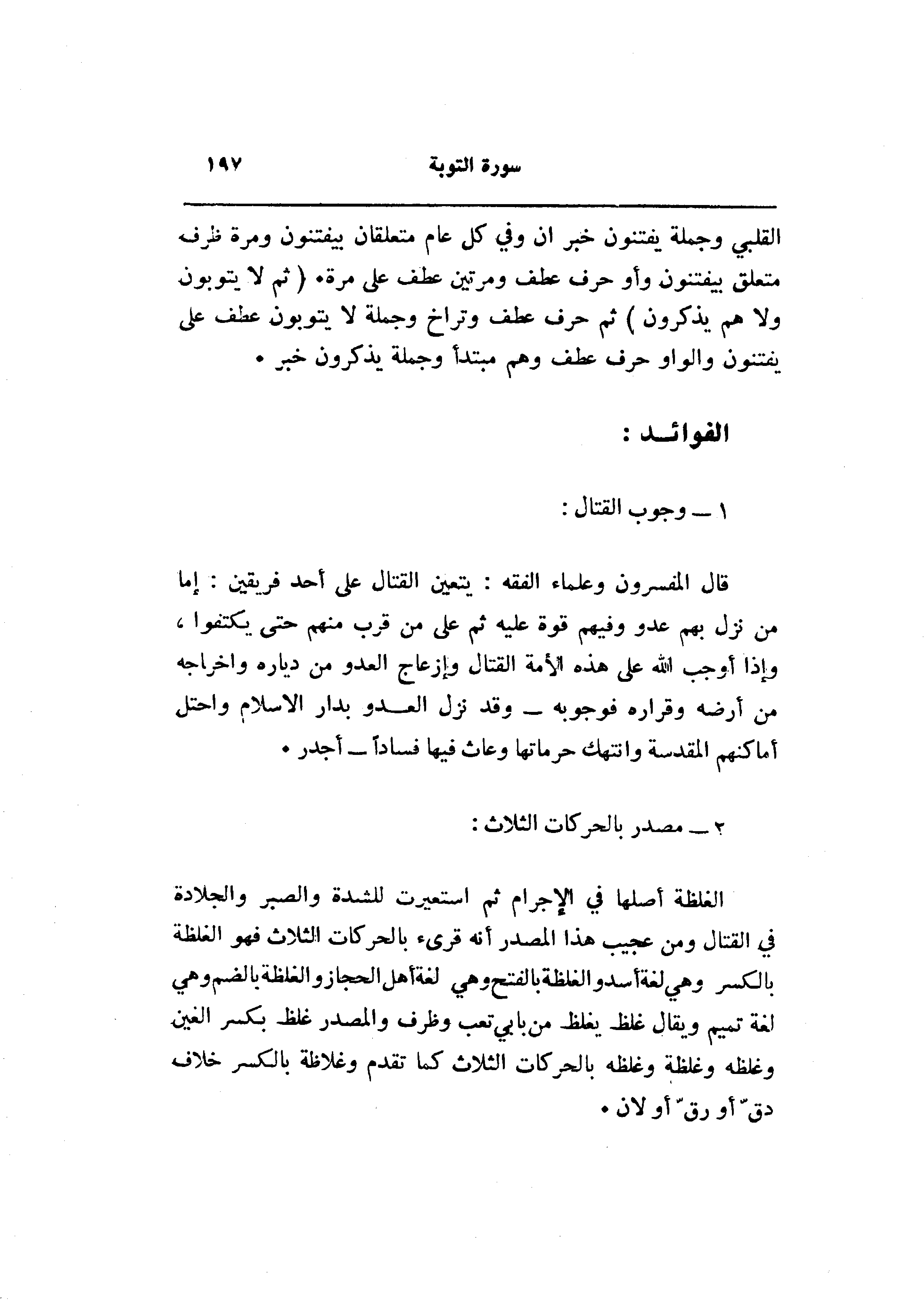 قال المفسرون وعلماء الفقه: يتعين القتال على أحد فريقين: إما من نزل بهم عدو وفيهم قوة عليه ثم على من قرب منهم حتى يكتفوا، وإذا أوجب الله على هذه الأمة القتال وإزعاج العدو من دياره وإخراجه من أرضه وقراره فوجوبه- وقد نزل العدو بدار الإسلام واحتل أماكنهم المقدسة وانتهك حرماتها وعاث فيها فسادا- أجدر.
