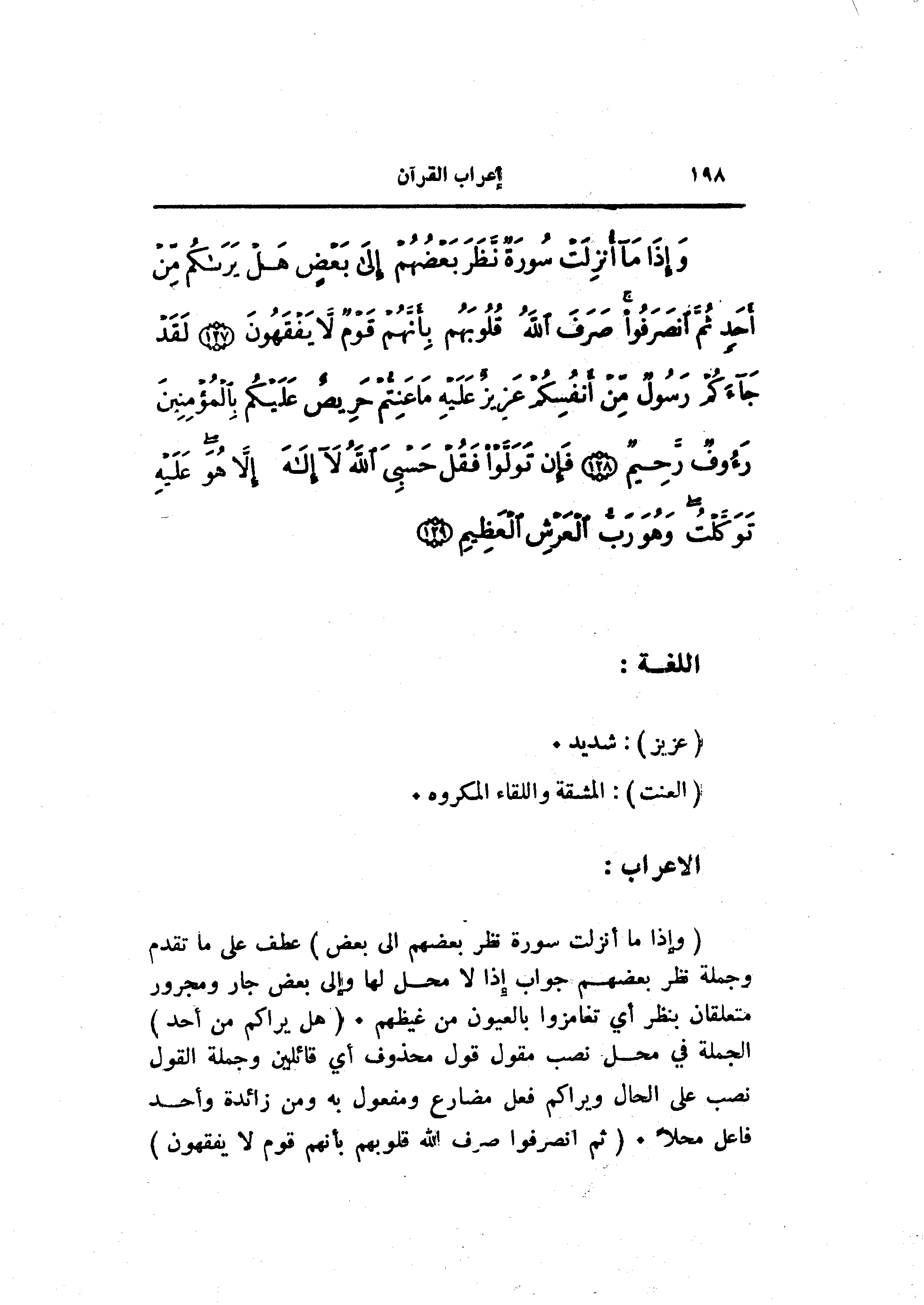 (وَإِذا ما أُنْزِلَتْ سُورَةٌ نَظَرَ بَعْضُهُمْ إِلى بَعْضٍ) عطف على ما تقدم وجملة نظر بعضهم جواب إذا لا محل لها وإلى بعض جار ومجرور متعلقان بنظر أي تغامزوا بالعيون من غيظهم. (هَلْ يَراكُمْ مِنْ أَحَدٍ) الجملة في محل نصب مقول قول محذوف أي قائلين وجملة القول نصب على الحال ويراكم فعل مضارع ومفعول به ومن زائدة وأحد فاعل محلا. (ثُمَّ انْصَرَفُوا صَرَفَ اللَّهُ قُلُوبَهُمْ بِأَنَّهُمْ قَوْمٌ لا يَفْقَهُونَ)