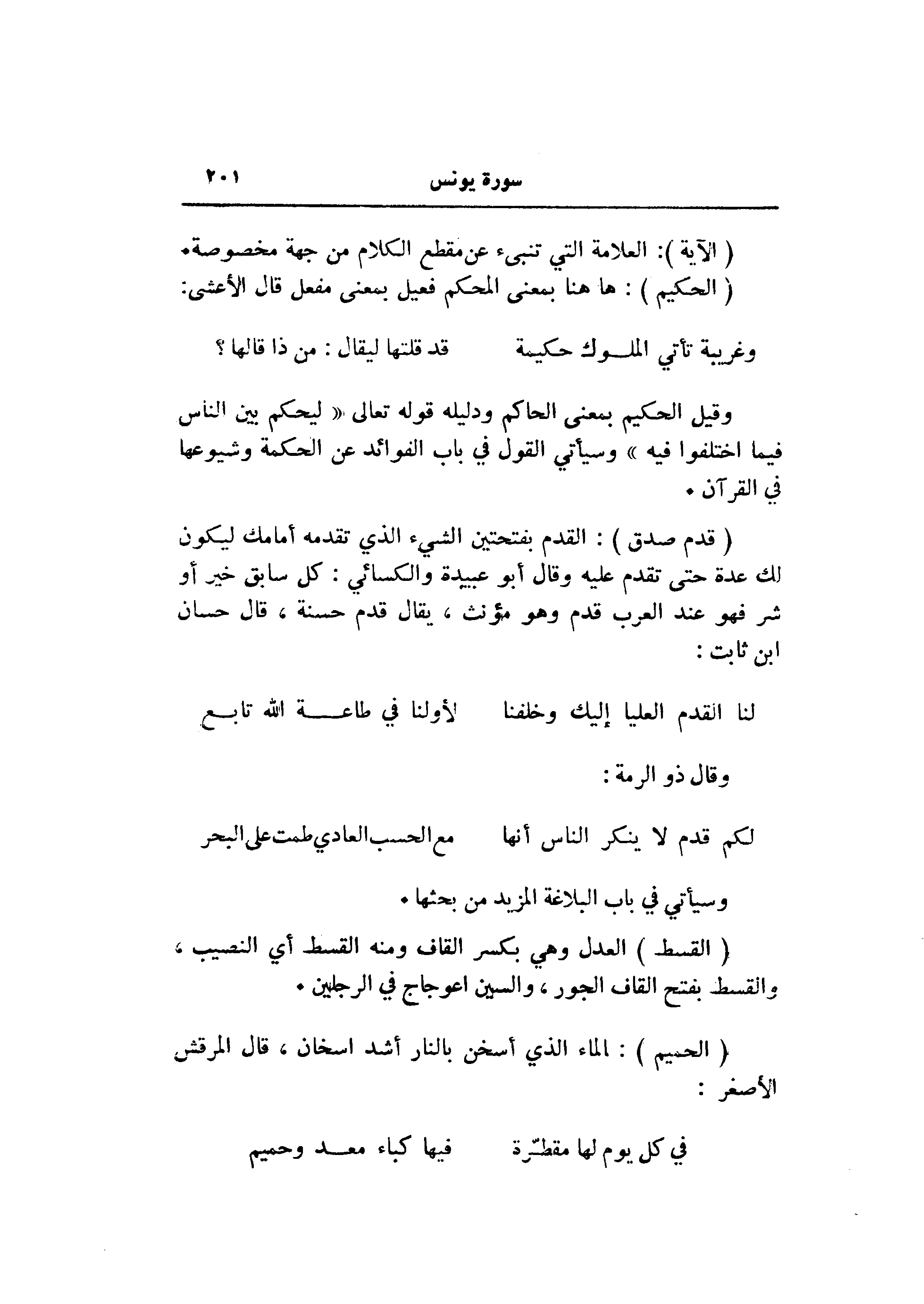 وقيل الحكيم بمعنى الحاكم ودليله قوله تعالى «ليحكم بين الناس فيما اختلفوا فيه» وسيأتي القول في باب الفوائد عن الحكمة وشيوعها في القرآن.