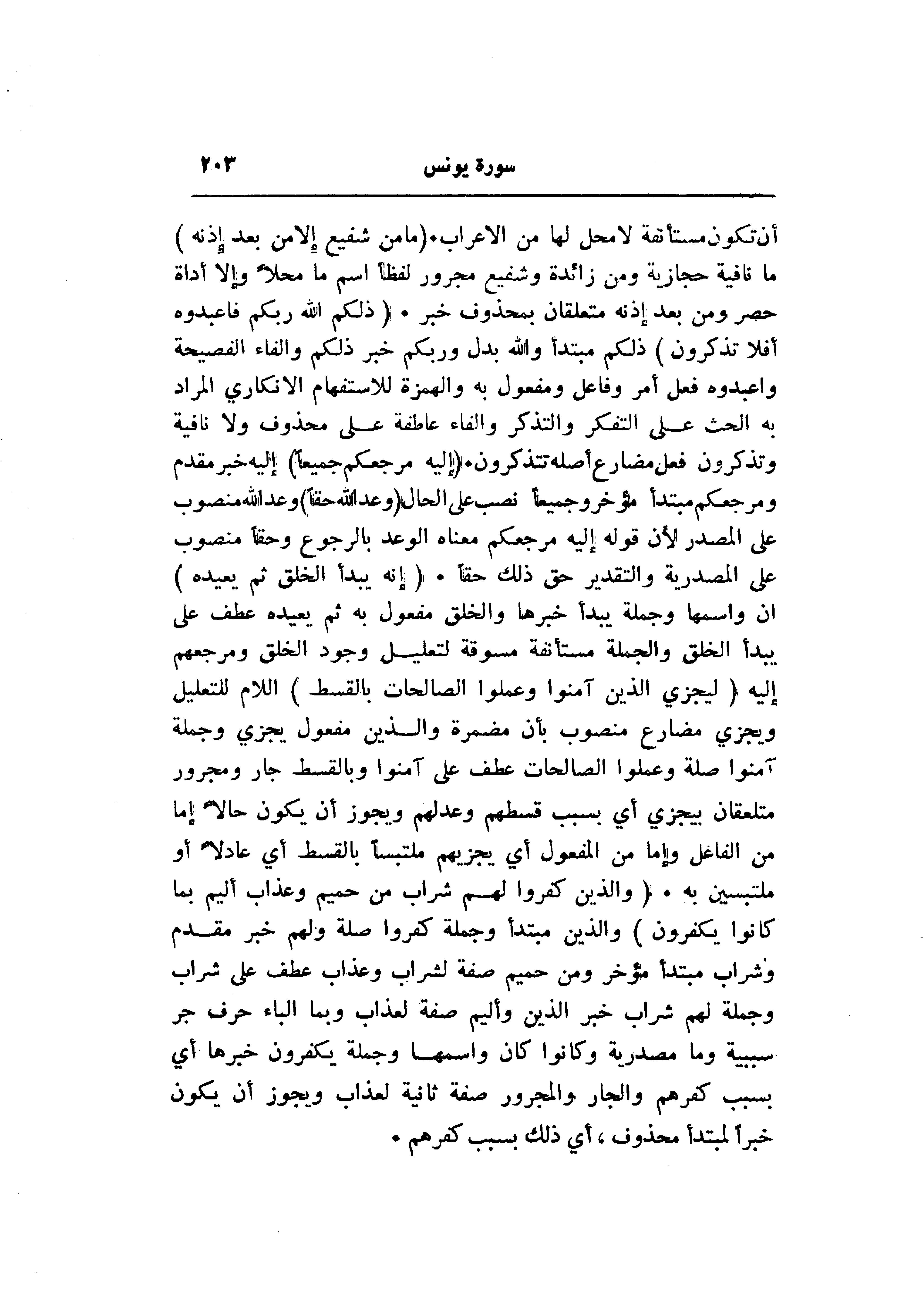 أن تكون مستأنفة لا محل لها من الإعراب. (ما مِنْ شَفِيعٍ إِلَّا مِنْ بَعْدِ إِذْنِهِ) ما نافية حجازية ومن زائدة وشفيع مجرور لفظا اسم ما محلا وإلا أداة حصر ومن بعد إذنه متعلقان بمحذوف خبر. (ذلِكُمُ اللَّهُ رَبُّكُمْ فَاعْبُدُوهُ أَفَلا تَذَكَّرُونَ) ذلكم مبتدأ والله بدل وربكم خبر ذلكم والفاء الفصيحة واعبدوه فعل أمر وفاعل ومفعول به والهمزة للاستفهام الانكاري المراد به الحث على التفكر والتذكر والفاء عاطفة على محذوف ولا نافية وتذكرون فعل مضارع أصله تتذكرون. (إِلَيْهِ مَرْجِعُكُمْ جَمِيعاً) إليه خبر مقدم ومرجعكم مبتدأ مؤخر وجميعا نصب على الحال (وَعْدَ اللَّهِ حَقًّا) وعد الله منصوب على المصدر لأن قوله إليه مرجعكم معناه الوعد بالرجوع وحقا منصوب على المصدرية والتقدير حق ذلك حقا. (إِنَّهُ يَبْدَؤُا الْخَلْقَ ثُمَّ يُعِيدُهُ) ان واسمها وجملة يبدأ خبرها والخلق مفعول به ثم يعيده عطف على يبدأ الخلق والجملة مستأنفة مسوقة لتعليل وجود الخلق ومرجعهم إليه (لِيَجْزِيَ الَّذِينَ آمَنُوا وَعَمِلُوا الصَّالِحاتِ بِالْقِسْطِ) اللام للتعليل ويجزي مضارع منصوب بأن مضمرة والذين مفعول يجزي وجملة آمنوا صلة وعملوا الصالحات عطف على آمنوا وبالقسط جار ومجرور متعلقان بيجزي أي بسبب قسطهم وعدلهم ويجوز أن يكون حالا إما من الفاعل وإما من المفعول أي يجزيهم ملتبسا بالقسط أي عادلا أو ملتبسين به. (وَالَّذِينَ كَفَرُوا لَهُمْ شَرابٌ مِنْ حَمِيمٍ وَعَذابٌ أَلِيمٌ بِما كانُوا يَكْفُرُونَ) والذين مبتدأ وجملة كفروا صلة ولهم خبر مقدم وشراب مبتدأ مؤخر ومن حميم صفة لشراب وعذاب عطف على شراب وجملة لهم شراب خبر الذين وأليم صفة لعذاب وبما الباء حرف جر سببية وما مصدرية وكانوا كان واسمها وجملة يكفرون خبرها أي بسبب كفرهم والجار والمجرور صفة ثانية لعذاب ويجوز أن يكون خبرا لمبتدأ محذوف، أي ذلك بسبب كفرهم.