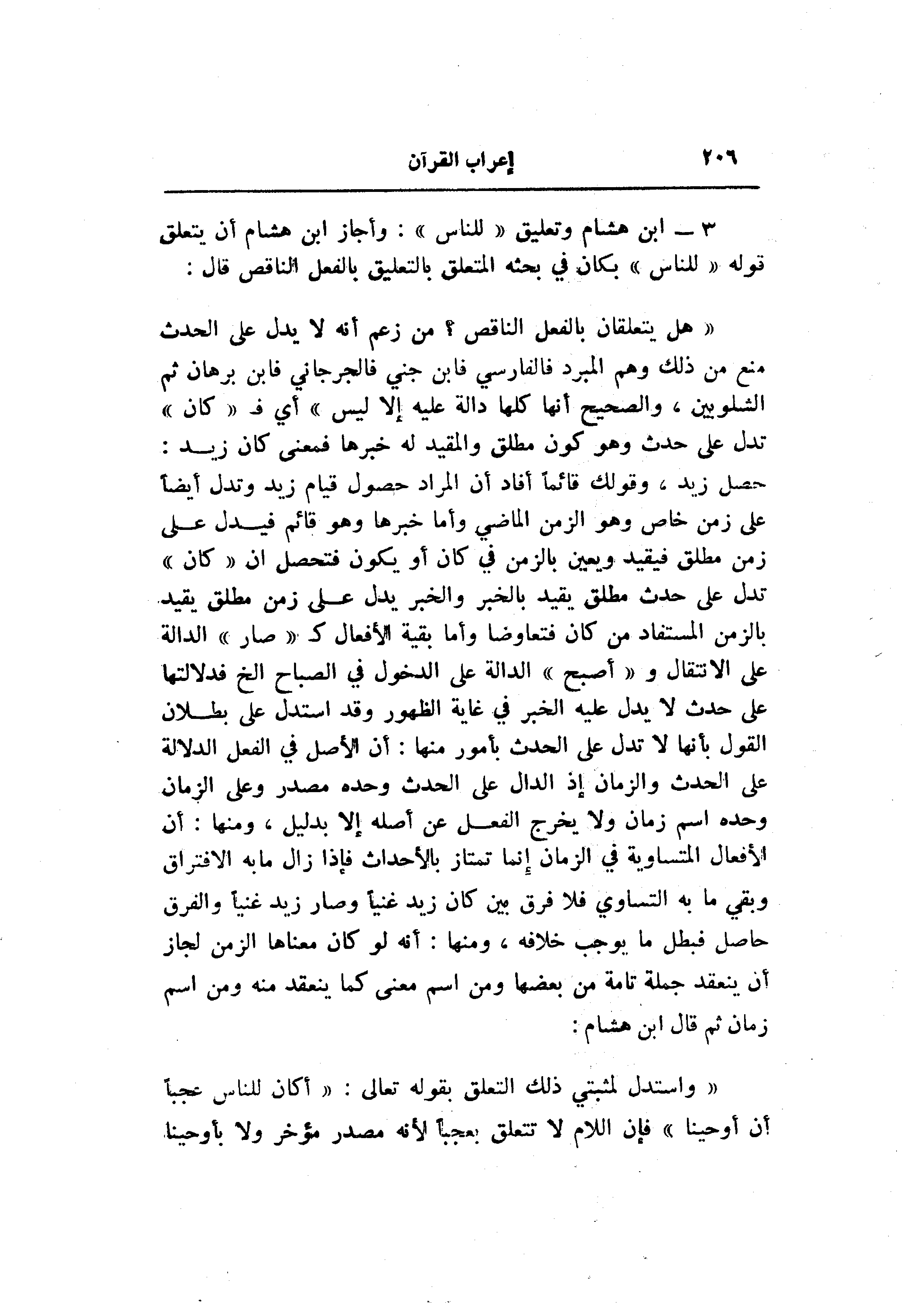 «واستدل لمثبتي ذلك التعلق بقوله تعالى: «أكان للناس عجبا أن أوحينا» فإن اللام لا تتعلق بعجبا لأنه مصدر مؤخر ولا بأوحينا