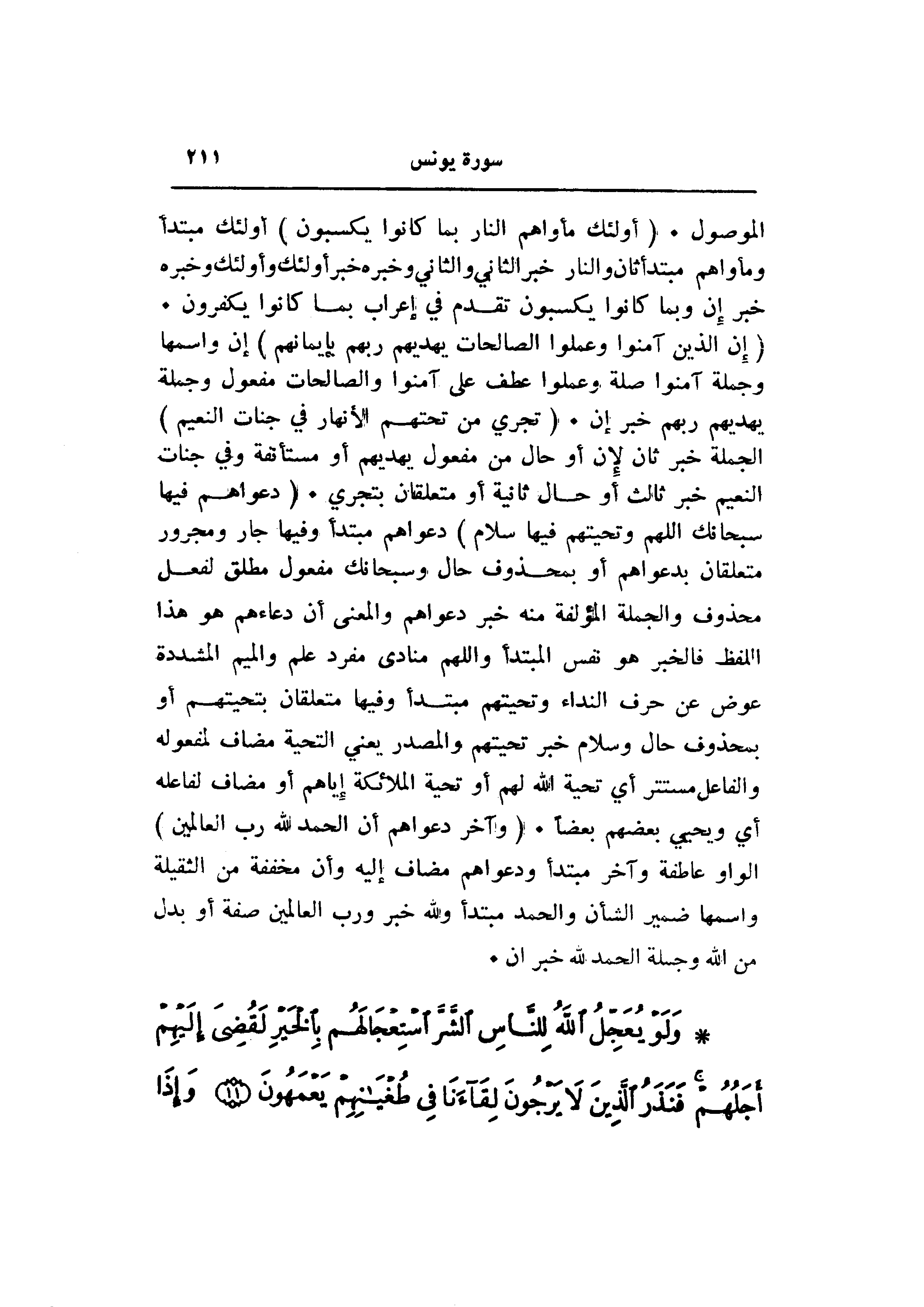 (إِنَّ الَّذِينَ آمَنُوا وَعَمِلُوا الصَّالِحاتِ يَهْدِيهِمْ رَبُّهُمْ بِإِيمانِهِمْ) إن واسمها وجملة آمنوا صلة وعملوا عطف على آمنوا والصالحات مفعول وجملة يهديهم ربهم خبر إن. (تَجْرِي مِنْ تَحْتِهِمُ الْأَنْهارُ فِي جَنَّاتِ النَّعِيمِ) الجملة خبر ثان لإن أو حال من مفعول يهديهم أو مستأنفة وفي جنات النعيم خبر ثالث أو حال ثانية أو متعلقان بتجري. (دَعْواهُمْ فِيها سُبْحانَكَ اللَّهُمَّ وَتَحِيَّتُهُمْ فِيها سَلامٌ) دعواهم مبتدأ وفيها جار ومجرور متعلقان بدعواهم أو بمحذوف حال وسبحانك مفعول مطلق لفعل محذوف والجملة المؤلفة منه خبر دعواهم والمعنى أن دعاءهم هو هذا اللفظ فالخبر هو نفس المبتدأ واللهم منادى مفرد علم والميم المشددة عوض عن حرف النداء وتحيتهم مبتدأ وفيها متعلقان بتحيتهم أو بمحذوف حال وسلام خبر تحيتهم والمصدر يعني التحية مضاف لمفعوله والفاعل مستتر أي تحية الله لهم أو تحية الملائكة إياهم أو مضاف لفاعله أي ويحيي بعضهم بعضا. (وَآخِرُ دَعْواهُمْ أَنِ الْحَمْدُ لِلَّهِ رَبِّ الْعالَمِينَ) الواو عاطفة وآخر مبتدأ ودعواهم مضاف إليه وأن مخففة من الثقيلة واسمها ضمير الشأن والحمد مبتدأ ولله خبر ورب العالمين صفة أو بدل من الله وجملة الحمد لله خبر ان.