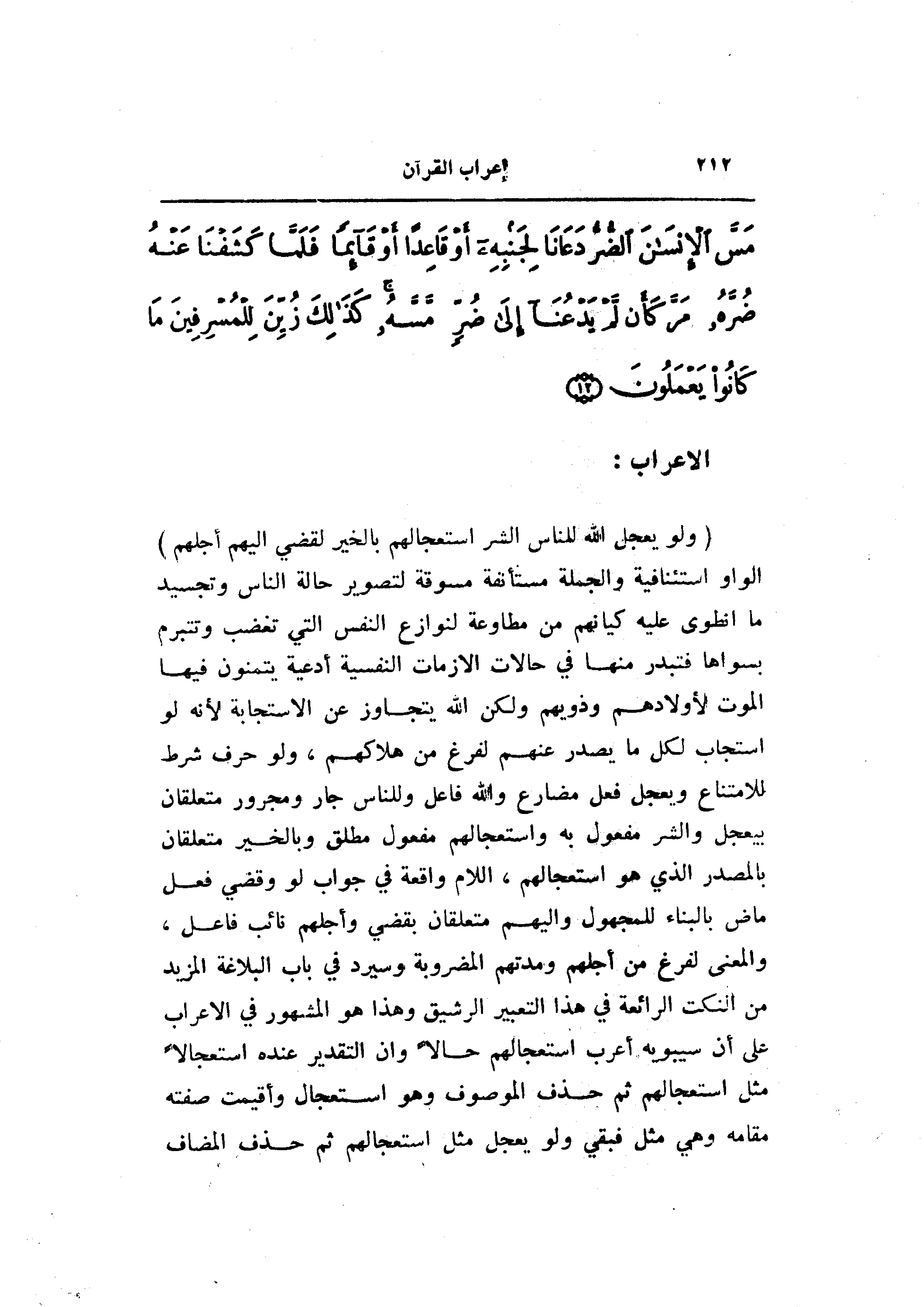(وَلَوْ يُعَجِّلُ اللَّهُ لِلنَّاسِ الشَّرَّ اسْتِعْجالَهُمْ بِالْخَيْرِ لَقُضِيَ إِلَيْهِمْ أَجَلُهُمْ) الواو استئنافية والجملة مستأنفة مسوقة لتصوير حالة الناس وتجسيد ما انطوى عليه كيانهم من مطاوعة لنوازع النفس التي تغضب وتتبرم بسواها فتبدر منها في حالات الأزمات النفسية أدعية يتمنون فيها الموت لأولادهم وذويهم ولكن الله يتجاوز عن الاستجابة لأنه لو استجاب لكل ما يصدر عنهم لفرغ من هلاكهم، ولو حرف شرط للامتناع ويعجل فعل مضارع والله فاعل وللناس جار ومجرور متعلقان بيعجل والشر مفعول به واستعجالهم مفعول مطلق وبالخير متعلقان بالمصدر الذي هو استعجالهم، اللام واقعة في جواب لو وقضي فعل ماض بالبناء للمجهول وإليهم متعلقان بقضي وأجلهم نائب فاعل، والمعنى لفرغ من أجلهم ومدتهم المضروبة وسيرد في باب البلاغة المزيد من النكت الرائعة في هذا التعبير الرشيق وهذا هو المشهور في الاعراب على أن سيبويه أعرب استعجالهم حالا وان التقدير عنده استعجالا مثل استعجالهم ثم حذف الموصوف وهو استعجال وأقيمت صفته مقامه وهي مثل فبقي ولو يعجل مثل استعجالهم ثم حذف المضاف