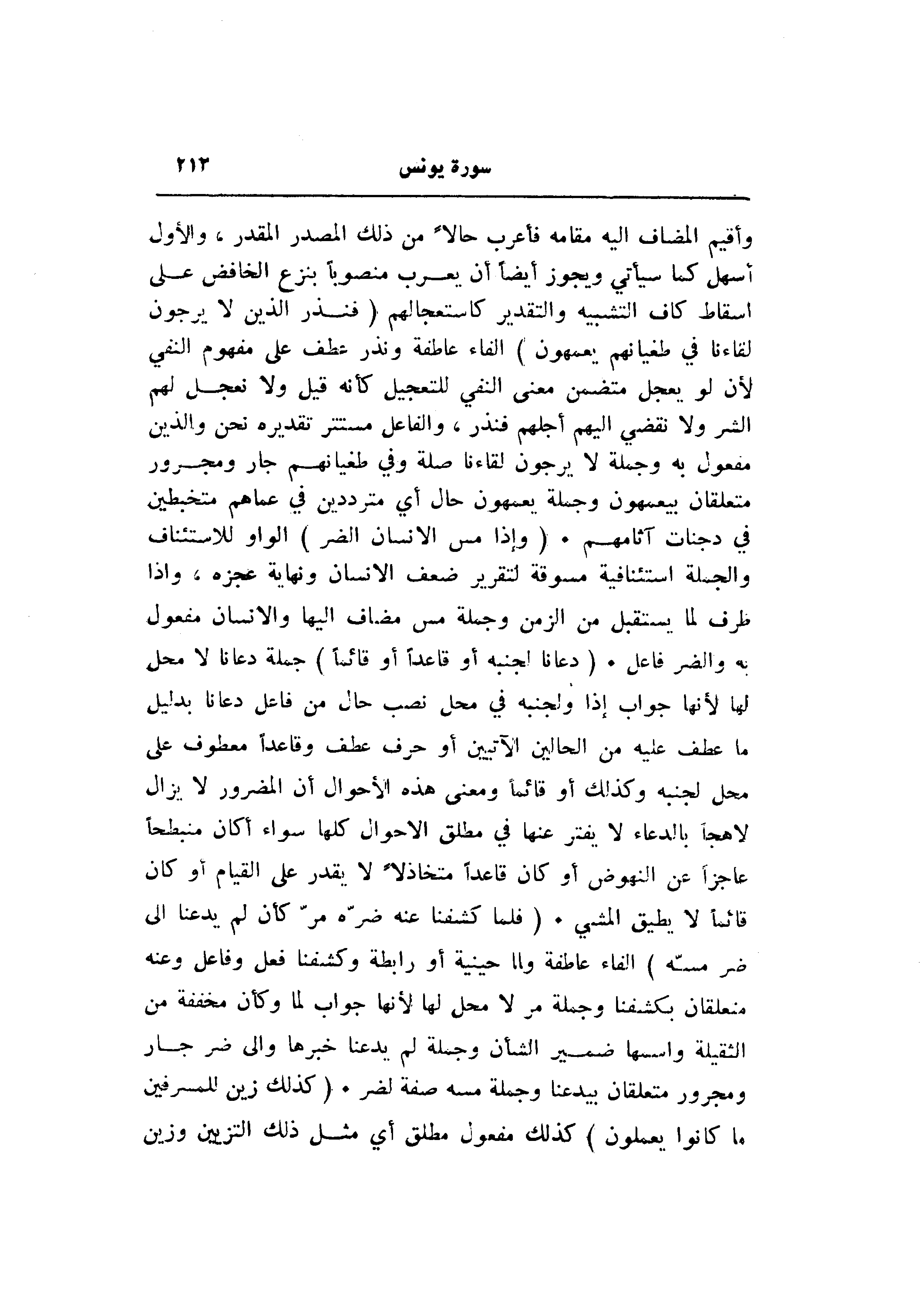 وأقيم المضاف اليه مقامه فأعرب حالا من ذلك المصدر المقدر، والأول أسهل كما سيأتي ويجوز أيضا أن يعرب منصوبا بنزع الخافض على إسقاط كاف التشبيه والتقدير كاستعجالهم (فَنَذَرُ الَّذِينَ لا يَرْجُونَ لِقاءَنا فِي طُغْيانِهِمْ يَعْمَهُونَ) الفاء عاطفة ونذر عطف على مفهوم النفي لأن لو يعجل متضمن معنى النفي للتعجيل كأنه قيل ولا نعجل لهم الشر ولا نقضي إليهم أجلهم فنذر، والفاعل مستتر تقديره نحن والذين مفعول به وجملة لا يرجون لقاءنا صلة وفي طغيانهم جار ومجرور متعلقان بيعمهون وجملة يعمهون حال أي مترددين في عماهم متخبطين في دجنات آثامهم. (وَإِذا مَسَّ الْإِنْسانَ الضُّرُّ) الواو للاستئناف والجملة استئنافية مسوقة لتقرير ضعف الإنسان ونهاية عجزه، وإذا ظرف لما يستقبل من الزمن وجملة مس مضاف إليها والإنسان مفعول به والضر فاعل. (دَعانا لِجَنْبِهِ أَوْ قاعِداً أَوْ قائِماً) جملة دعانا لا محل لها لأنها جواب إذا ولجنبه في محل نصب حال من فاعل دعانا بدليل ما عطف عليه من الحالين الآتيين أو حرف عطف وقاعدا معطوف على محل لجنبه وكذلك أو قائما ومعنى هذه الأحوال أن المضرور لا يزال لاهجا بالدعاء لا يفتر عنها في مطلق الأحوال كلها سواء أكان منبطحا عاجزا عن النهوض أو كان قاعدا متخاذلا لا يقدر على القيام أو كان قائما لا يطيق المشي. (فَلَمَّا كَشَفْنا عَنْهُ ضُرَّهُ مَرَّ كَأَنْ لَمْ يَدْعُنا إِلى ضُرٍّ مَسَّهُ) الفاء عاطفة ولما حينية أو رابطة وكشفنا فعل وفاعل وعنه متعلقان بكشفنا وجملة مر لا محل لها لأنها جواب لما وكأن مخففة من الثقيلة واسمها ضمير الشأن وجملة لم يدعنا خبرها والى ضر جار ومجرور متعلقان بيدعنا وجملة مسه صفة لضر. (كَذلِكَ زُيِّنَ لِلْمُسْرِفِينَ ما كانُوا يَعْمَلُونَ) كذلك مفعول مطلق أي مثل ذلك التزيين وزين