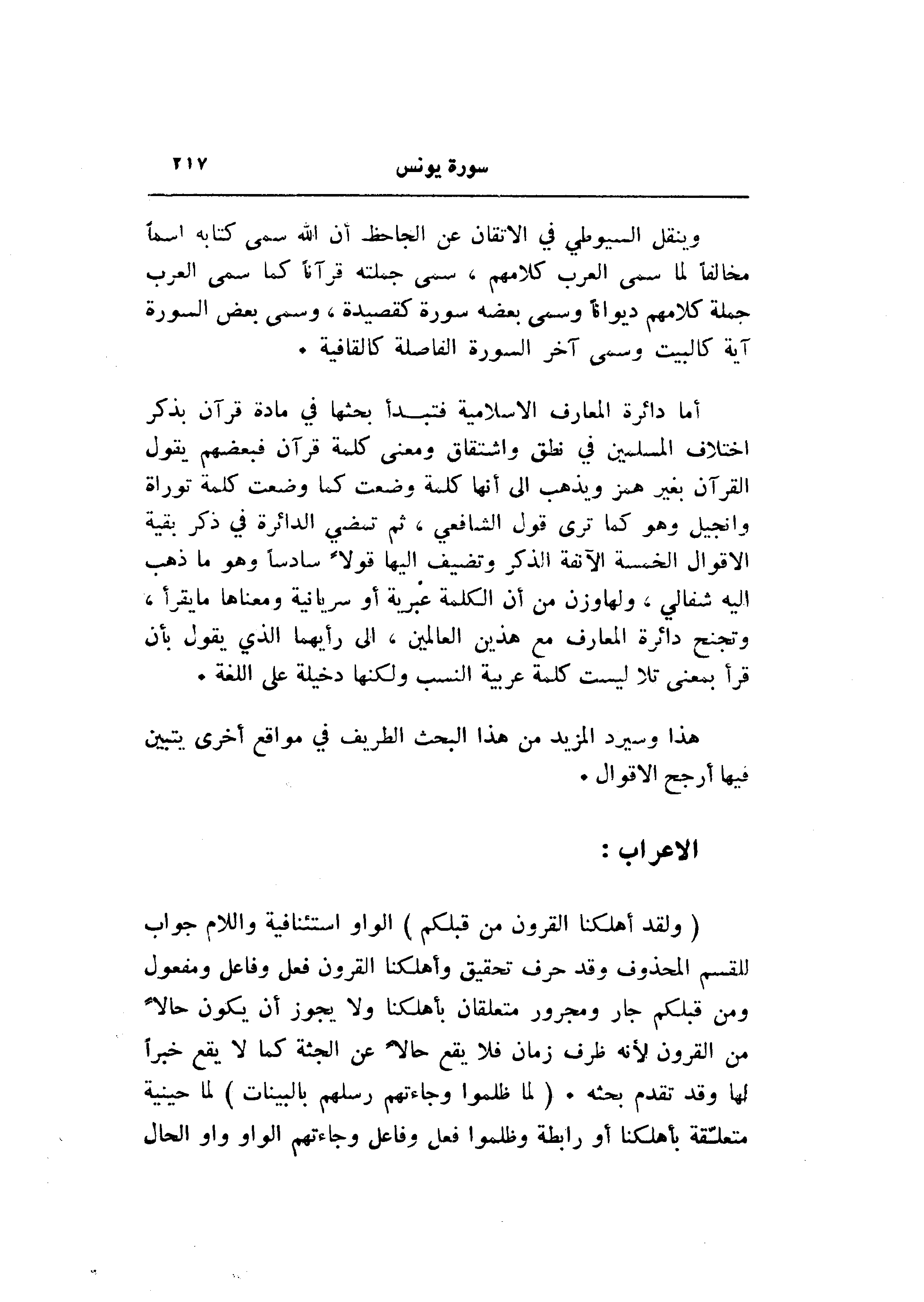 أما دائرة المعارف الاسلامية فتبدأ بحثها في ماده قرآن بذكر اختلاف المسلمين في نطق واشتقاق ومعنى كلمة قرآن فبعضهم يقول القرآن بغير همز ويذهب الى أنها كلمة وضعت كما وضعت كلمة توراة وإنجيل وهو كما ترى قول الشافعي، ثم تمضي الدائرة في ذكر بقية الأقوال الخمسة الآنفة الذكر وتضيف إليها قولا سادسا وهو ما ذهب اليه شفالي، ولهاوزن من أن الكلمة عبرية أو سريانية ومعناها ما يقرأ، وتجنح دائرة المعارف مع هذين العالمين، الى رأيهما الذي يقول بأن قرأ بمعنى تلا ليست كلمة عربية النسب ولكنها دخيلة على اللغة.
