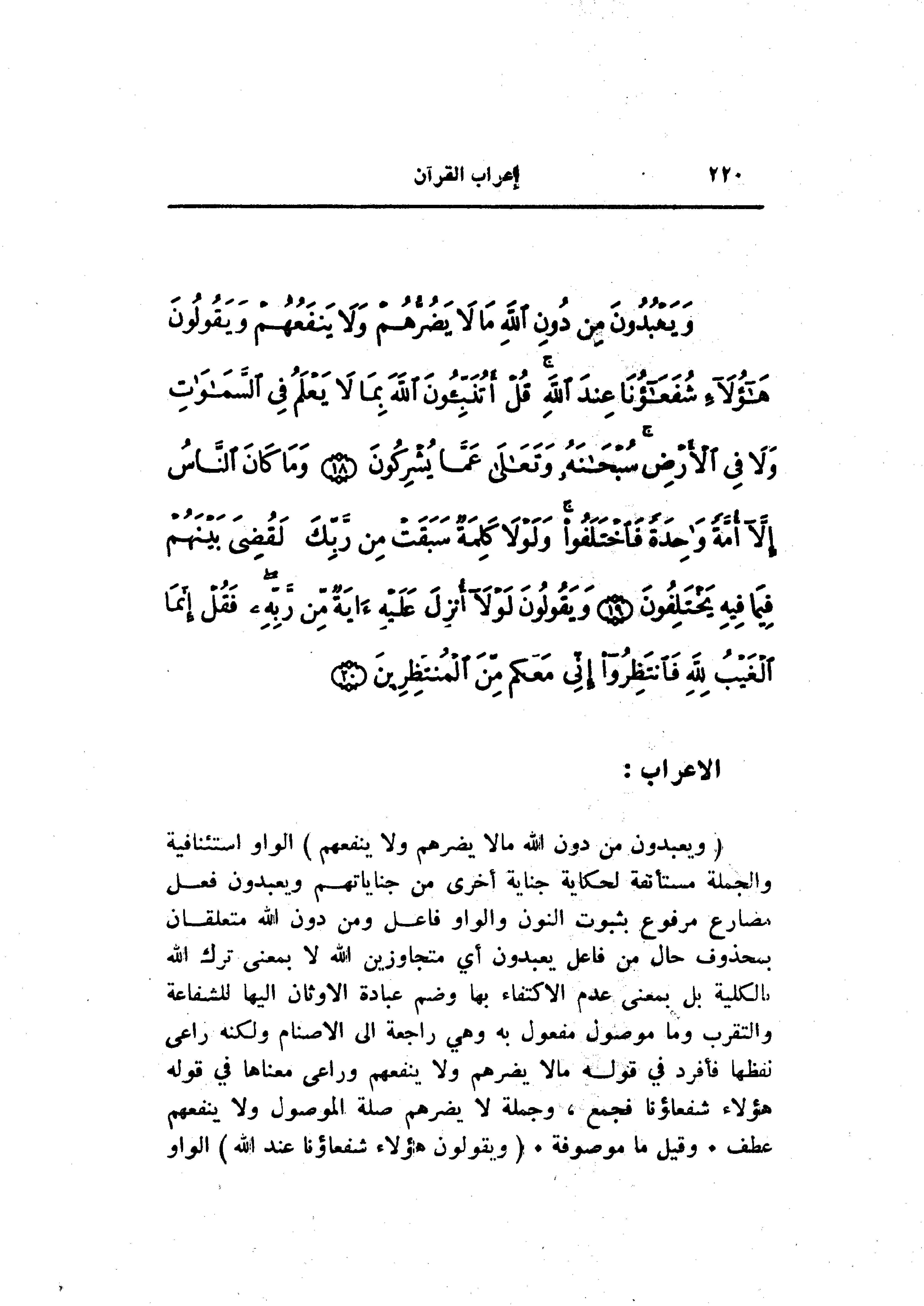 (وَيَعْبُدُونَ مِنْ دُونِ اللَّهِ ما لا يَضُرُّهُمْ وَلا يَنْفَعُهُمْ) الواو استئنافية والجملة مستأنفة لحكاية جناية أخرى من جناياتهم ويعبدون فعل مضارع مرفوع بثبوت النون والواو فاعل ومن دون الله متعلقان بمحذوف حال من فاعل يعبدون أي متجاوزين الله لا بمعنى ترك الله بالكلية بل بمعنى عدم الاكتفاء بها وضم عبادة الأوثان إليها للشفاعة والتقرب وما موصول مفعول به وهي راجعة الى الأصنام ولكنه راعى لفظها فأفرد في قوله ما لا يضرهم ولا ينفعهم وراعى معناها في قوله هؤلاء شفعاؤنا فجمع، وجملة لا يضرهم صلة الموصول ولا ينفعهم عطف. وقيل ما موصوفة. (وَيَقُولُونَ هؤُلاءِ شُفَعاؤُنا عِنْدَ اللَّهِ) الواو